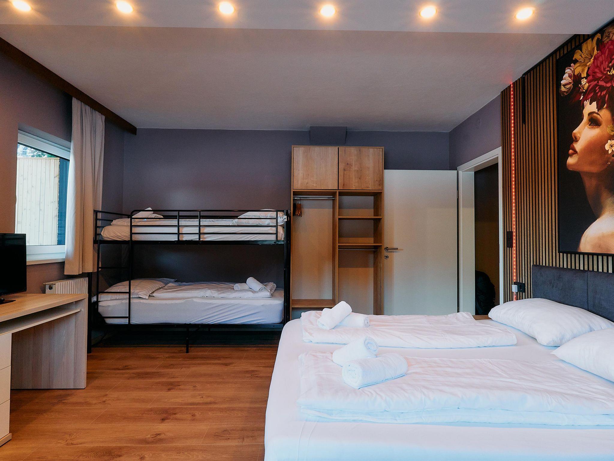 Dich erwartet ein Apartment mit einem Doppelbett sowie einem Stockbett, Küche, Badezimmer und einem Balkon.