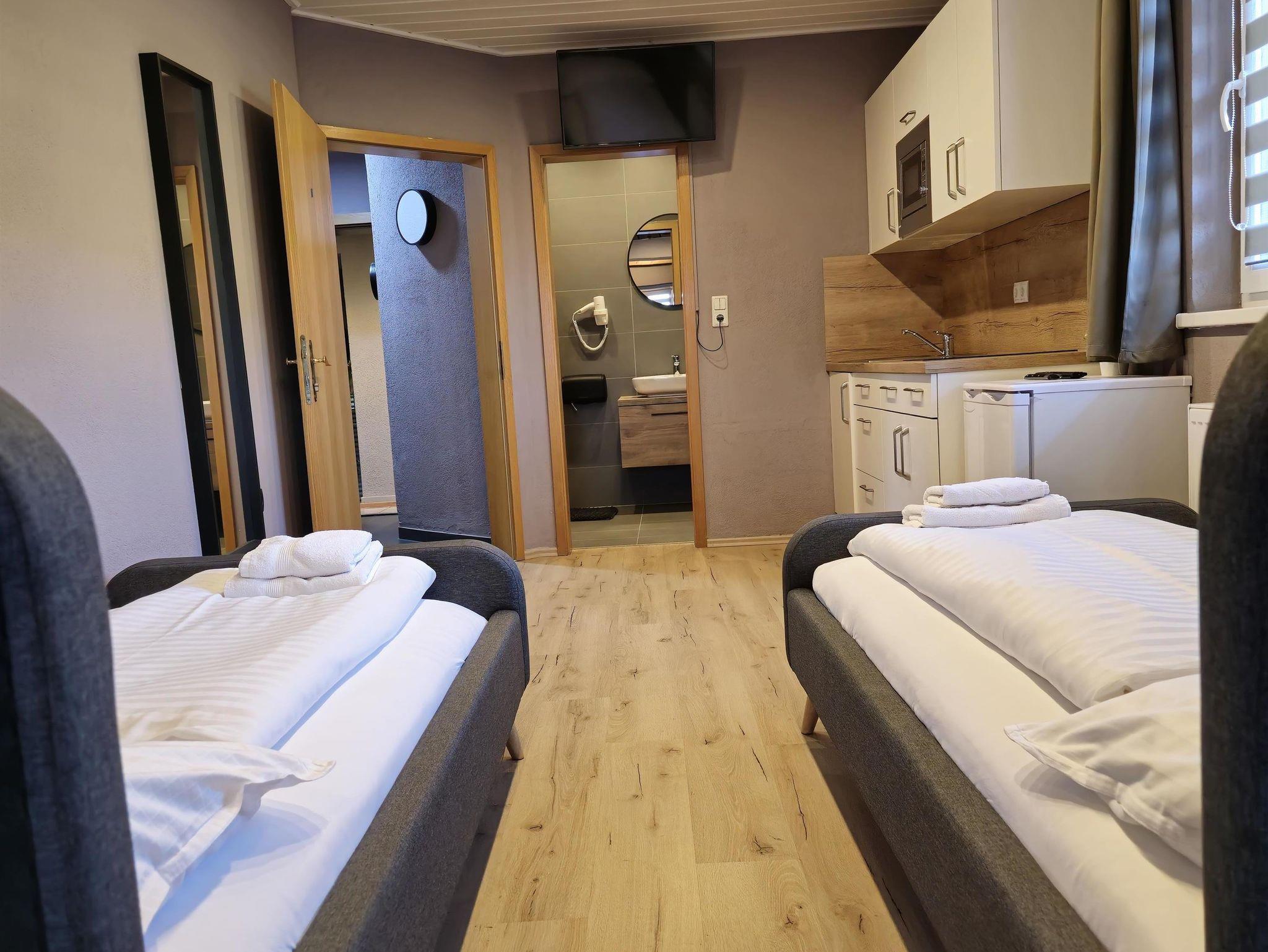 Dich erwartet ein Studio, mit einem Doppelbett und Einzelbett. Außerdem hat das Studio eine eigene Küche, ein Badezimmer sowie eine Balkon.