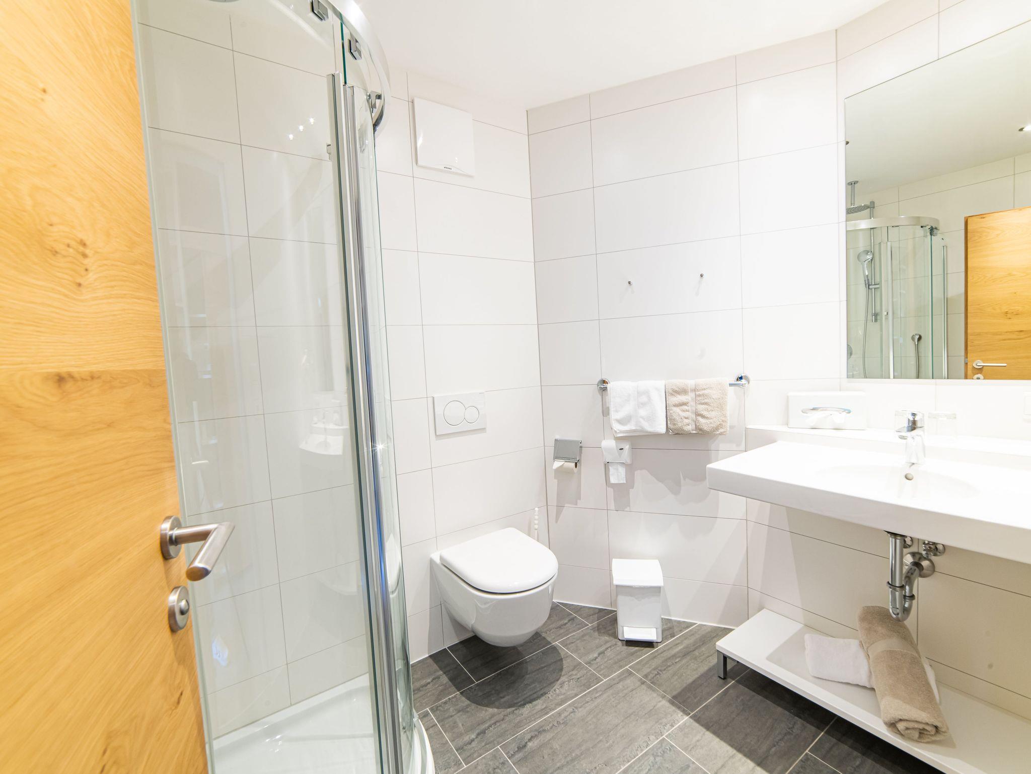 • Haarfön, Kosmetikspiegel und flauschige Handtücher