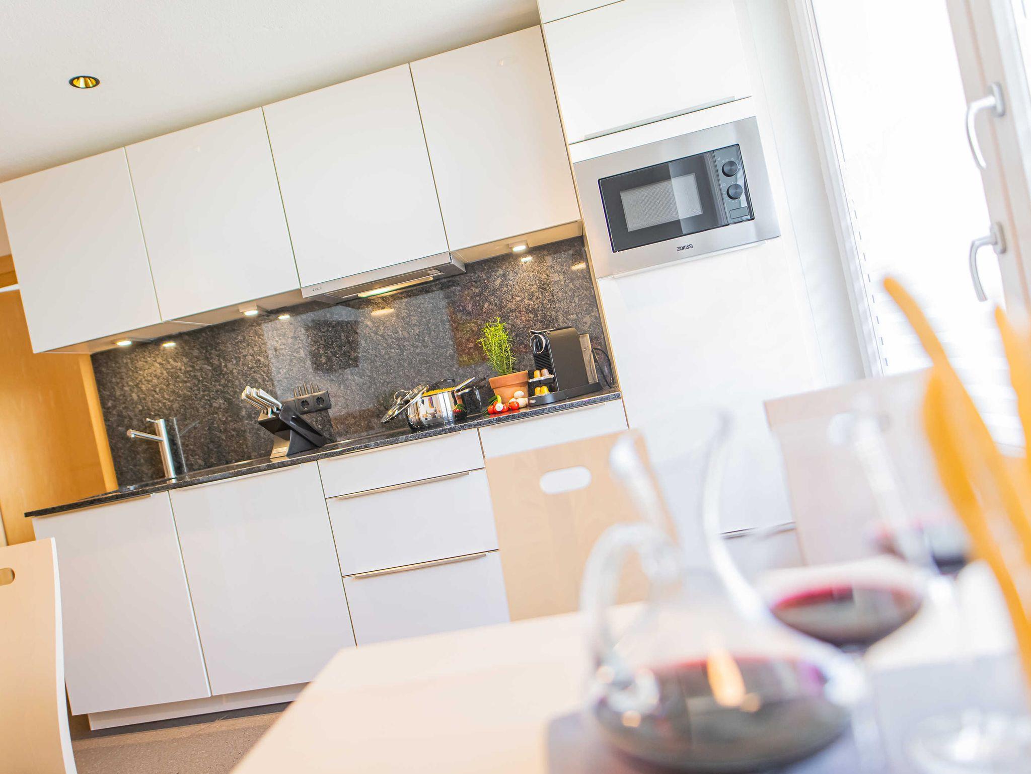 • vollausgestatte Kochnische mit Ceran-Kochfeld, Kühlschrank mit Gefrierfach, Geschirrspüler, Mikrowelle, Tap-Kaffeemaschine, Wasserkocher, Toaster und vielem mehr