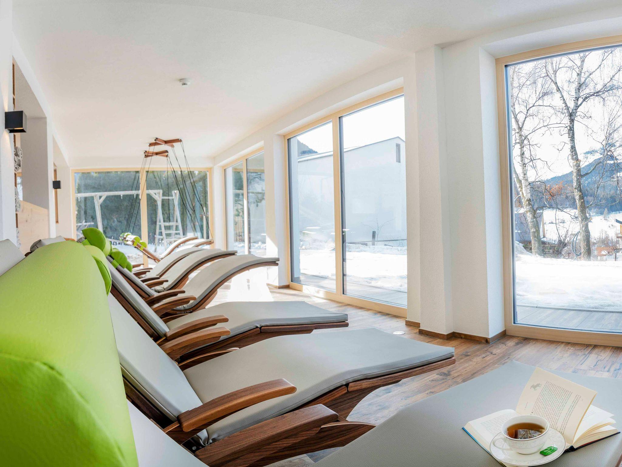 Ein feiner Wohlfühlbereich mit Sauna, Infrarotkabine, Teebar, Panoramaruheraum mit Entspannungsliegen und Relax-Liegwiese für wohltuende Momente.