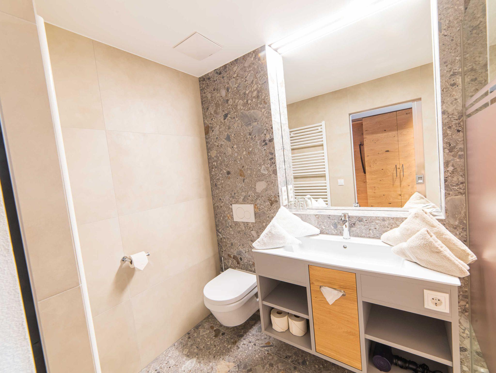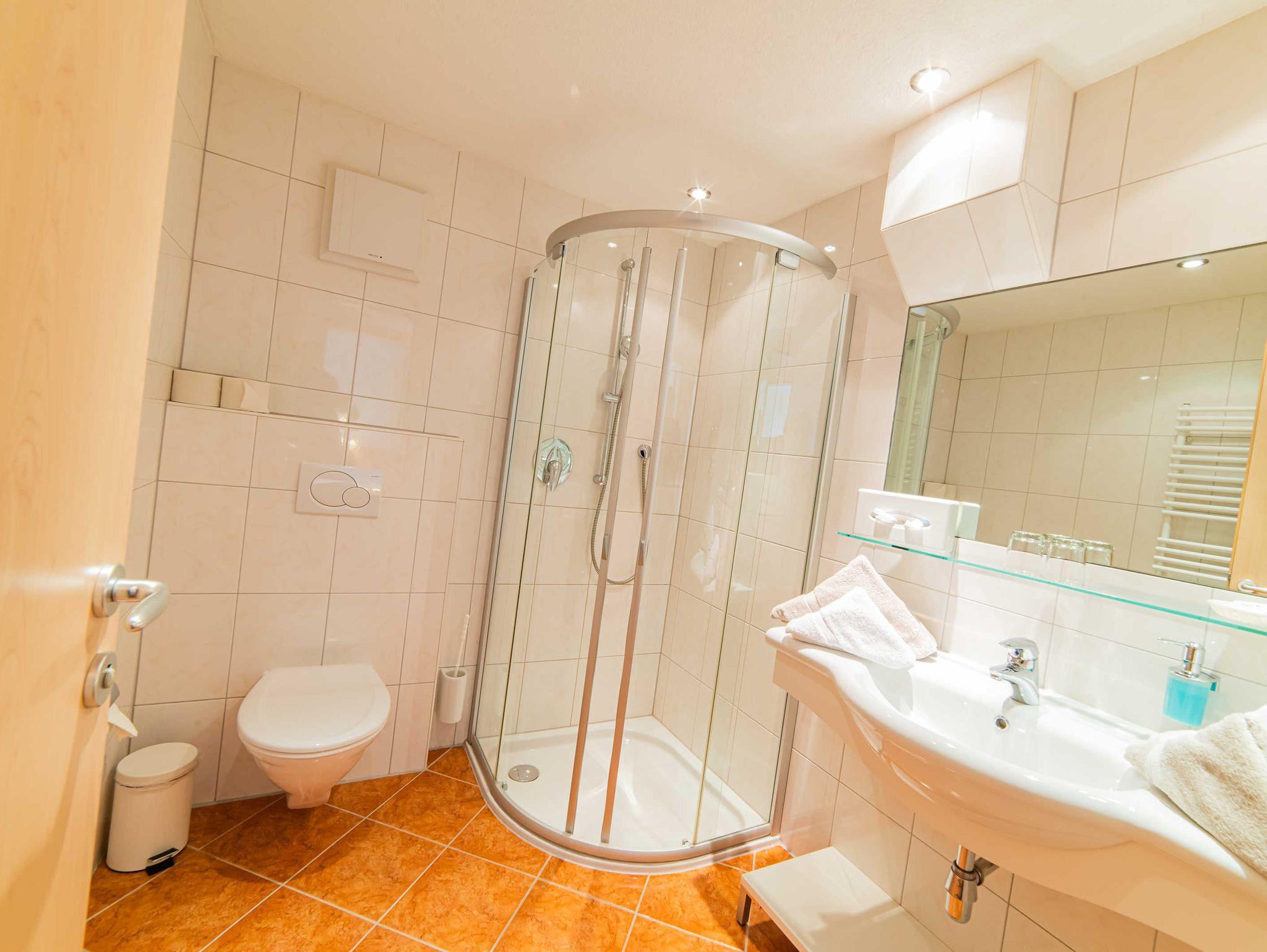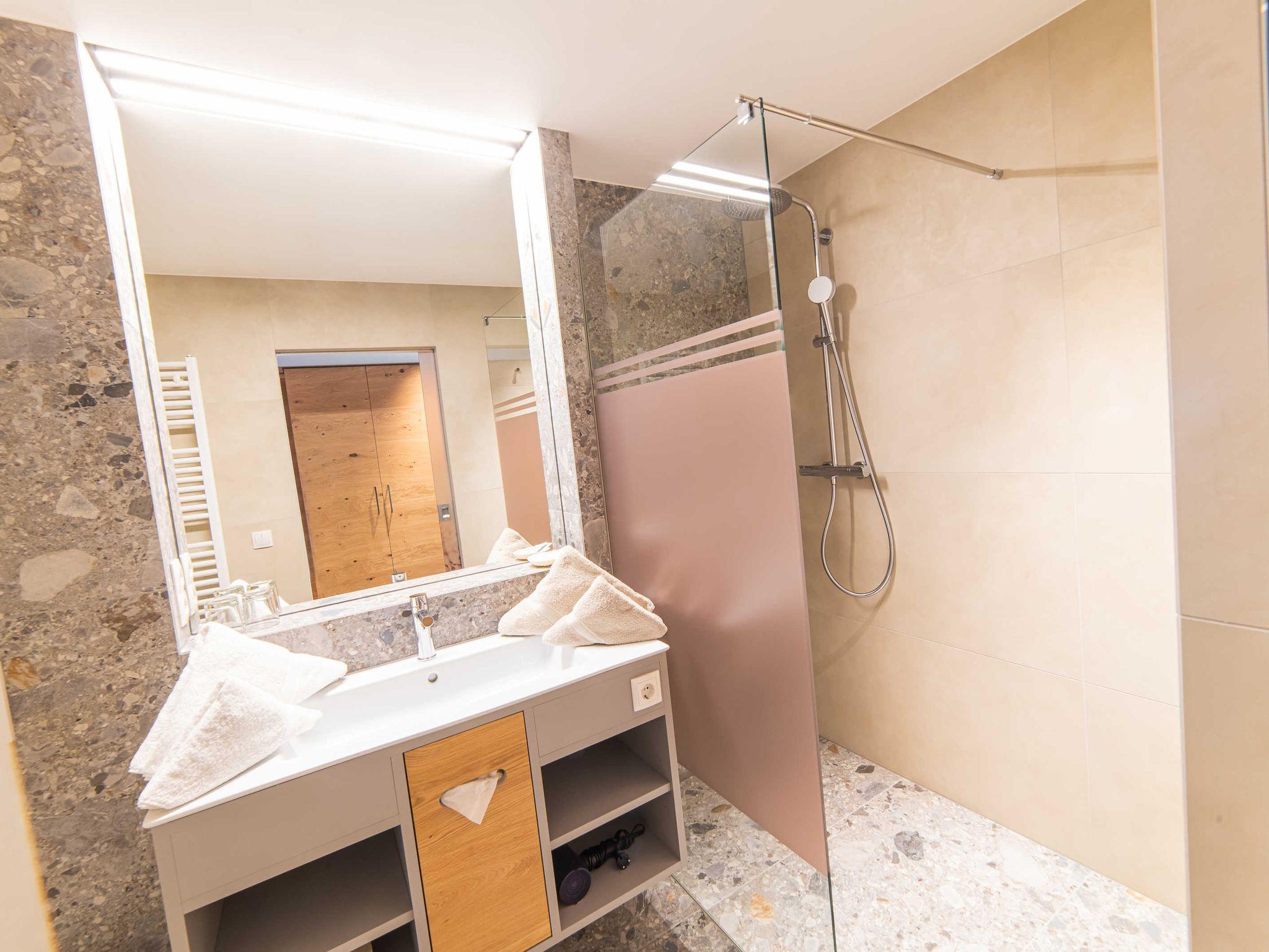• Badezimmer mit Waschbecken, begehbarer Dusche und WC