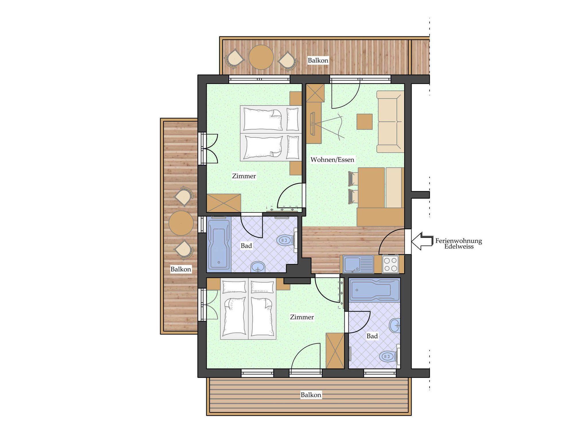 Unsere neuerbaute Ferienwohnung Edelweiss im Dachgeschoss ist gemütlich und komfortabel eingerichtet und besticht vor allem durch ihre 3 Balkone nach Westen, Osten und Süden und Rundumpanorama auf die Berge!