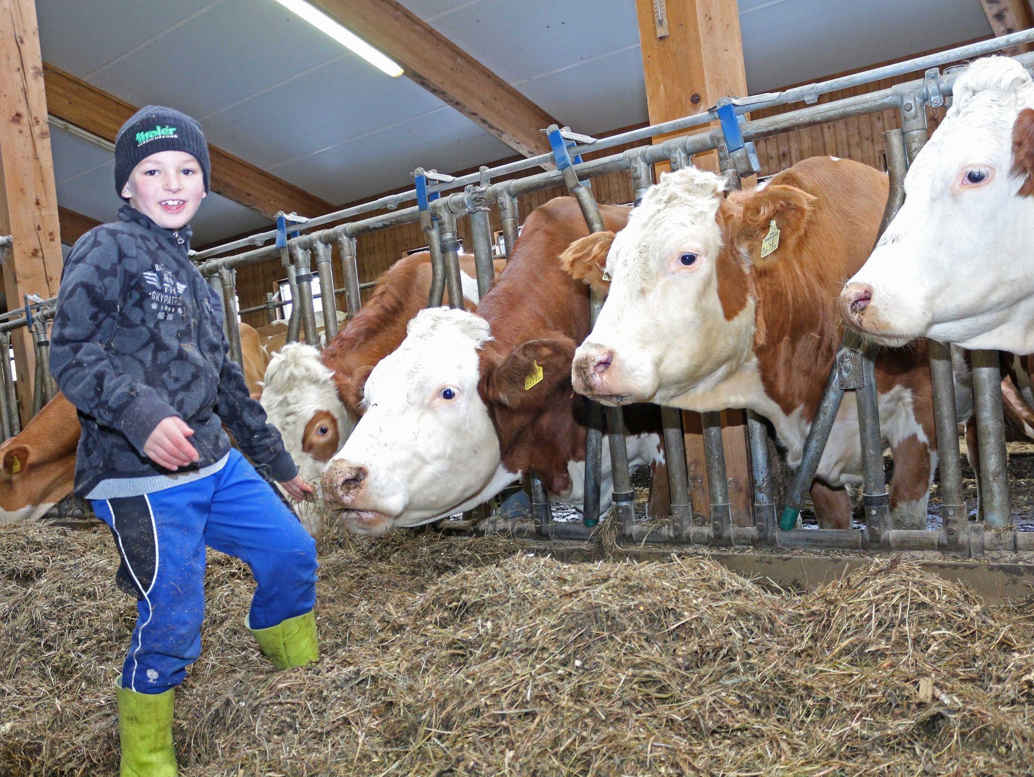 Besuch der Kühe und Kälber im Stall, Kaninchen und Hühner füttern, die Katzen streicheln und im Sommer Pony reiten.