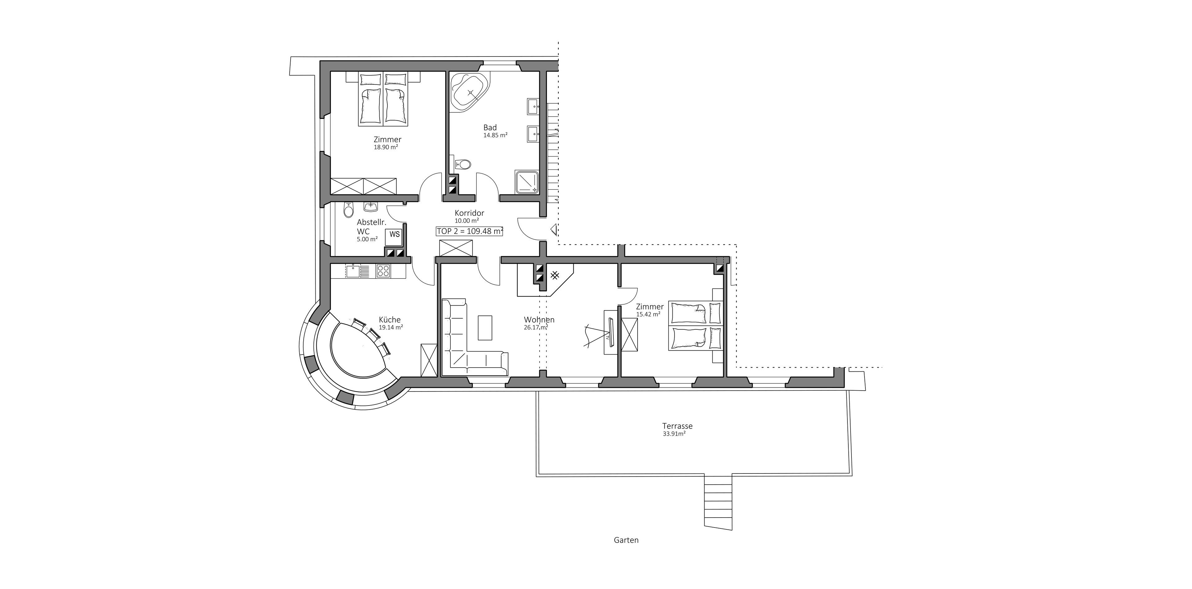- Wohn-/Schlafzimmer, 26 m², 2 Personen