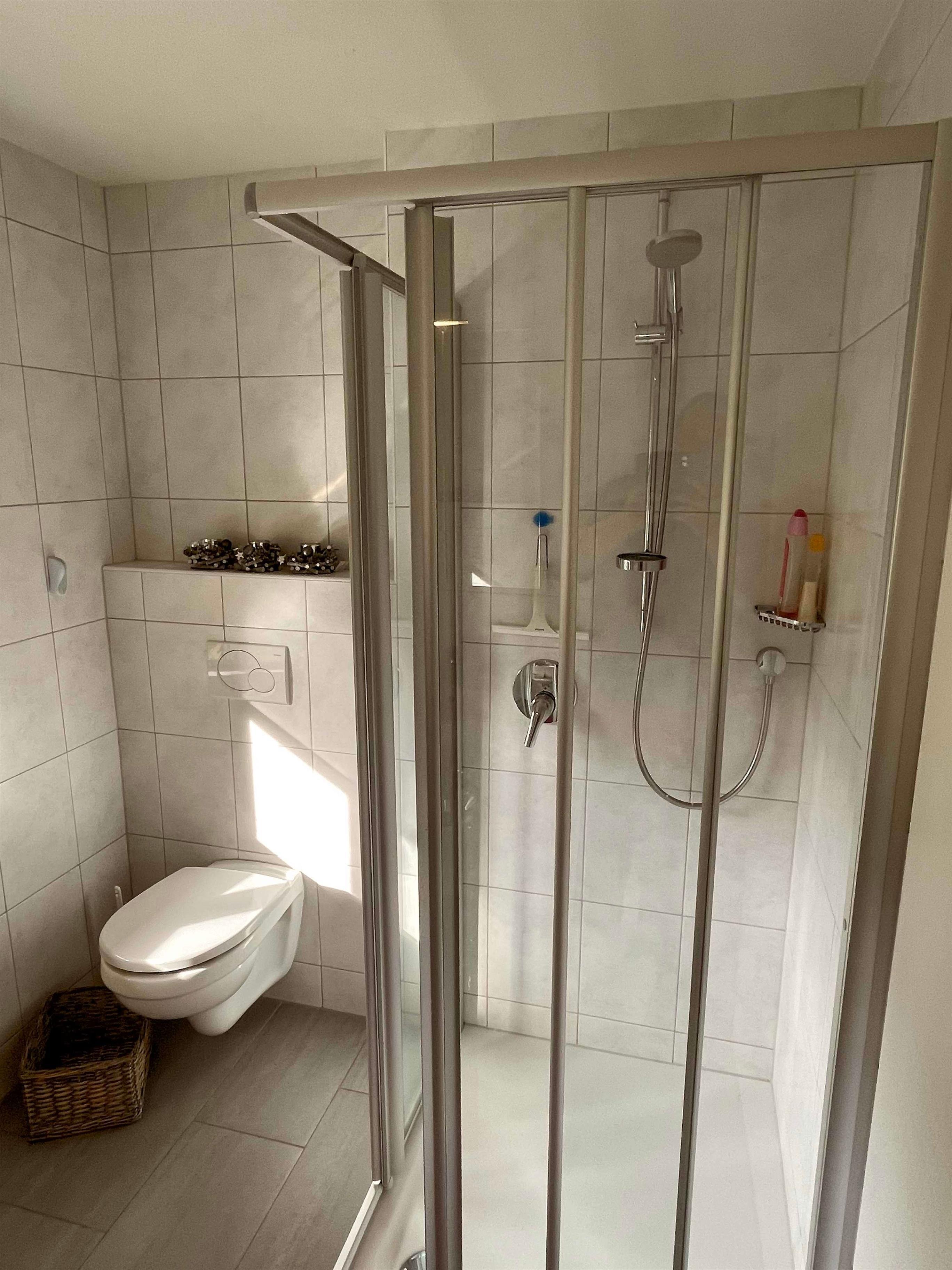 Ein Bad mit Dusche vervollständigen diese wunderschöne Wohnung.