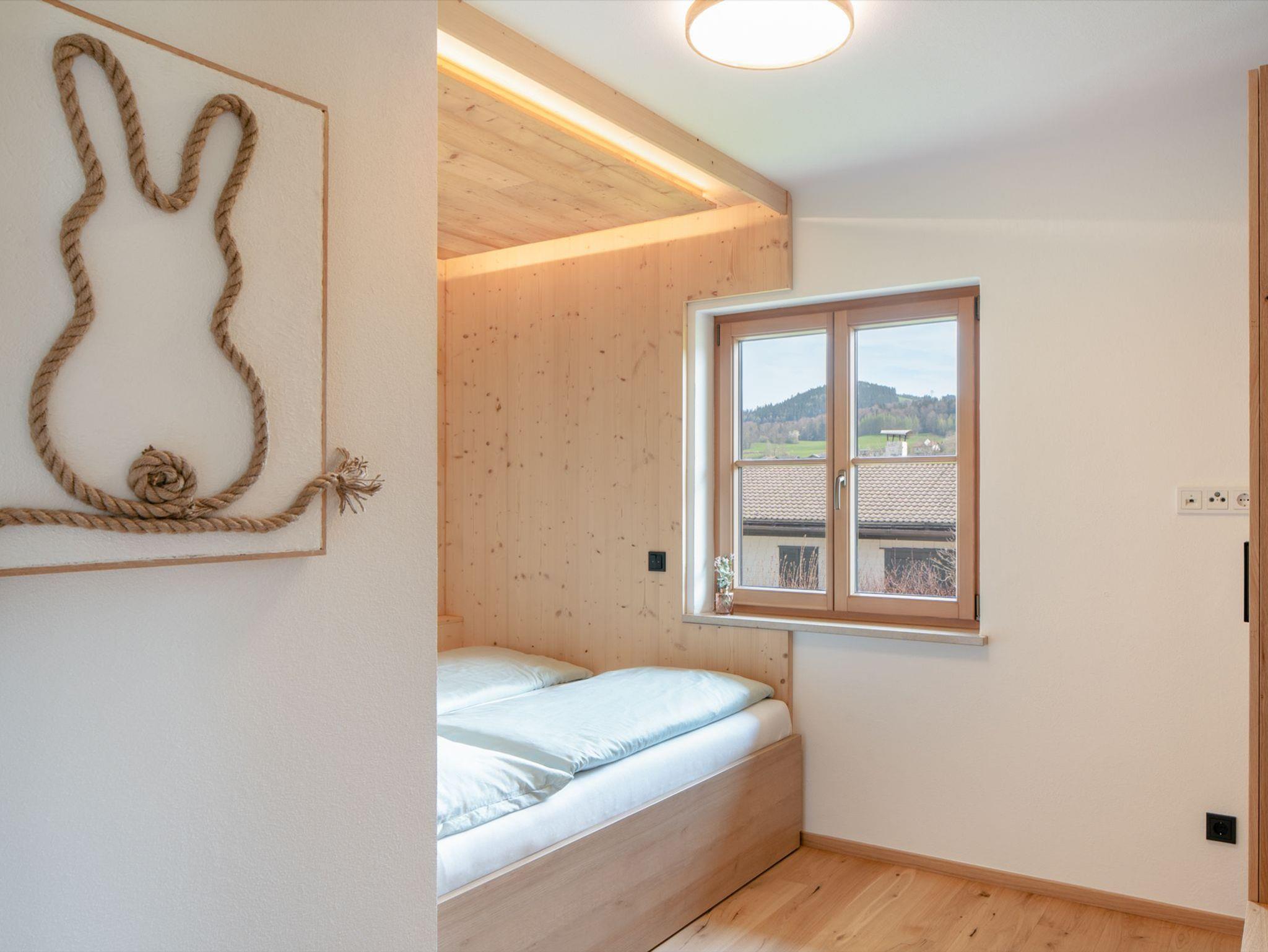 Das zweite Schlafzimmer, ideal als Kinderzimmer genutzt, ist kompakt und clever eingerichtet. Es verfügt über ein Ausziehbett, das in eine edle Fichtenholz-Schlafnische integriert ist. So entsteht eine gemütliche und funktionale Schlafgelegenheit in diesem Raum.