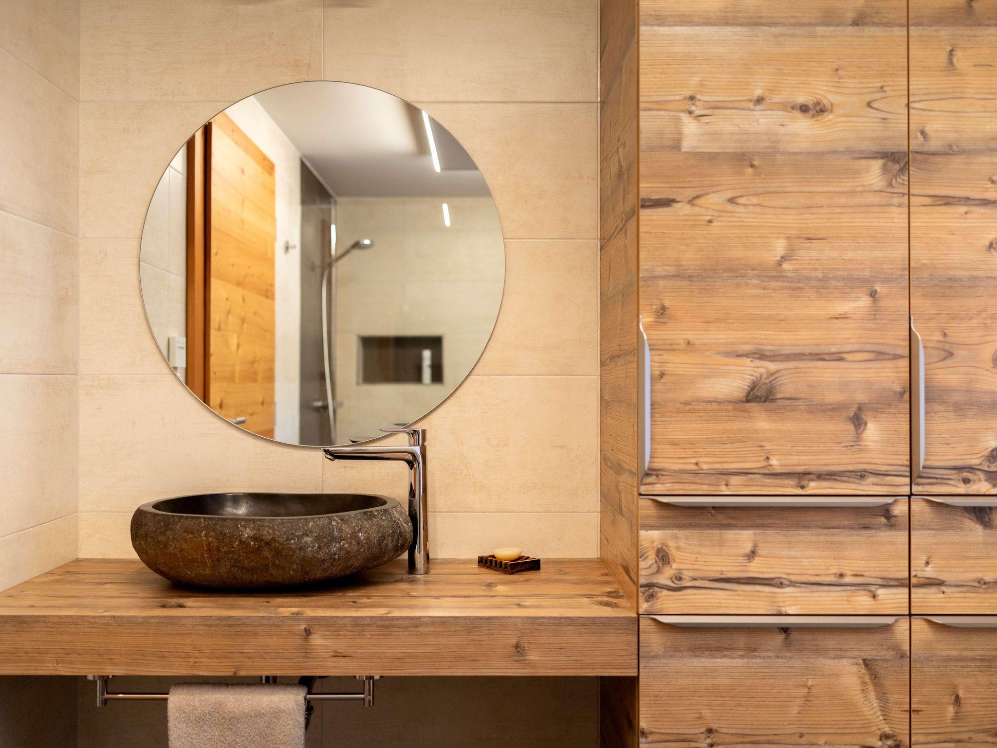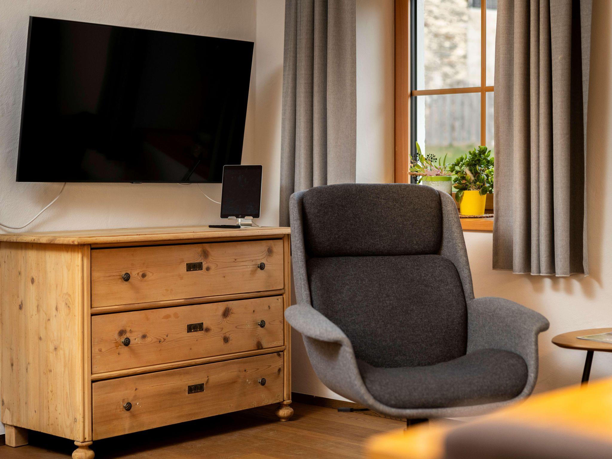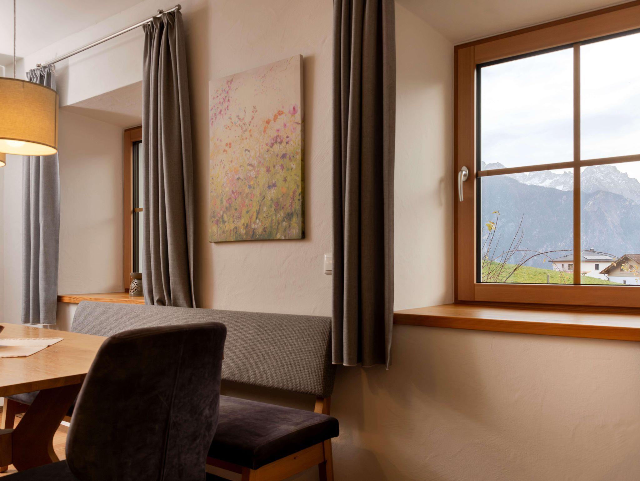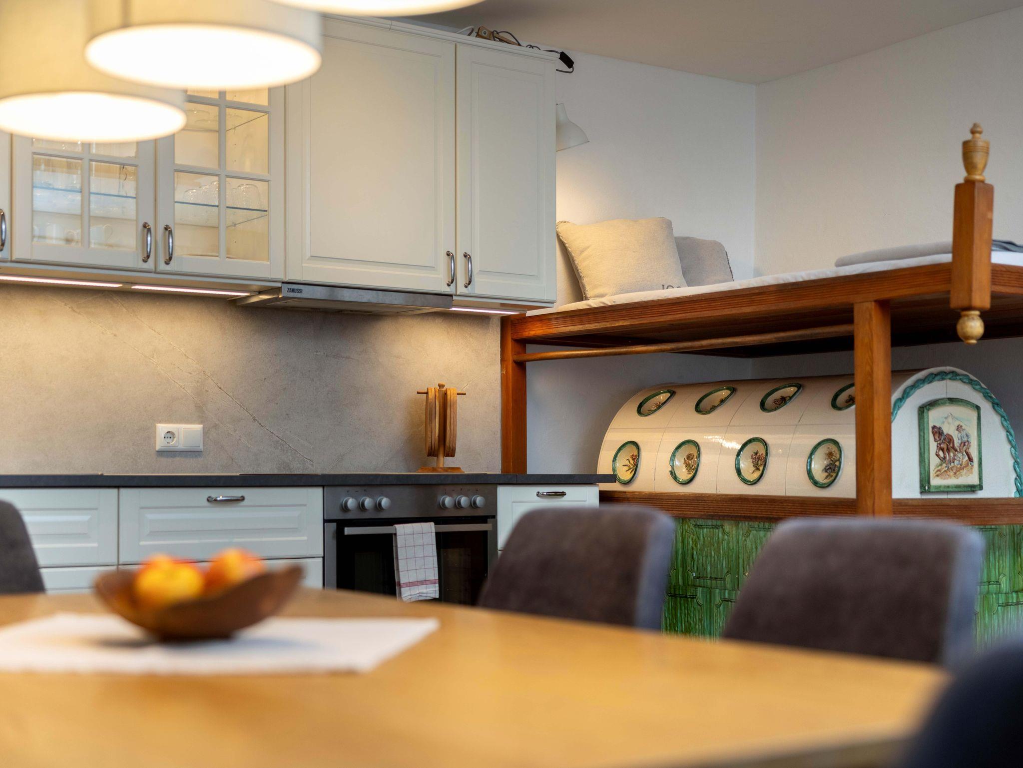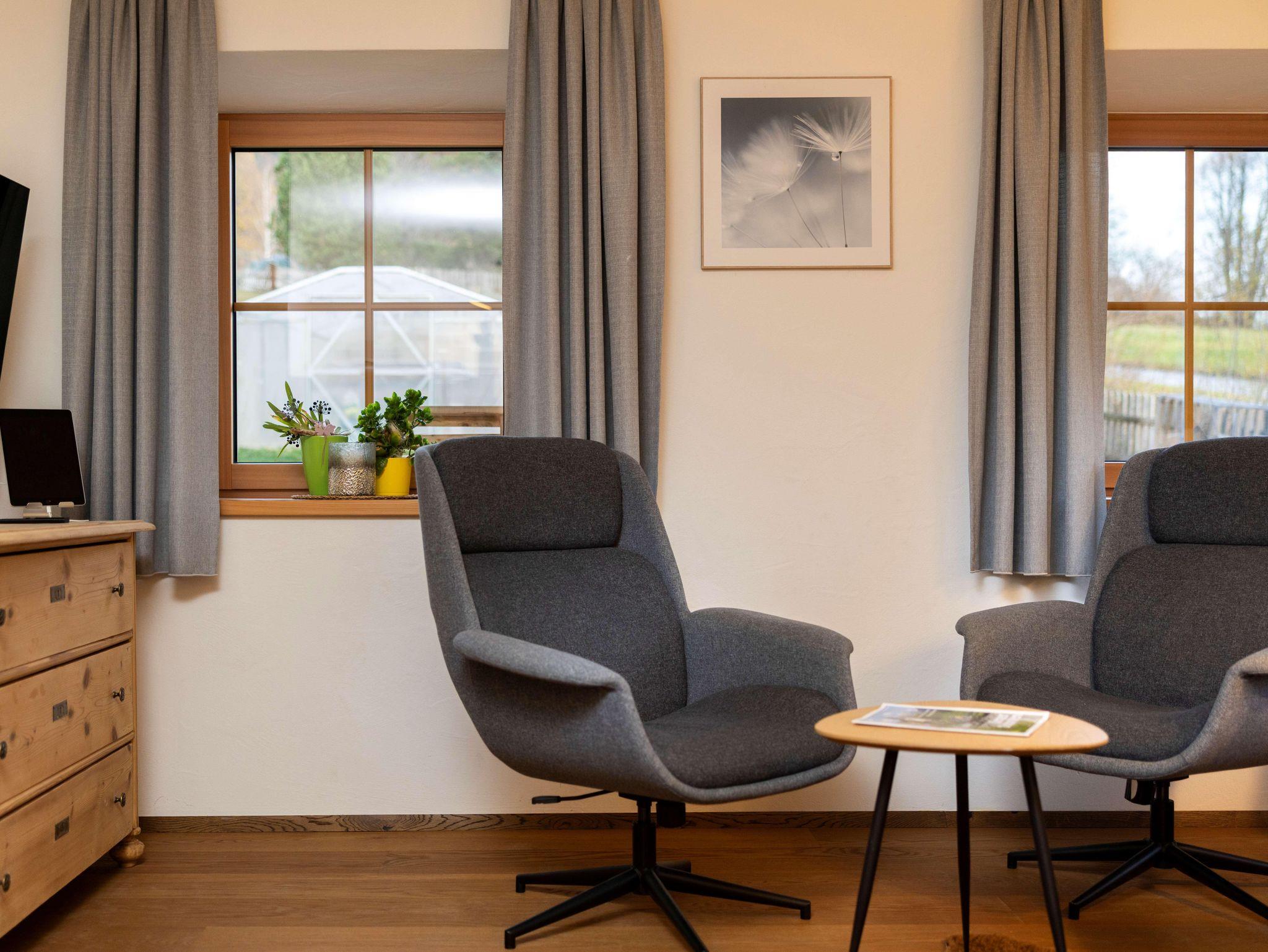 Die Wohnung hat einen eigenen Hauseingang, davor befindet sich eine gemütliche Terrasse, die gerne genutzt werden darf. Bei der Ausstattung der Wohnung wurde großer Wert auf Beständigkeit und Regionalität gelegt. So findet sich in den Zimmern eine massive Eichendiele, die metallfreien Betten und Kommoden wurden von einem Tischler aus der Region gefertigt.