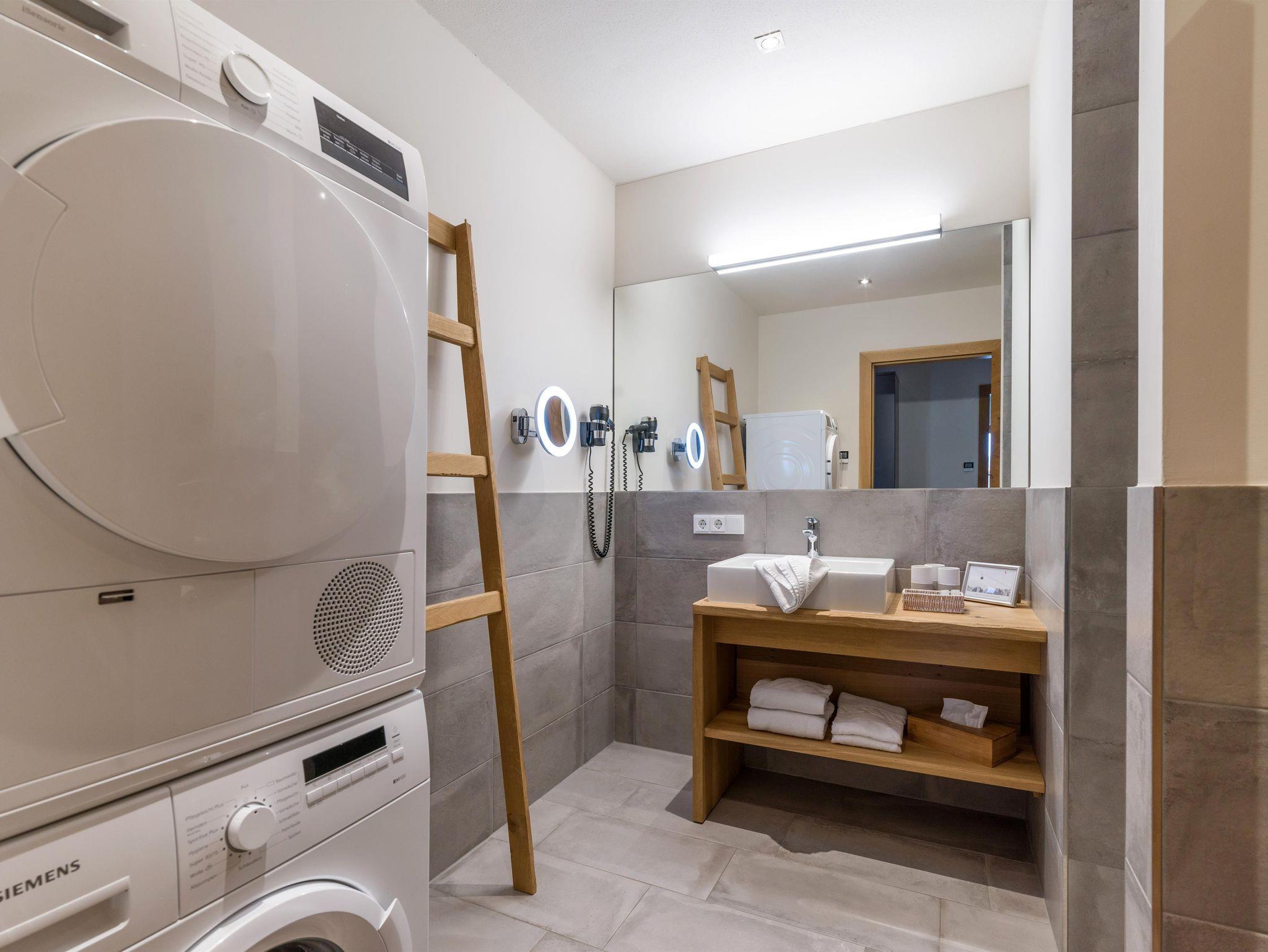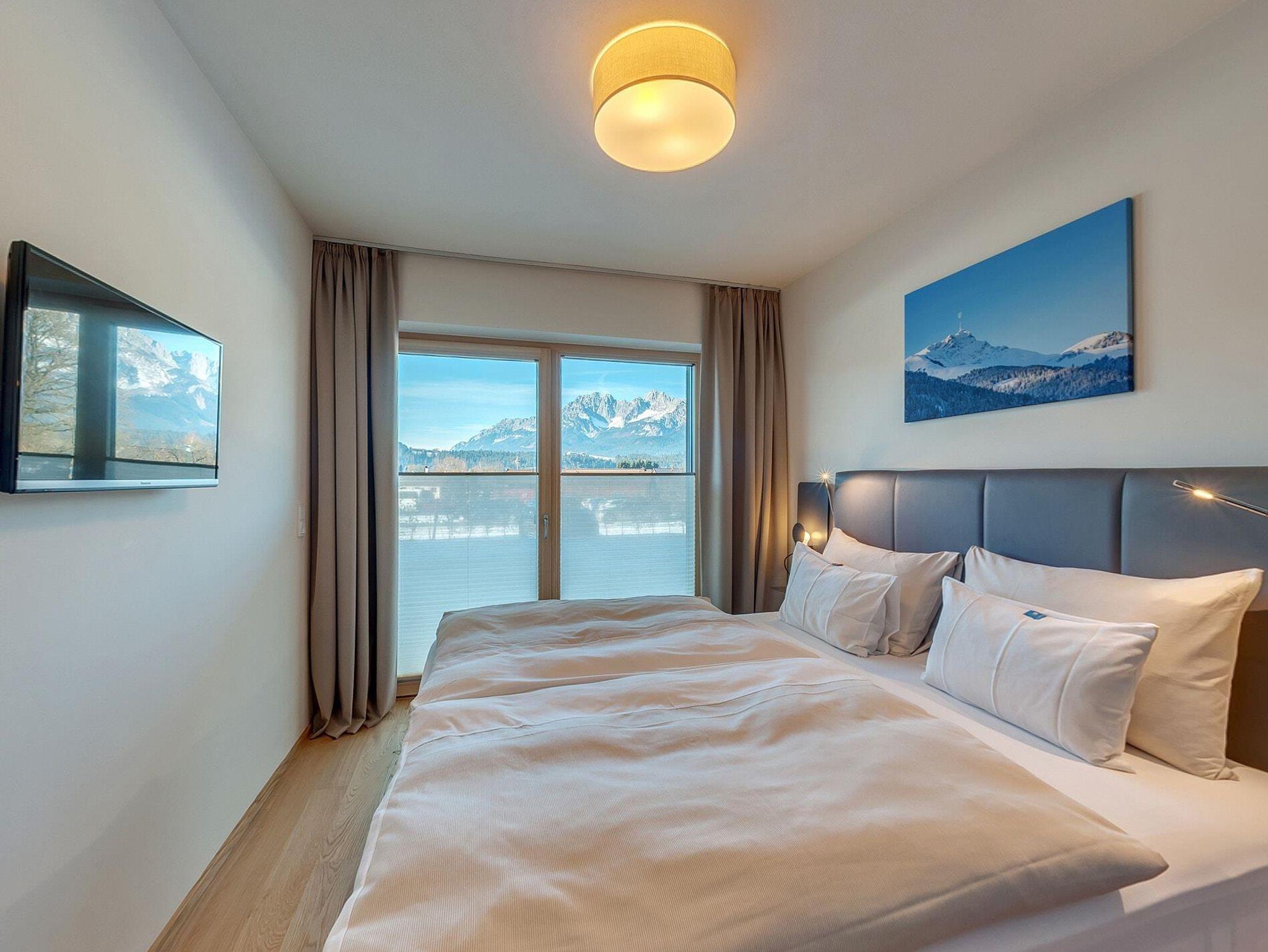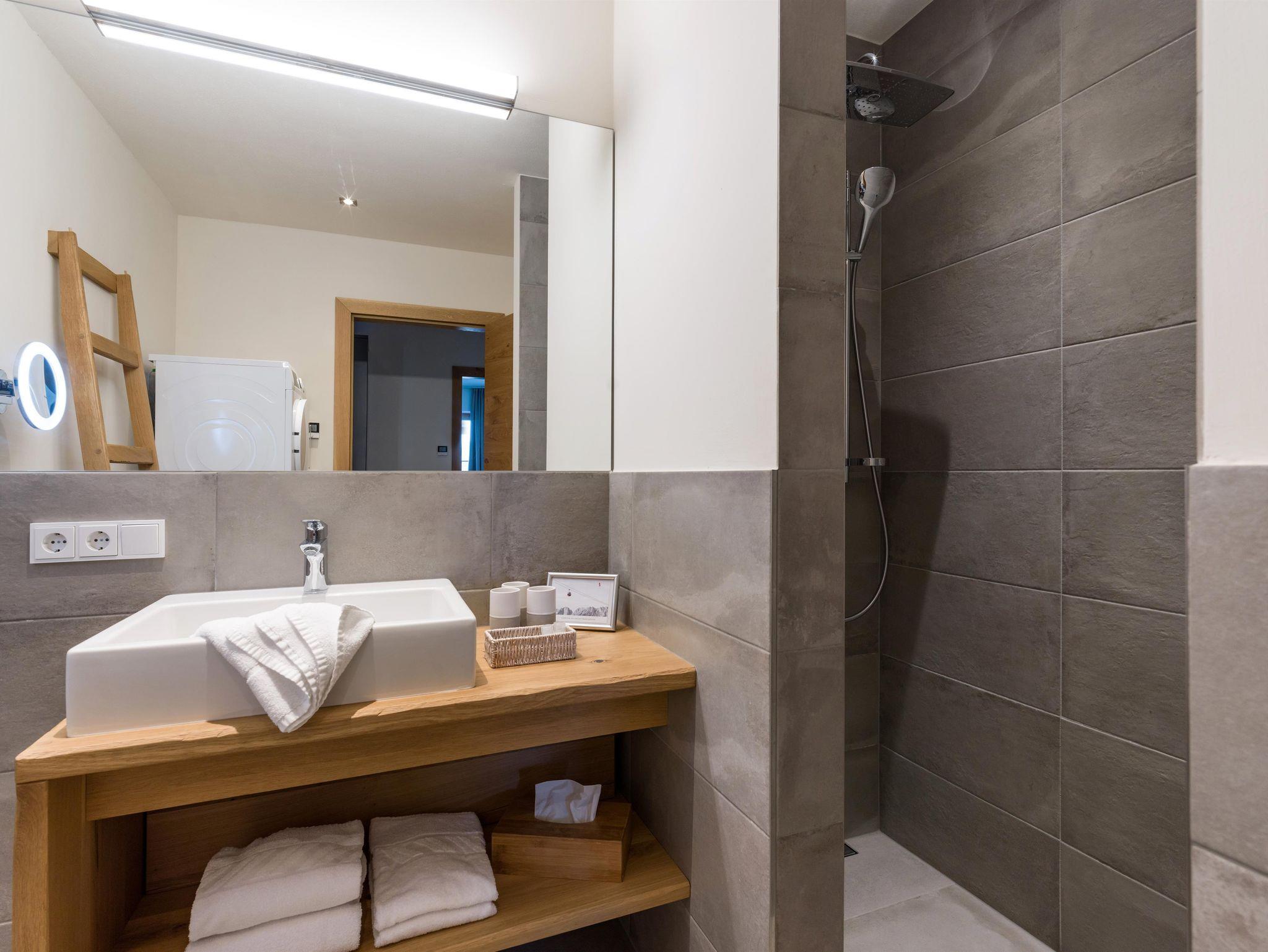 Die Natur Suite im EG hat 65 qm. Sie bietet 2 Schlafzimmer mit Boxspringbetten und HD-TV, Fliegengitter und Verdunkelung. Die 2 Bäder haben eine Regendusche, WC, Fön und Kosmetikspiegel. Waschmschine und Trockner. Das Wohnzimmer hat ein qualitativ-hochwertiges Schlaf-Sofa und HD-TV. Die Küche ist ausgestattet mit Backofen, Kühlschrank mit Tiefkühlfach, Geschirrspüler, Mikrowelle, Nespresso Kaffeemaschine. Der Balkon ist mit Blick auf den Wilden Kaiser. Es gibt WLAN, Parkplatz und einen Skiraum. In dieser Ferienwohnung sind Hunde herzlich willkommen (gegen Gebühr).