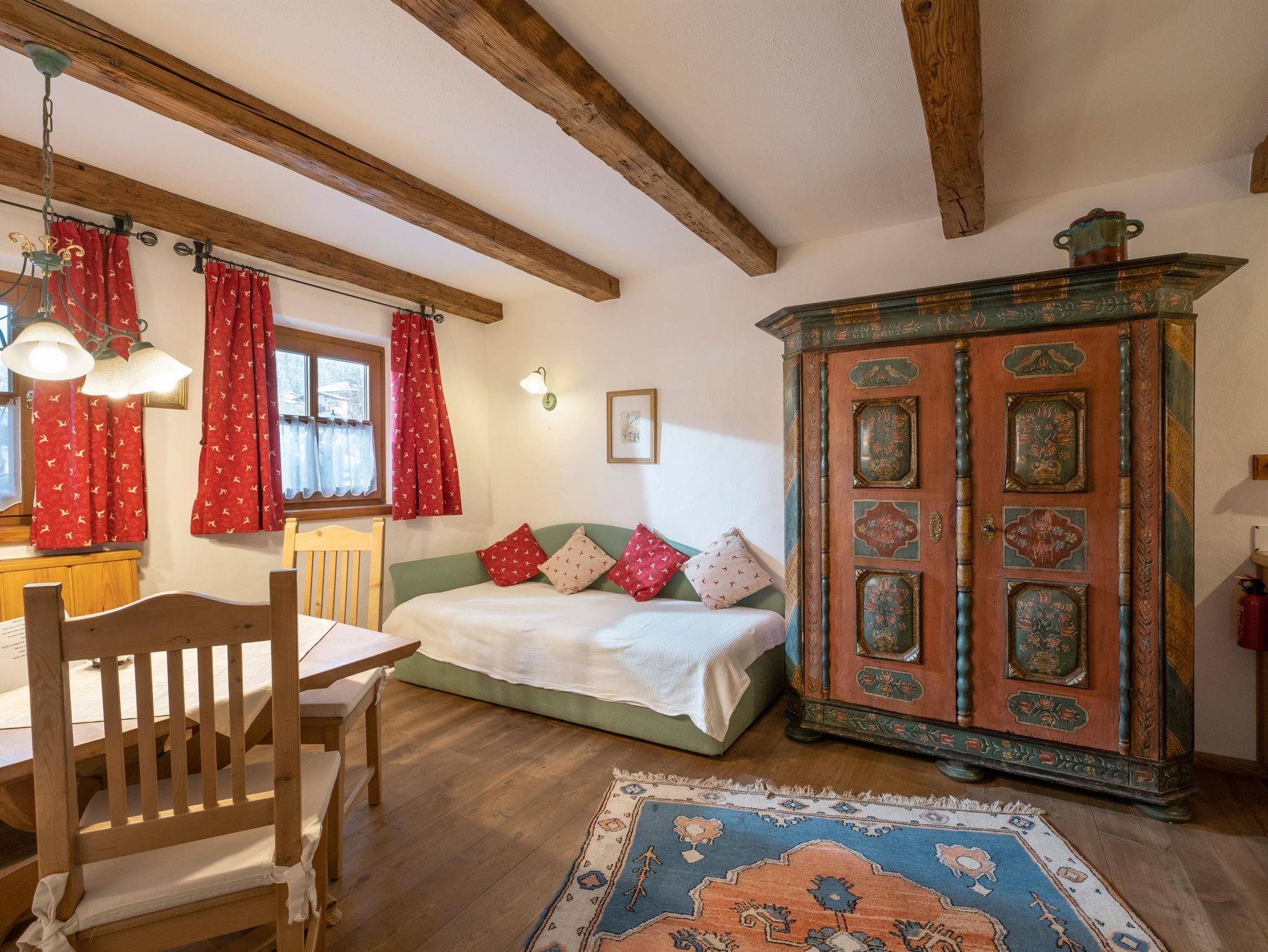 Es erwartet Sie ein gemütlicher Wohnraum im Erdgeschoss mit hochwertigen Altholzmöbeln, einer modernen Ausstattung, Kachelofen mit Elektroheizung und Flat TV. Die Sitzecke in der Wohnküche lädt zum Verweilen ein. Hier befindet sich auch das Schlafsofa für zwei Personen. Über die Treppe gelangen Sie ins Untergeschoss. Dort befinden sich ein geräumiges Schlafzimmer sowie Badezimmer.