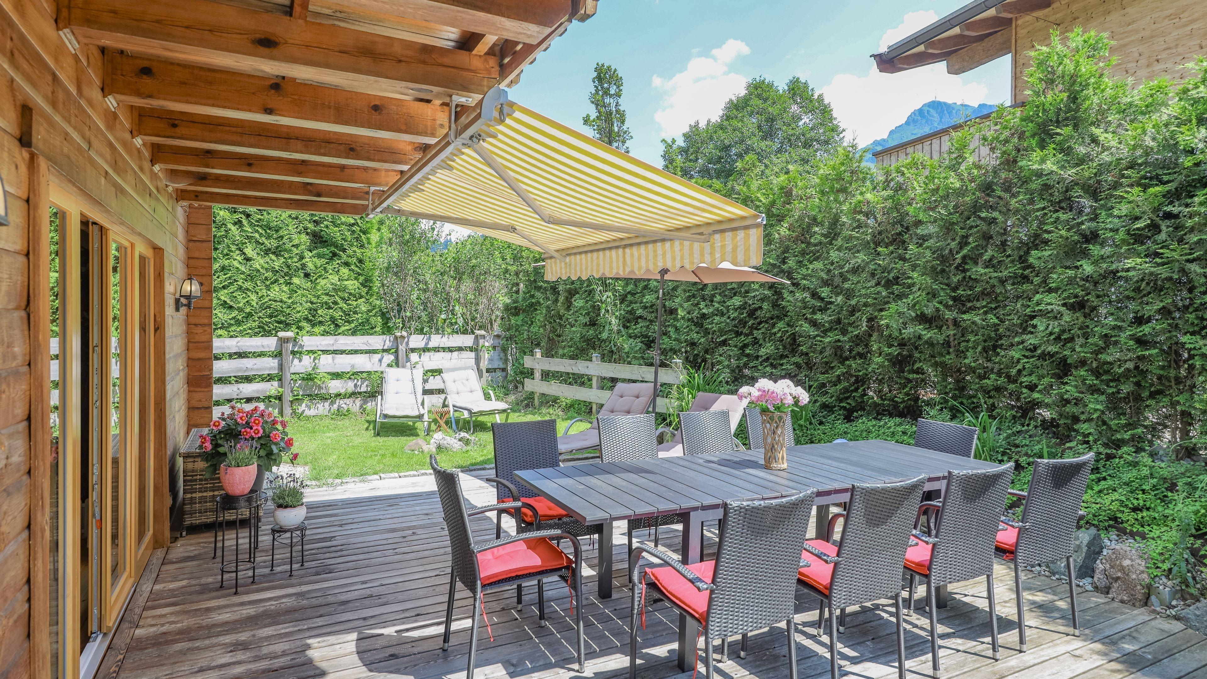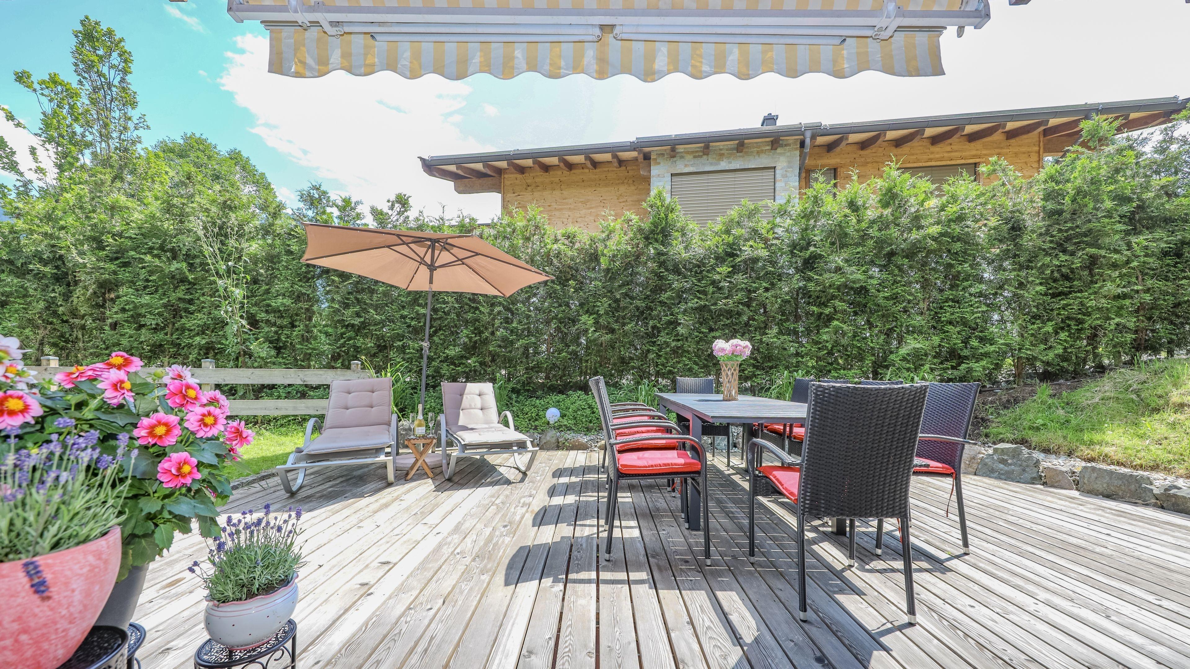 ? Genieße die Natur in unserem 5000 m² großen Garten mit traumhafter Aussicht auf die Berge