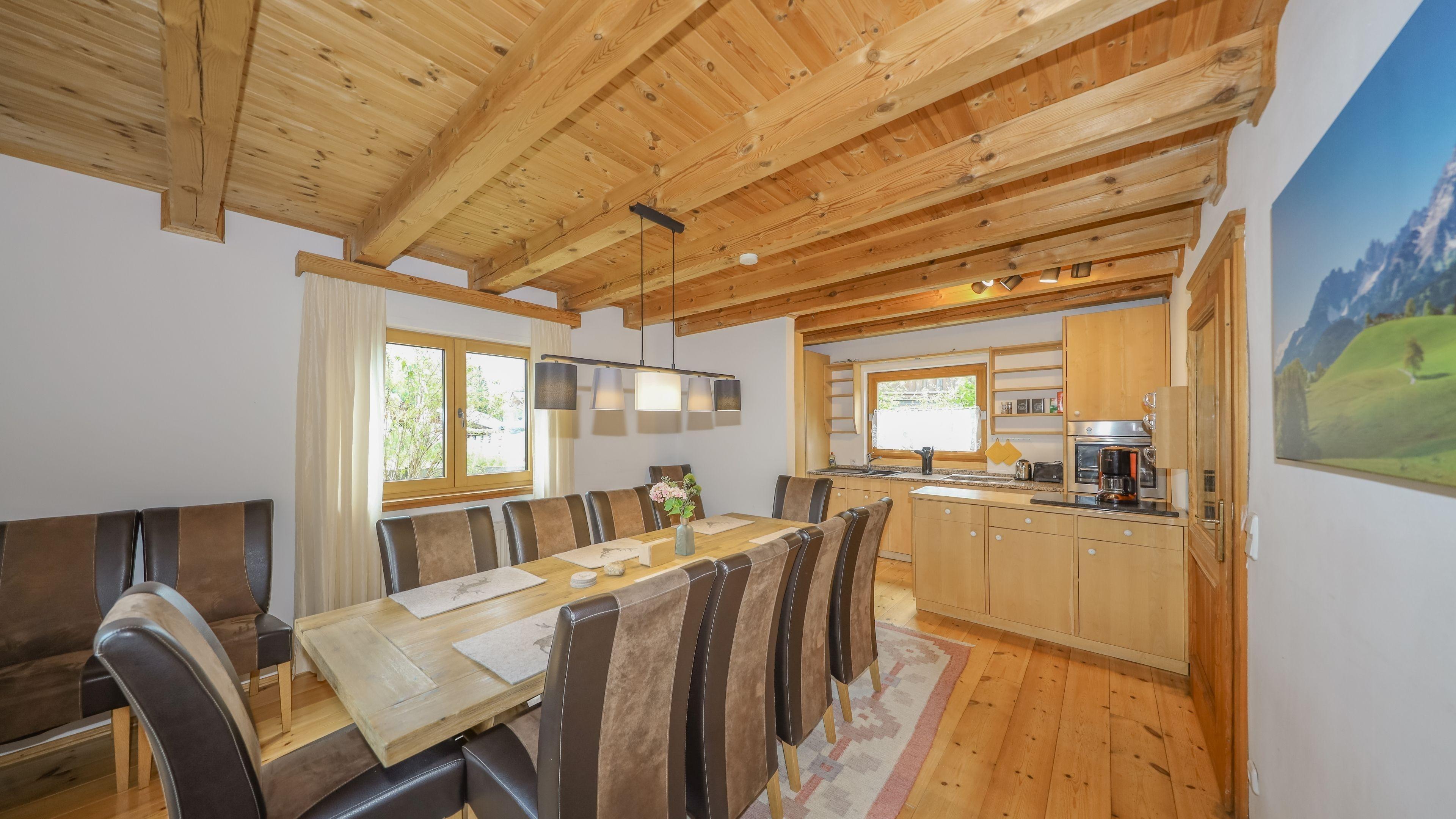 Esszimmer mit voll ausgestatteter Küche mit Spülmaschine, Mikrowelle, Toaster, Wasserkocher, Kühlschrank, 4 Plattenherd, Backofen, ...
