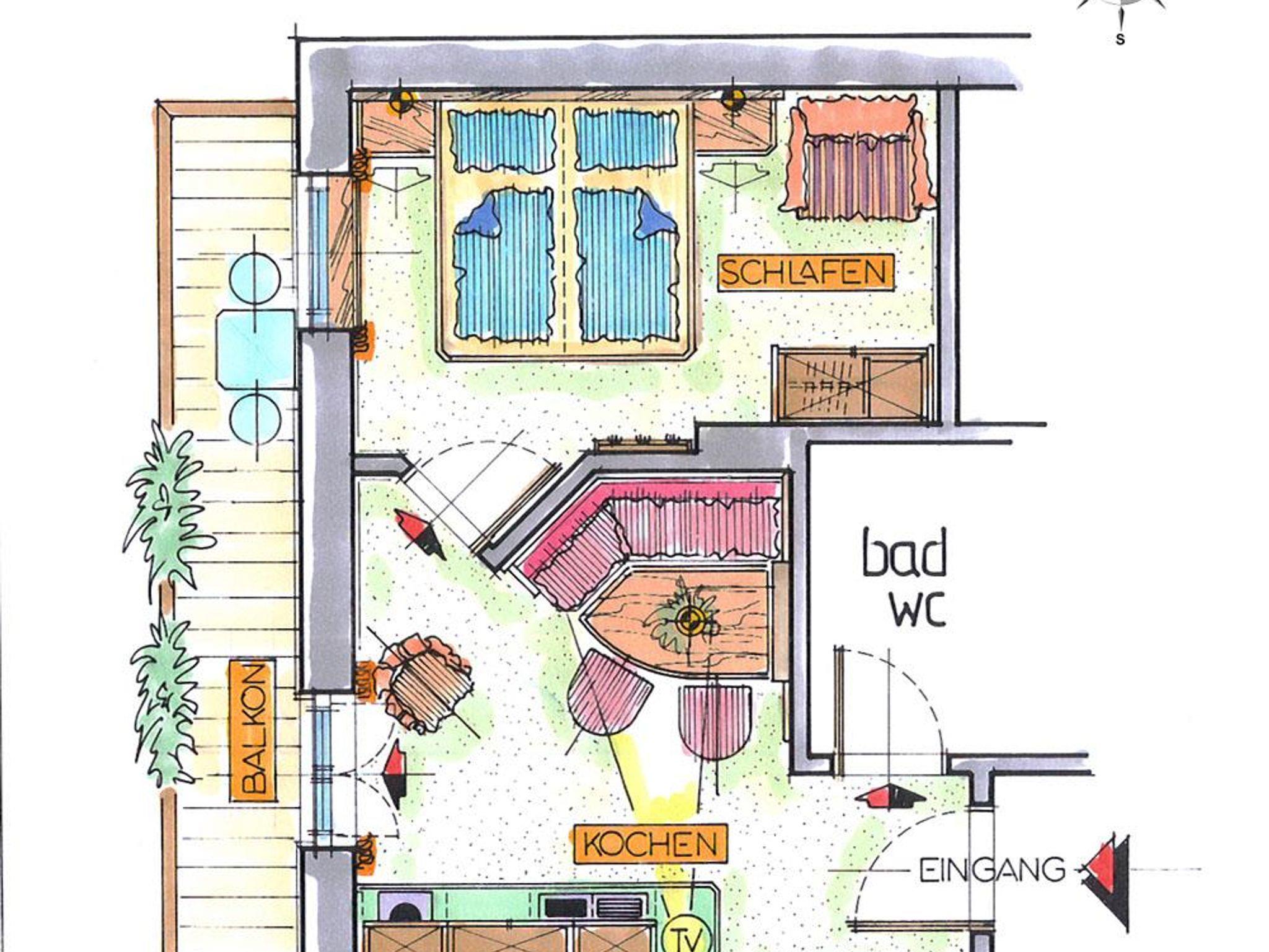 Die Wohnung verfügt über einen Wohnbereich mit Kochnische, einer gemütlichen Sitzecke, Schlafzimmer, Bad/WC. Durch den vom Schlafzimmer separierten Wohnbereich bietet die Wohnung auch trotz seiner Größe jeglichen Komfort. Westseitig gelegener Balkon.