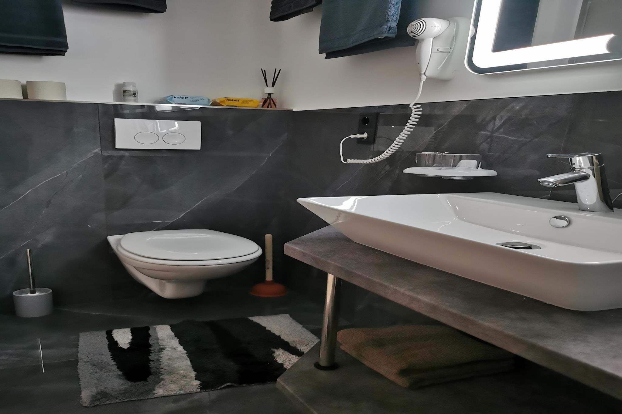 På 1. etage: (Stue(dobbeltsovesofa, Fjernsyn, balkon), åbent køkken(kogeplade(Komfur med fire kogeplader, glaskeramisk), elkedel, kaffemaskine(kaffetragt), ovn, mikrobølgeovn, opvaskemaskine , køleskab), soveværelse(dobbeltseng), badeværelse(bruser, håndvask, toilet, føntørrer)) Kælderetage: (fitnessrum, skiopbevaring) parkering