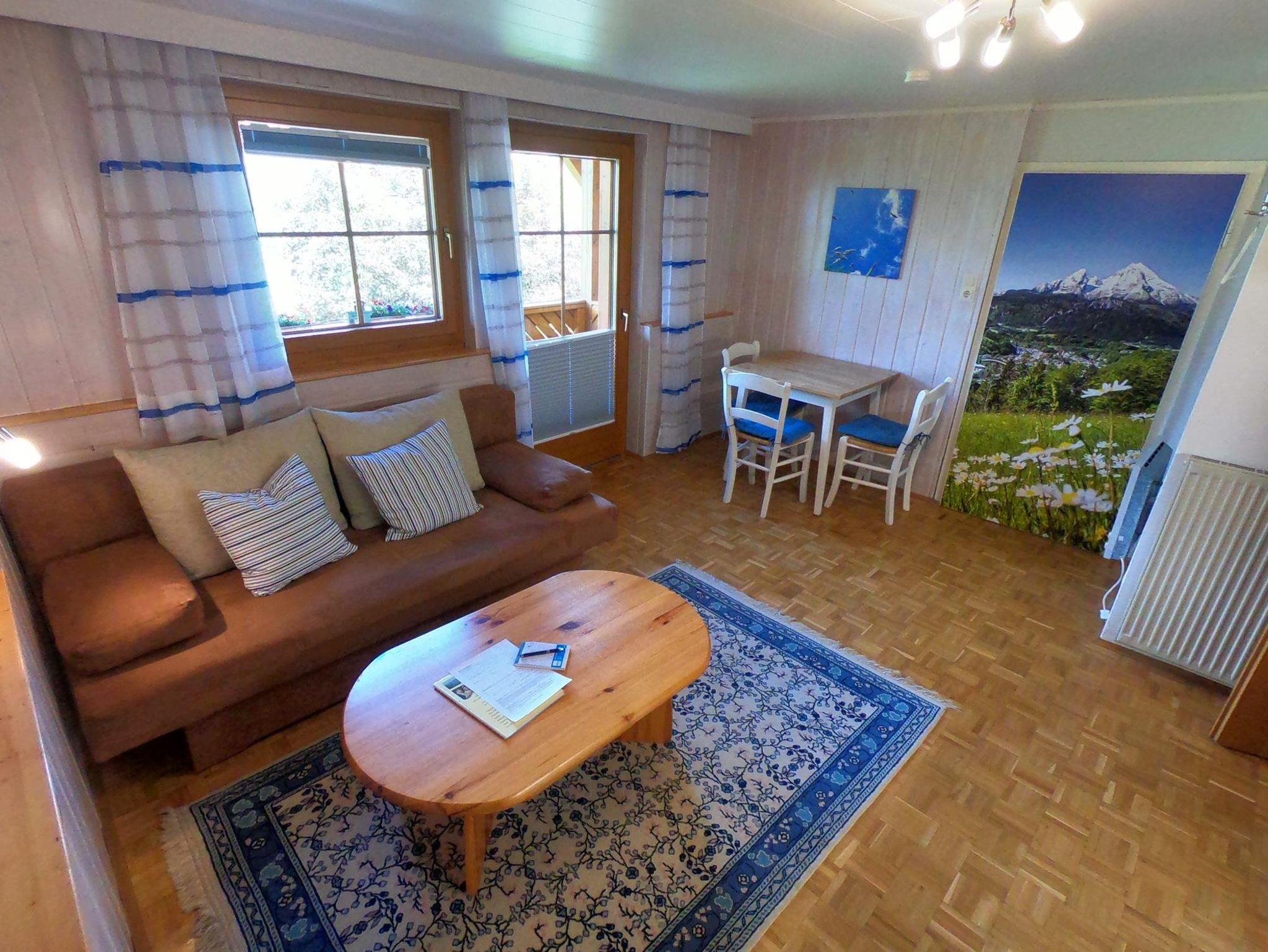 Schönes Einzimmer-Appartement (25m²), großer Balkon mit Blick auf den See und die umliegende Bergwelt. Das Apartment ist mit einer kleinen Küchenzeile ausgestattet.