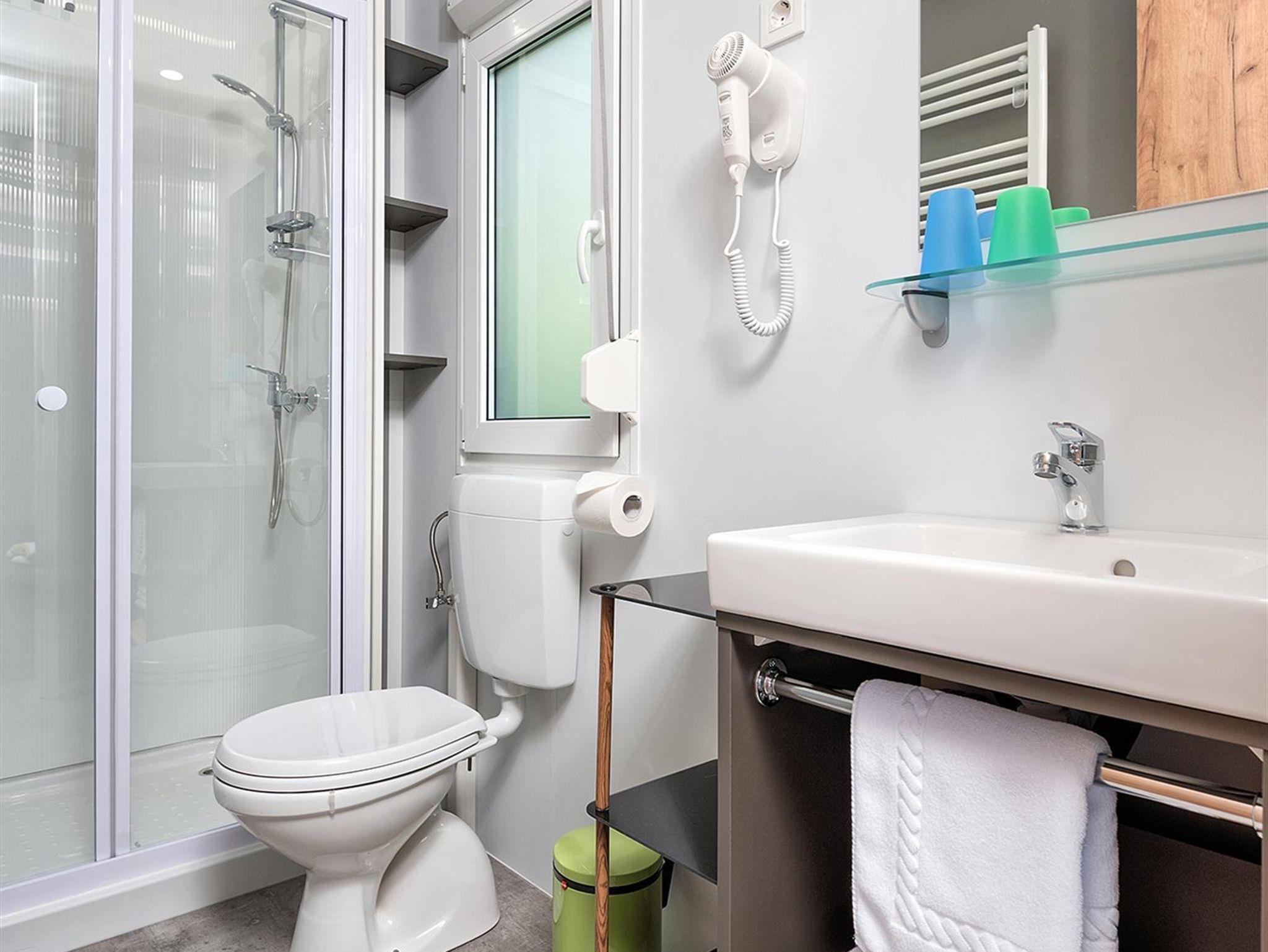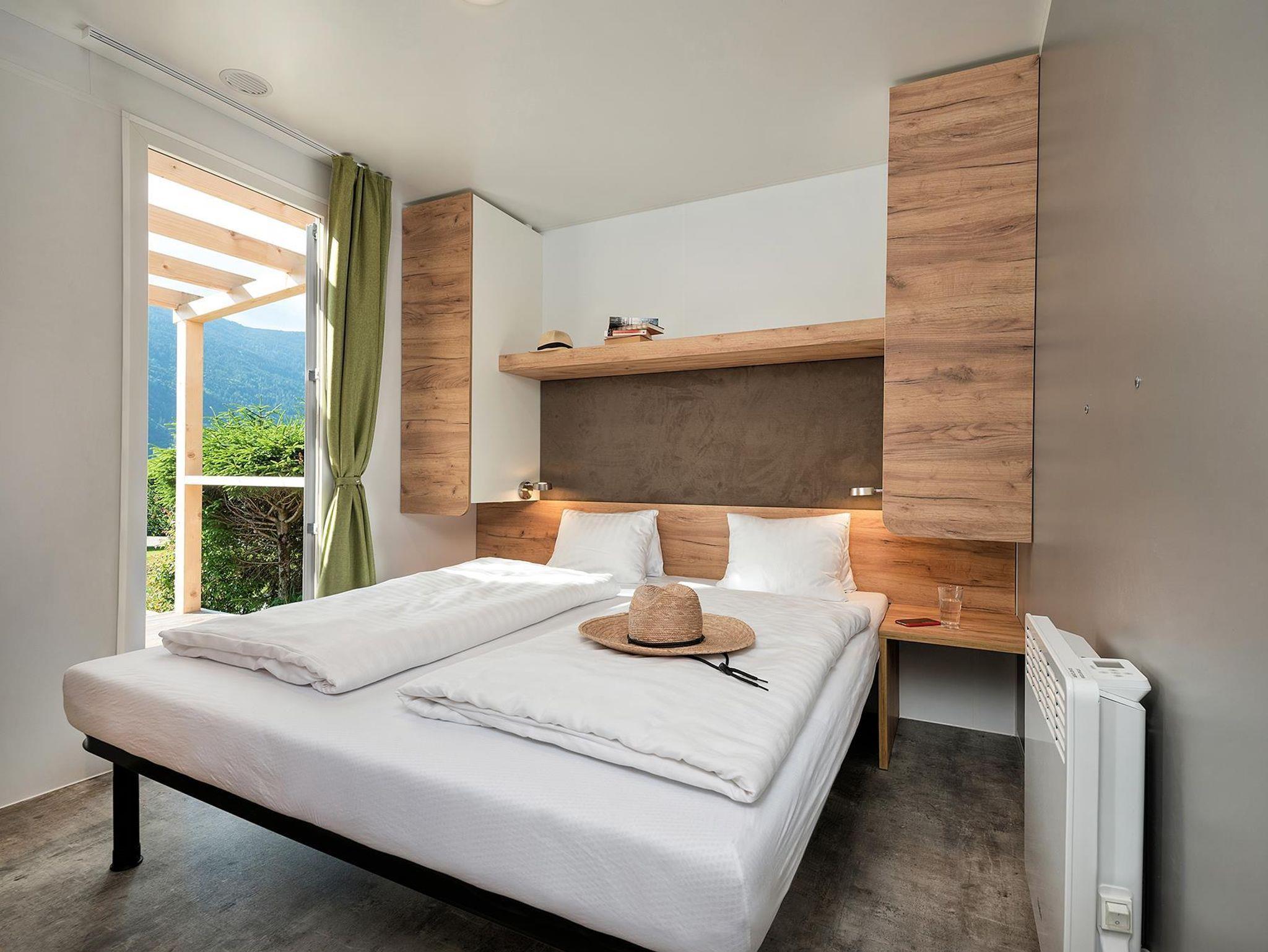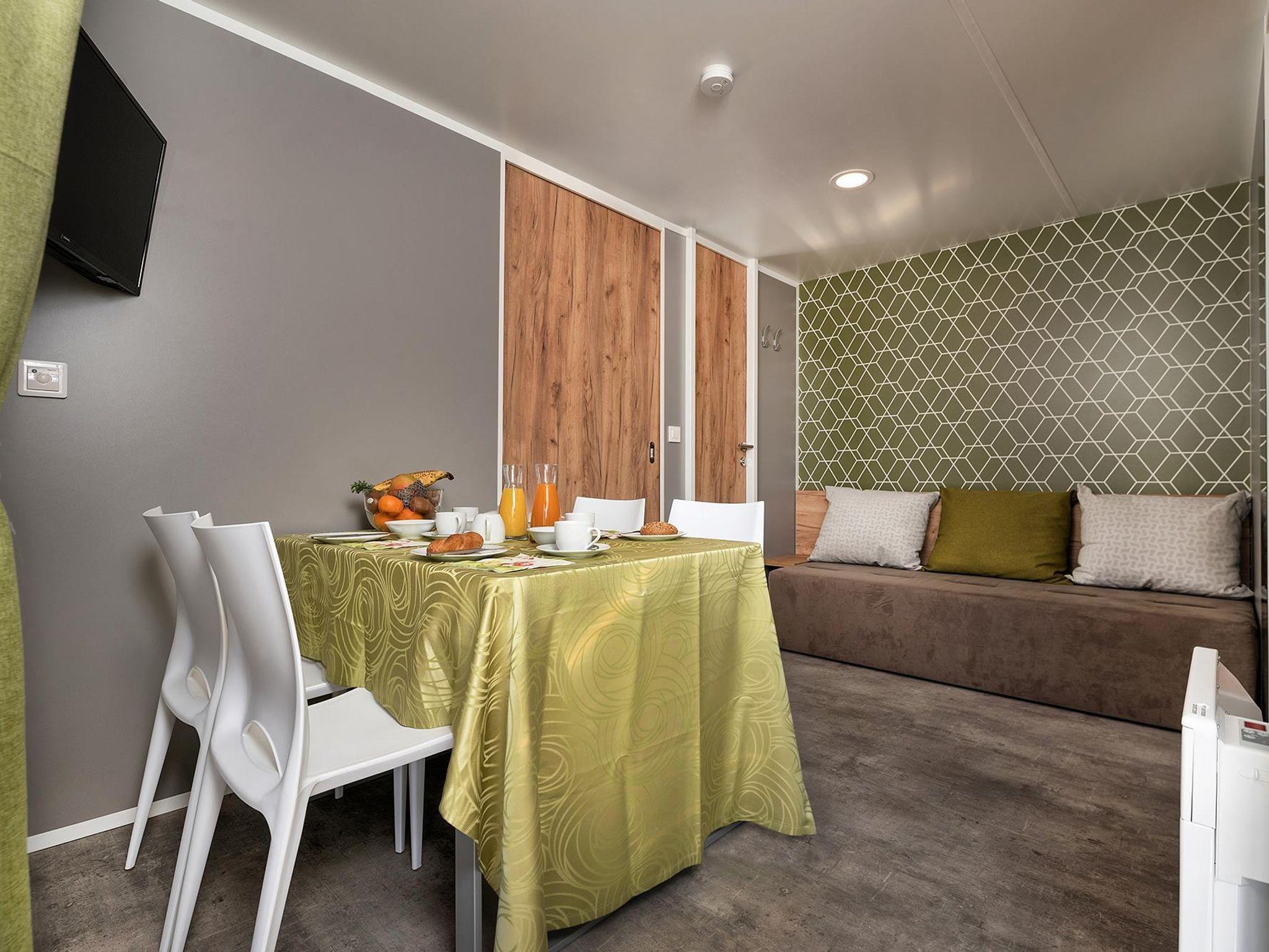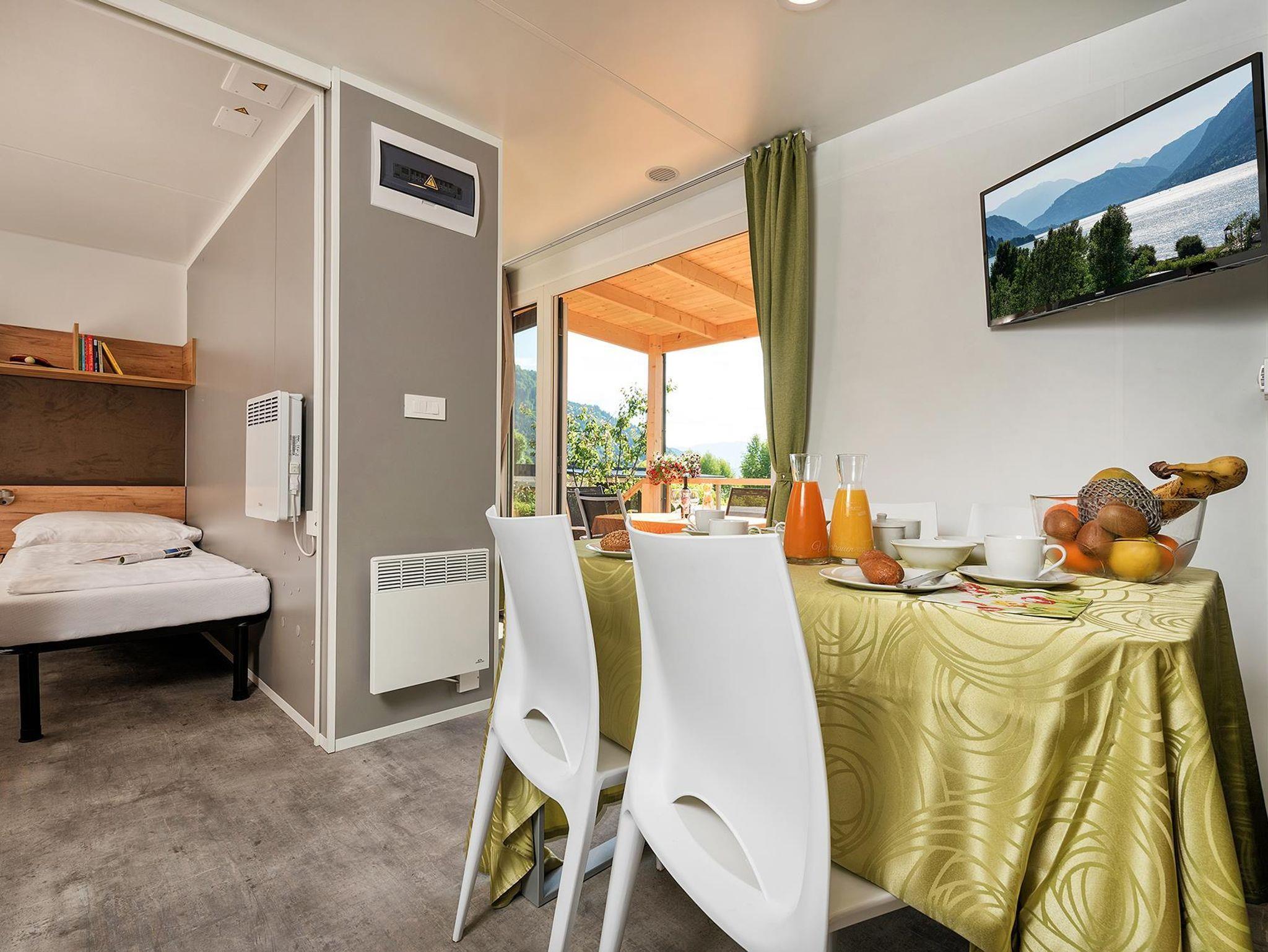 Ausstattung der Mobil Heime: Ein Schlafzimmer mit Ehebett. Ein separates Schlafzimmer für 2 Kinder oder Erwachsene. Badezimmer mit Bodenheizung, Dusche, WC und Waschbecken. Im Wohnzimmer ausziehbares Flafsofa für eine Person. Maximalbelegung 5 Personen. Küche mit Mikrowelle, Elektroherd Ceran, Kühlschrank mit Tiefkühlfach, Dunstabzug, Abwasch, Geschirrspüler, Sitzecke, Klimaanlage, TV, Überdachte Terrasse mit Tisch und Stühle. Inkl. Bettwäsche, Geschirr und Porzellan.