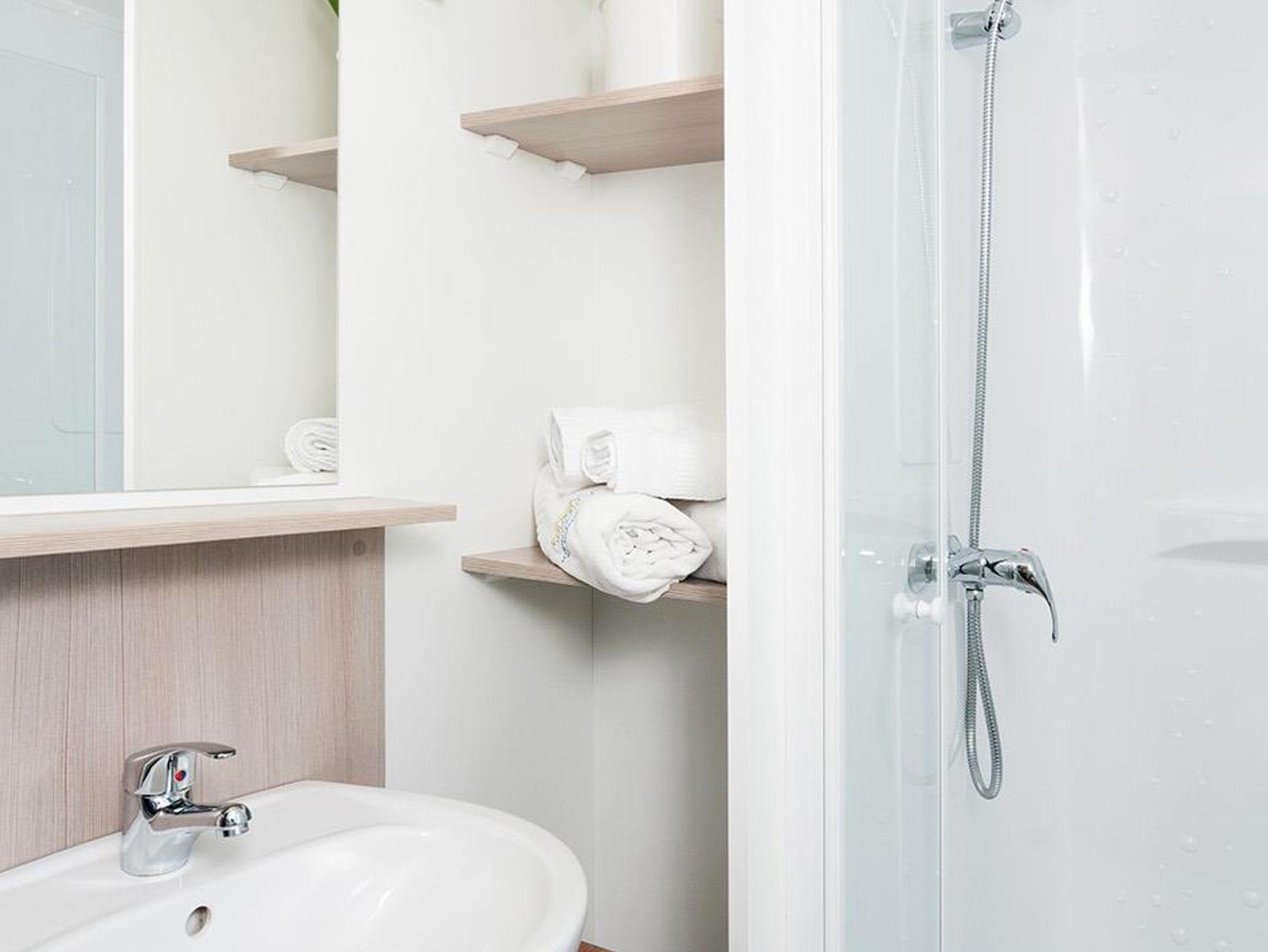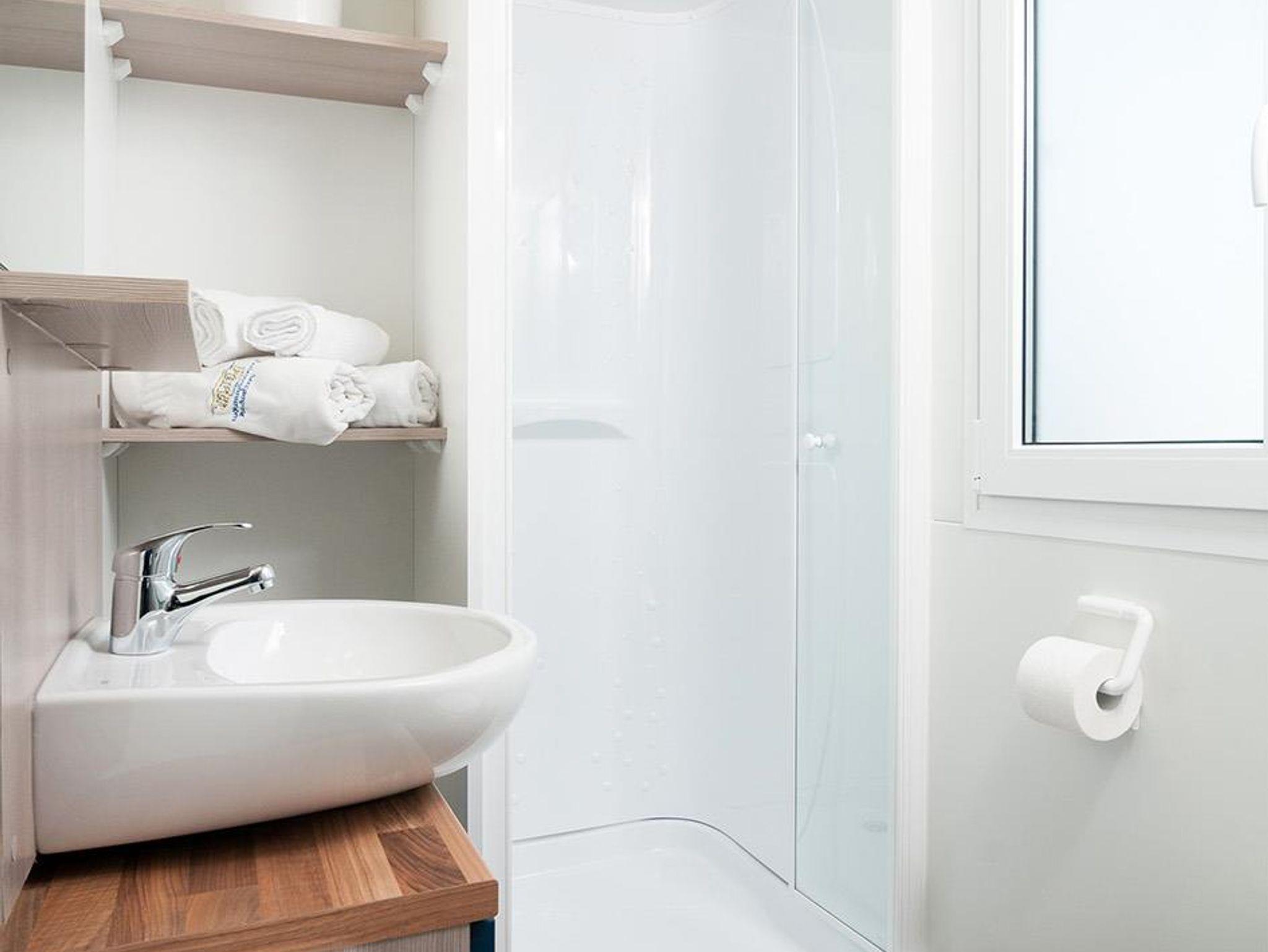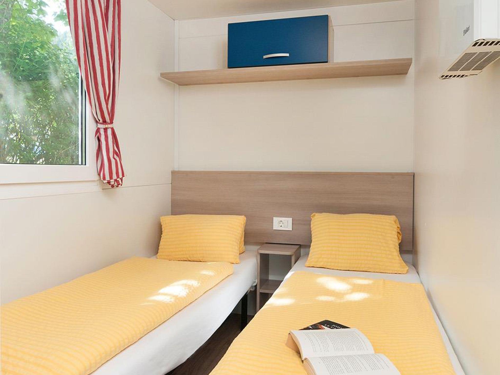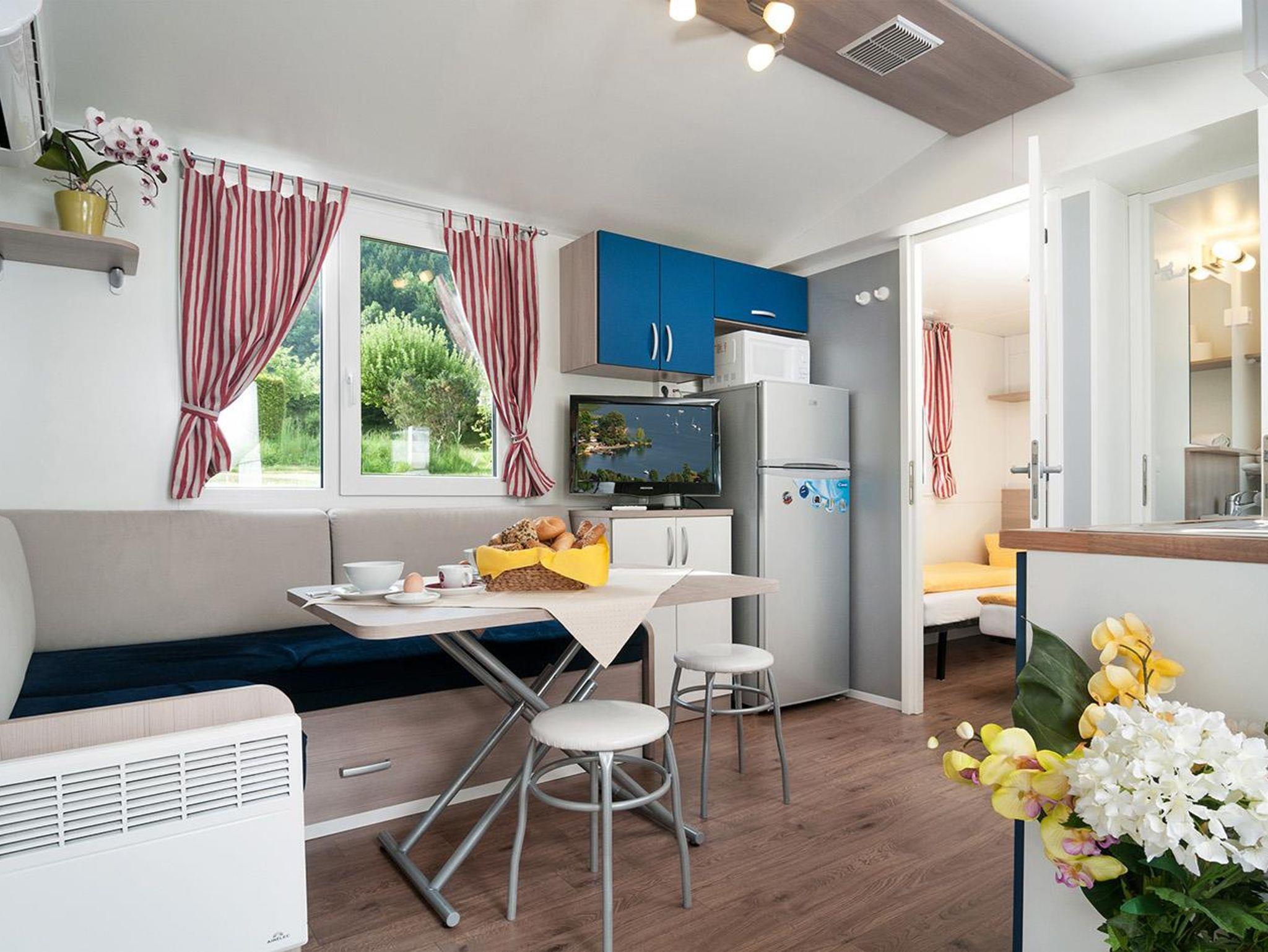 Ausstattung der Mobil Heime: Ein Schlafzimmer mit Ehebett. Ein separates Schlafzimmer für 2 bis 3 Kinder (Personen). Badezimmer mit Dusche und Waschbecken. WC. Im Wohnzimmer ausziehbares Doppelbett für 2 weitere Personen Maximalbelegung 6 - 7 Personen, je nach Typ. Mikrowelle, Gasherd, Kühlschrank, Dunstabzug, Abwasch, Geschirrspüler, Sitzecke, Klimaanlage, TV, Überdachte Terrasse mit Tisch und Stühle. Inkl. Bettwäsche, Geschirr und Porzellan. Wellness Eintritt, Liegestüle und WLan inklusive
