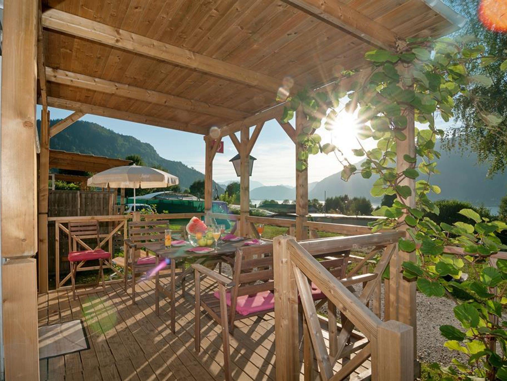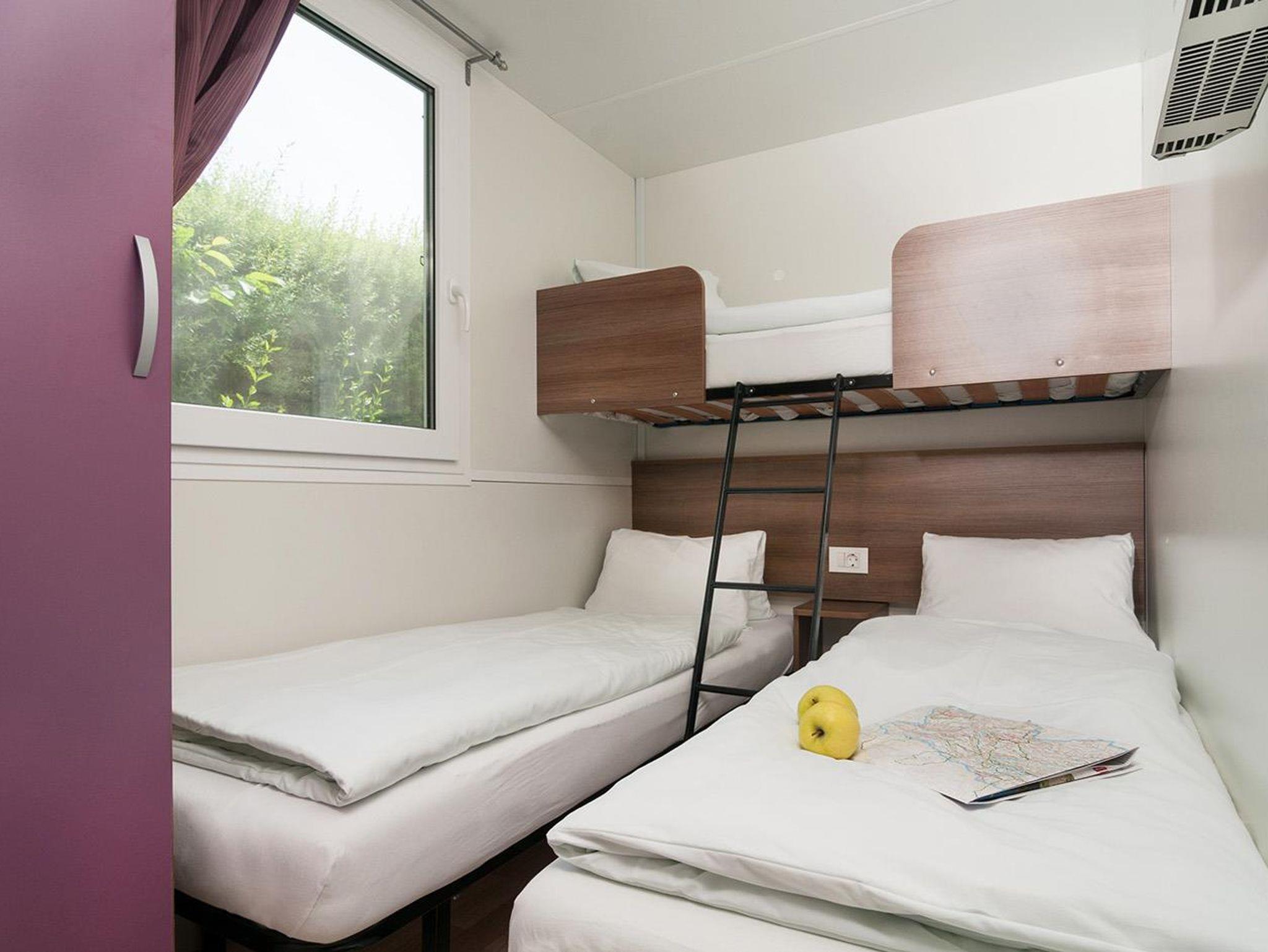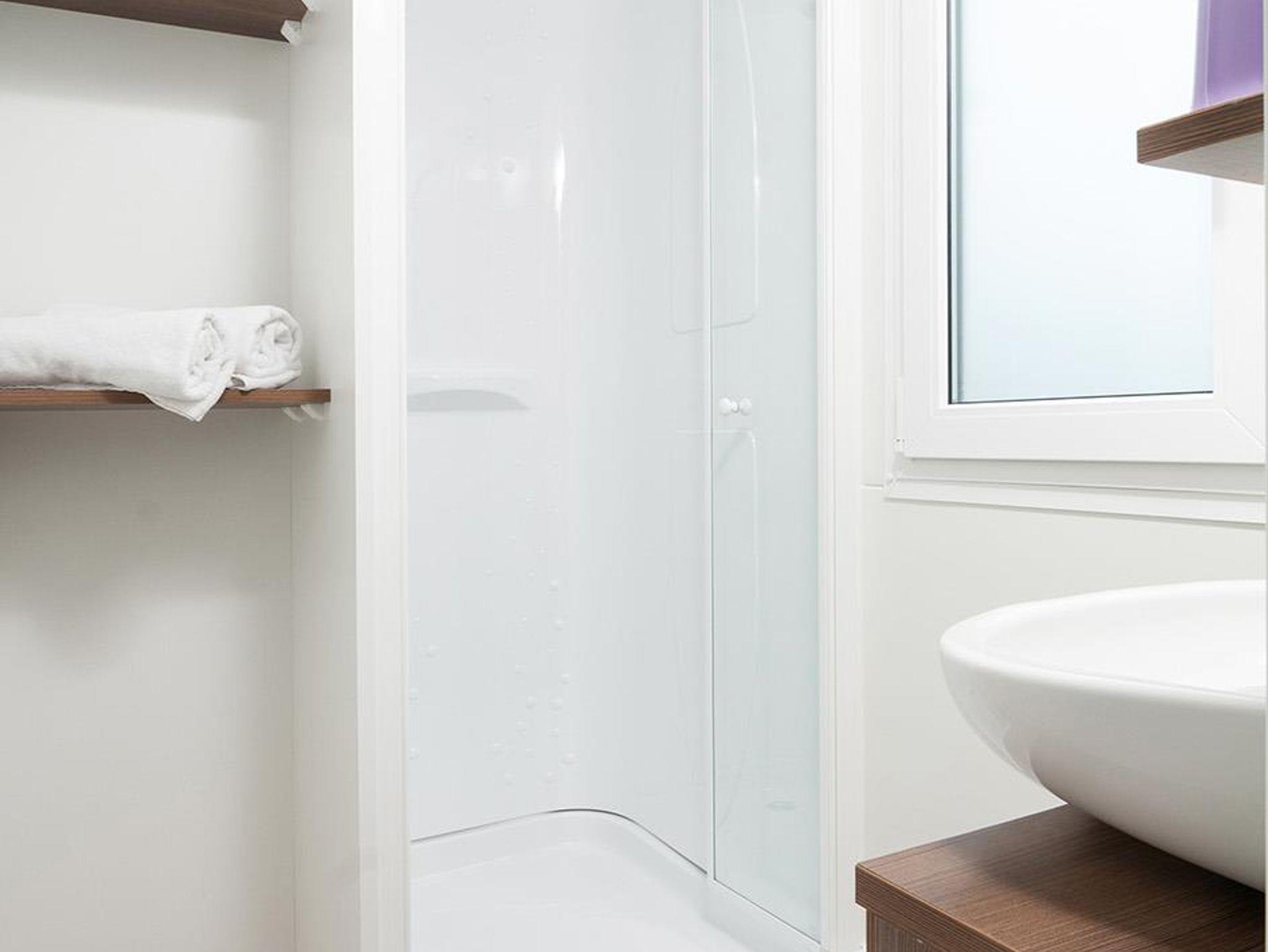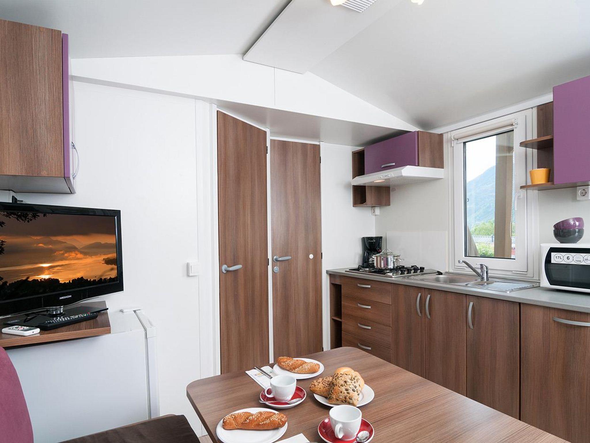 Ausstattung der Mobil Heime: Ein Schlafzimmer mit Ehebett. Ein separates Schlafzimmer für 2 bis 3 Kinder (Personen). Badezimmer mit Dusche und Waschbecken. WC. Im Wohnzimmer ausziehbares Doppelbett für 2 weitere Personen Maximalbelegung 6 - 7 Personen, je nach Typ. Mikrowelle, Gasherd, Kühlschrank, Dunstabzug, Abwasch, Geschirrspüler, Sitzecke, Klimaanlage, TV, Überdachte Terrasse mit Tisch und Stühle. Inkl. Bettwäsche, Geschirr und Porzellan. Wellness Eintritt, Liegestüle und WLan inklusive