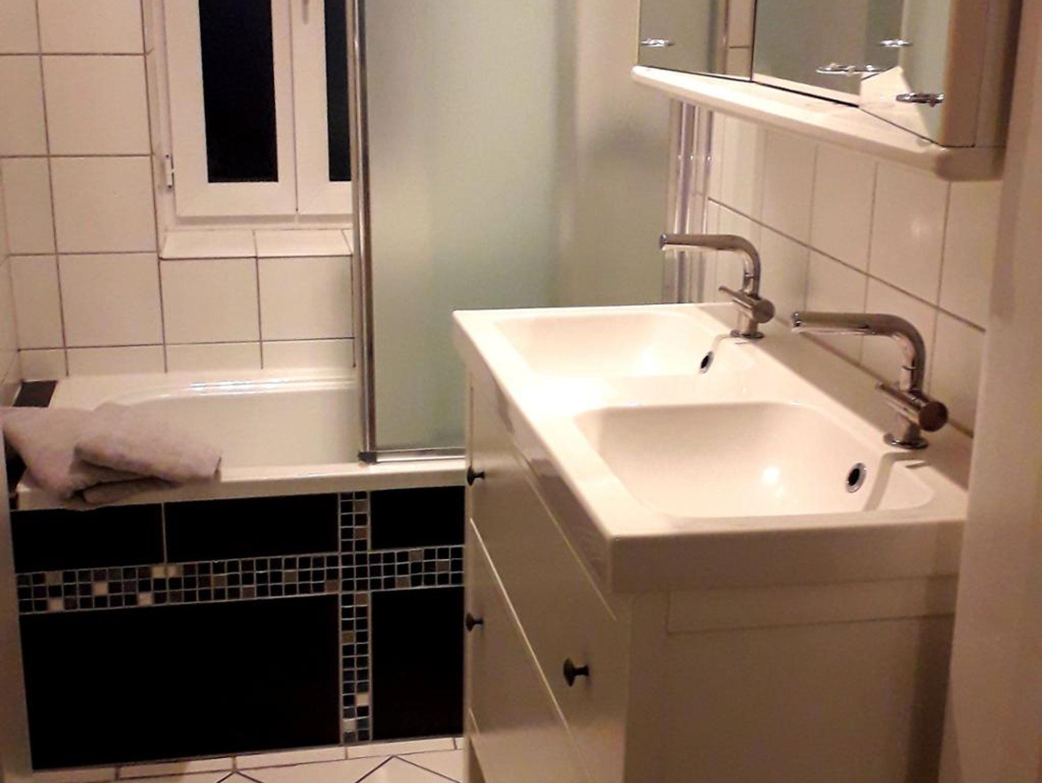 Auch das Badezimmer mit Fenster, Badewanne mit Duschmöglichkeit und 2 Waschbecken befindet sich auf dieser Ebene, genauso wie ein extra begehbares WC.