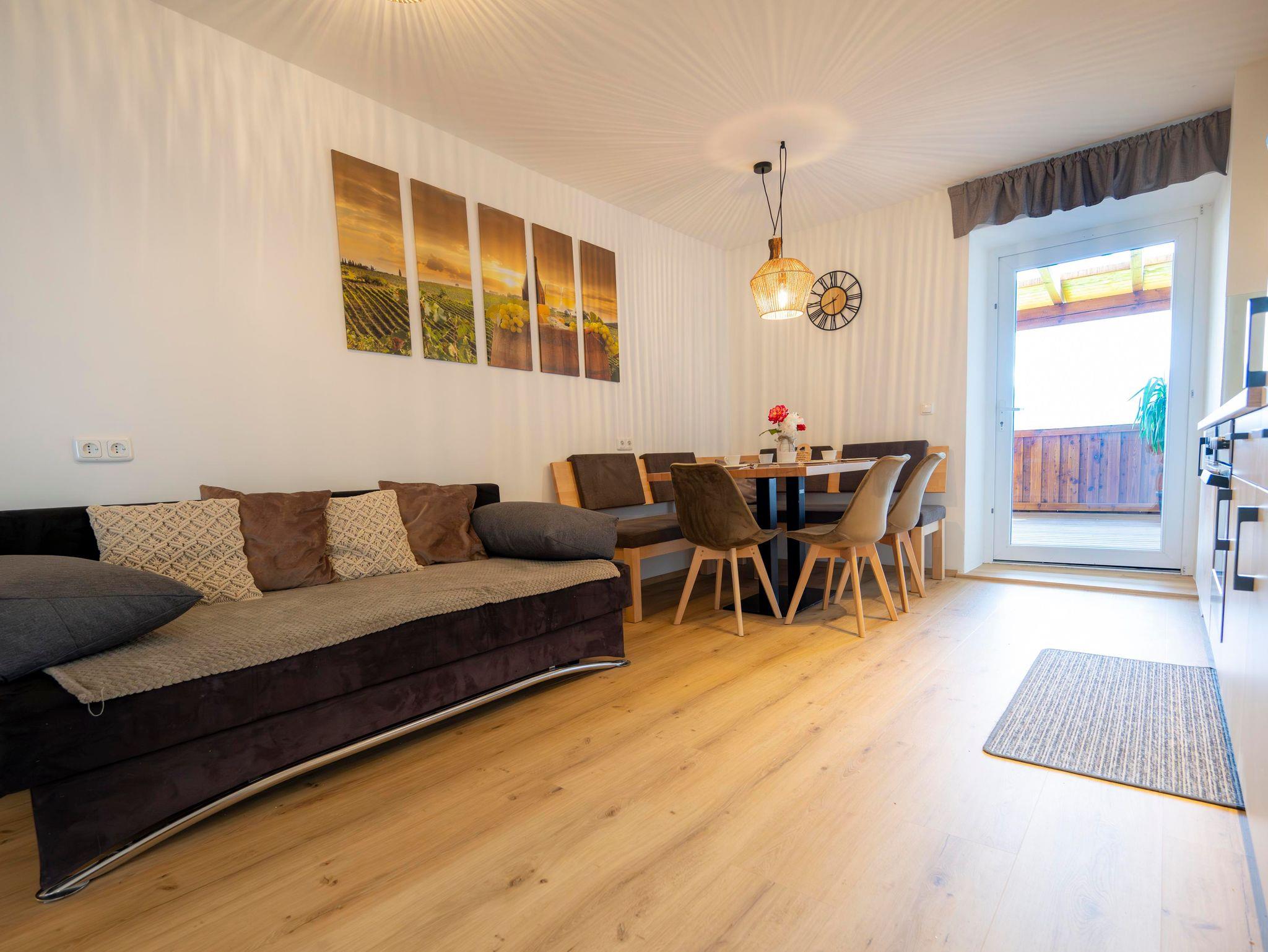 Diese Ferienwohnung ( ca.91m2 ) befindet sich im Erdgeschoss und verfügt über zwei Schlafzimmer, 2 Badezimmer, Wc, Küche, Essbereich, Couch und eine Terrasse mit herrlichem Ausblick ins Pöllauer Tal (34 m2 Terrasse).