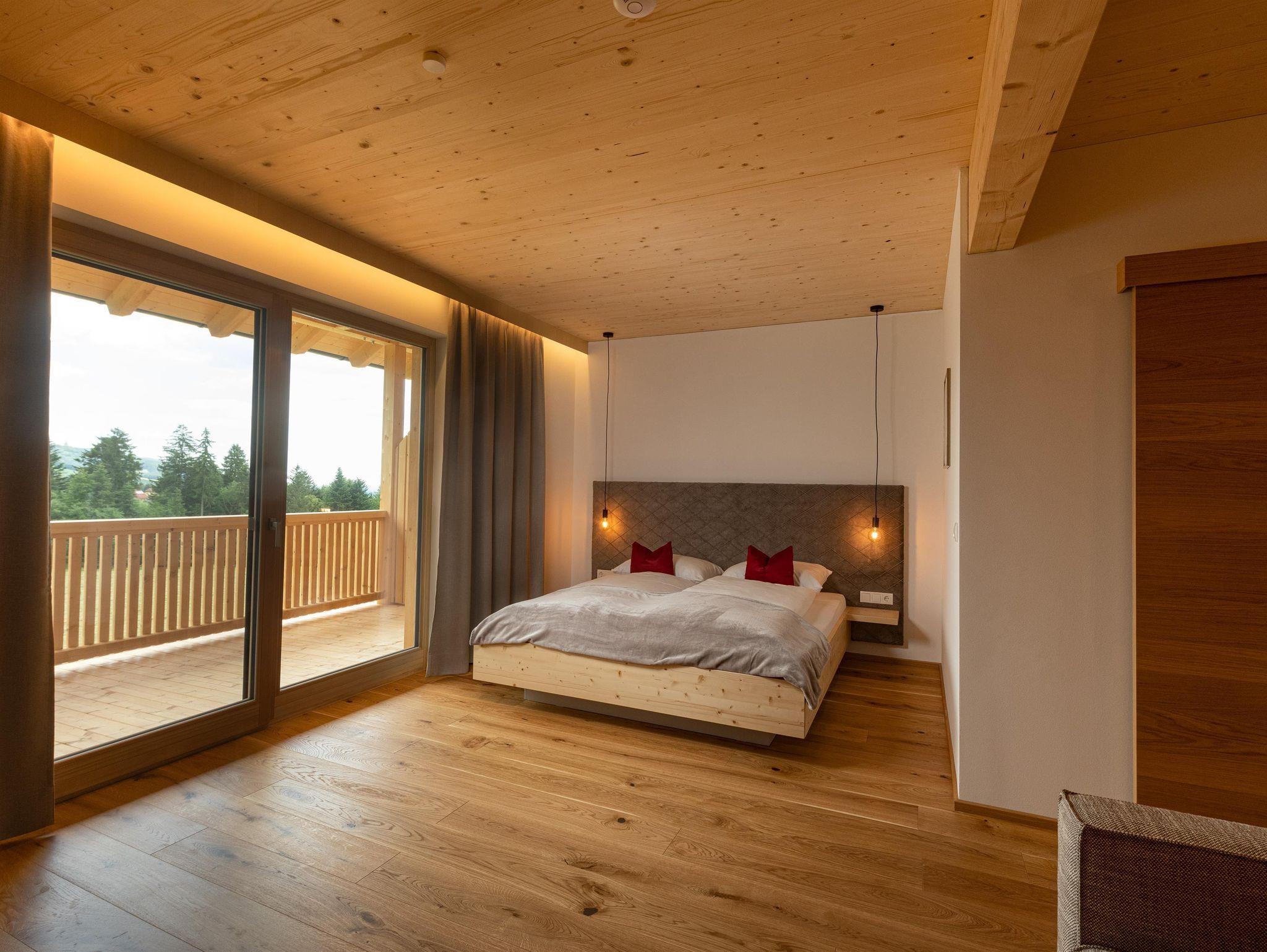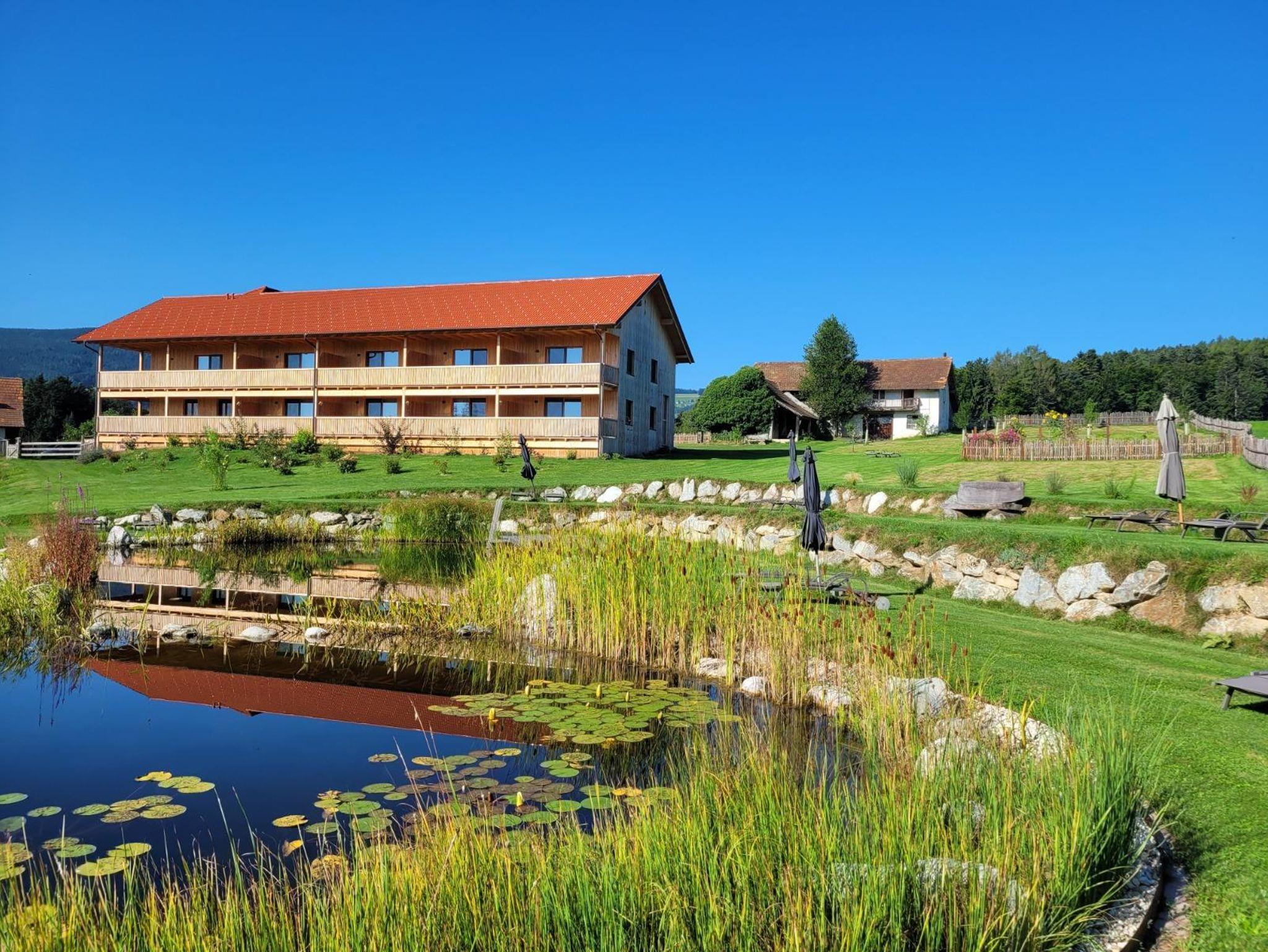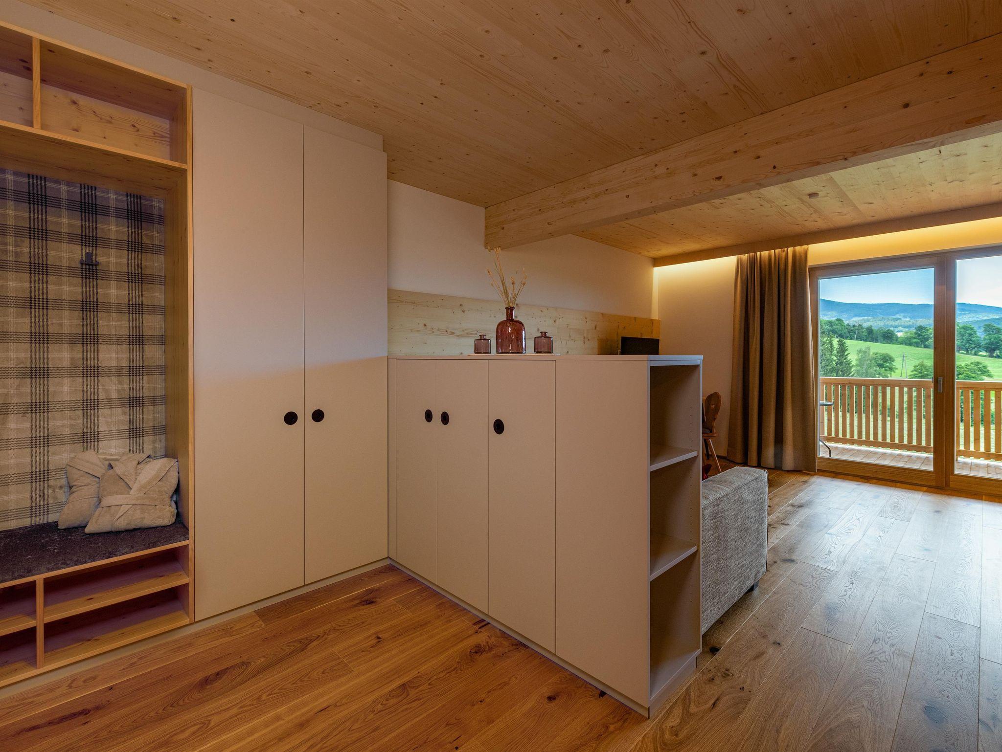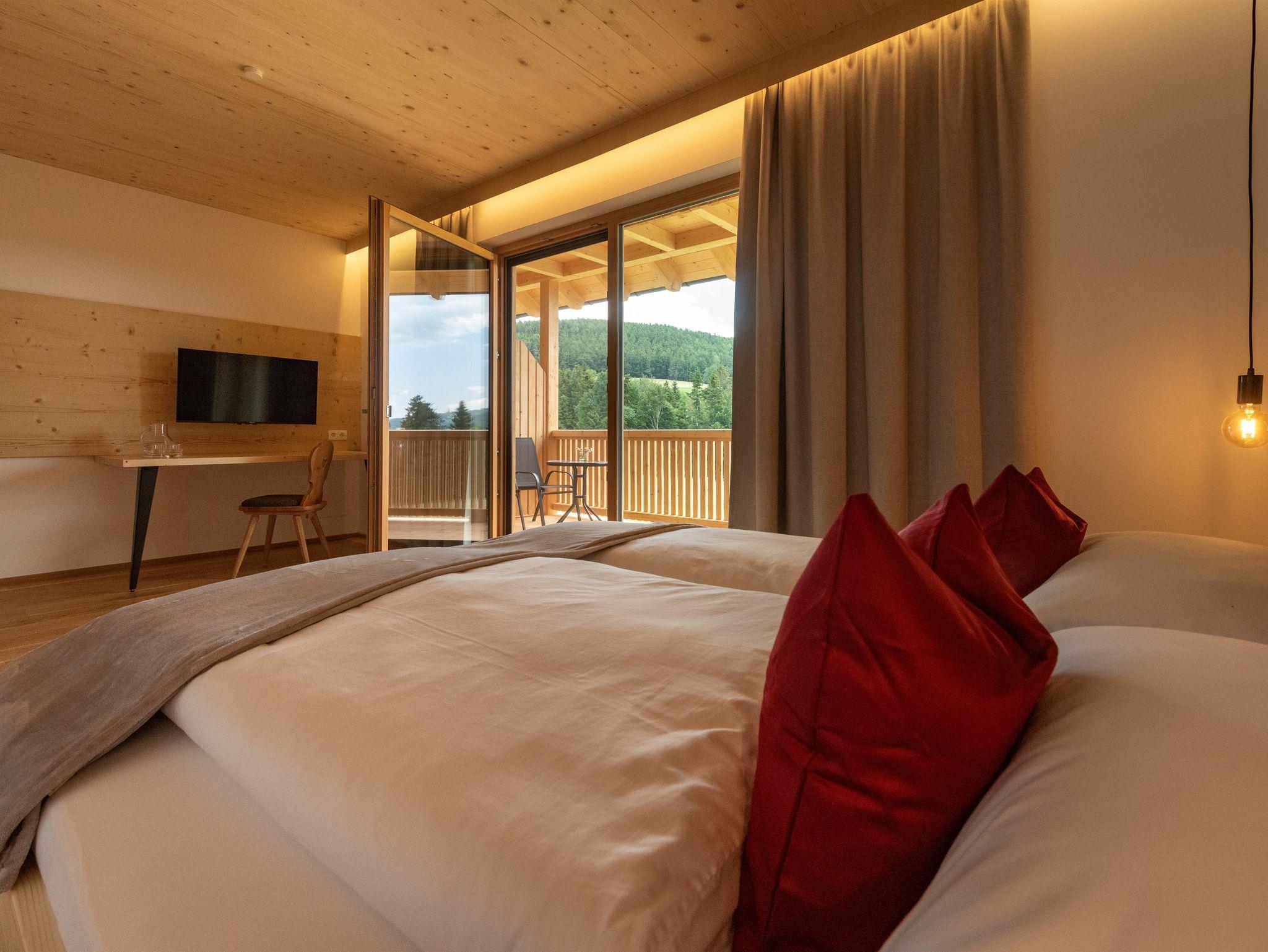 Deluxe ist ein gemütliches Doppelzimmer in unserem neuen Holzhaus. Vom großzügigen Balkon haben Sie einen wundervollen Blick auf unseren Naturteich und die umliegende Berglandschaft. Vom Zimmer können Sie den Sonnenaufgang und sehr oft auch Wildwechsel beobachten.