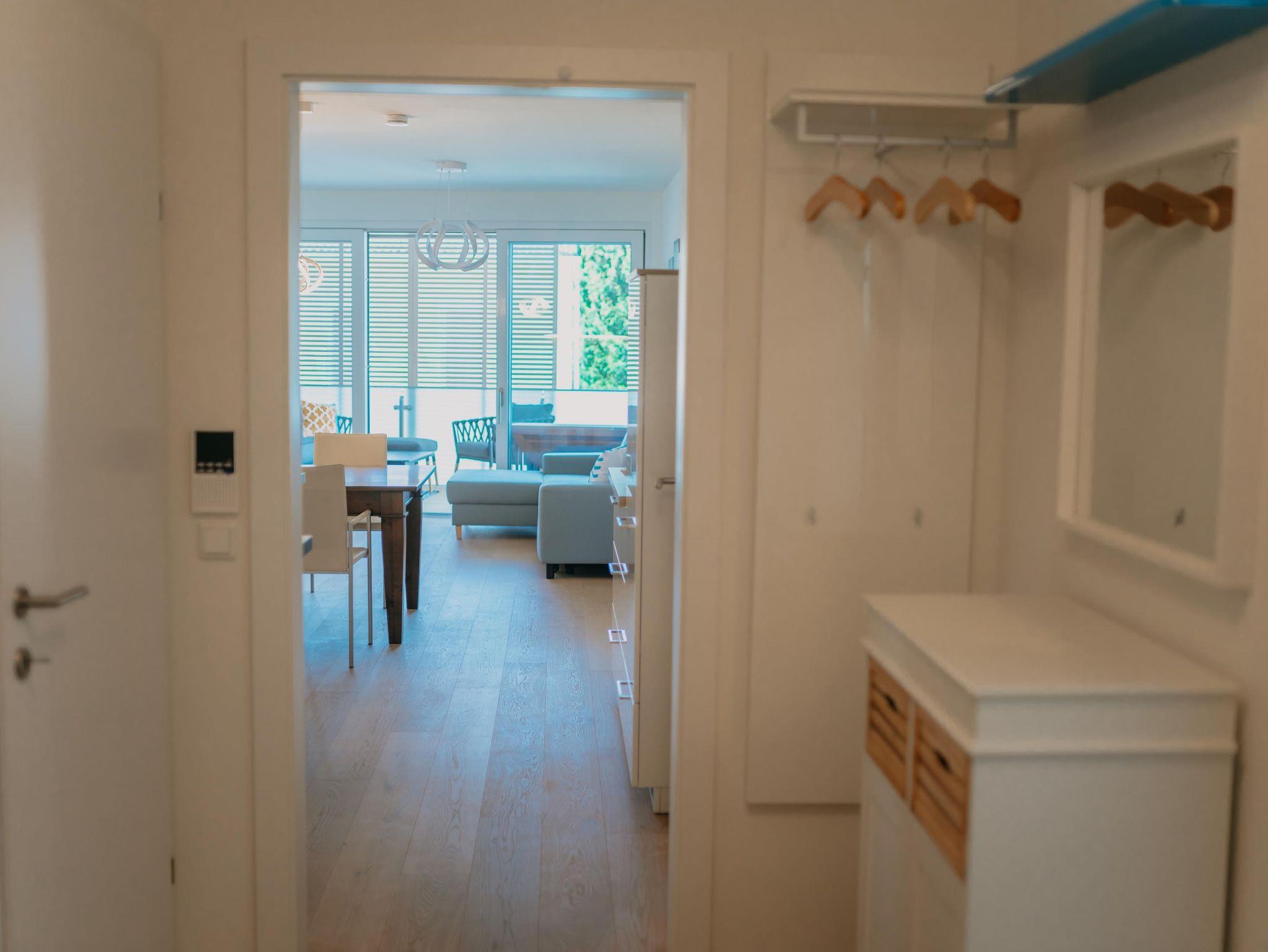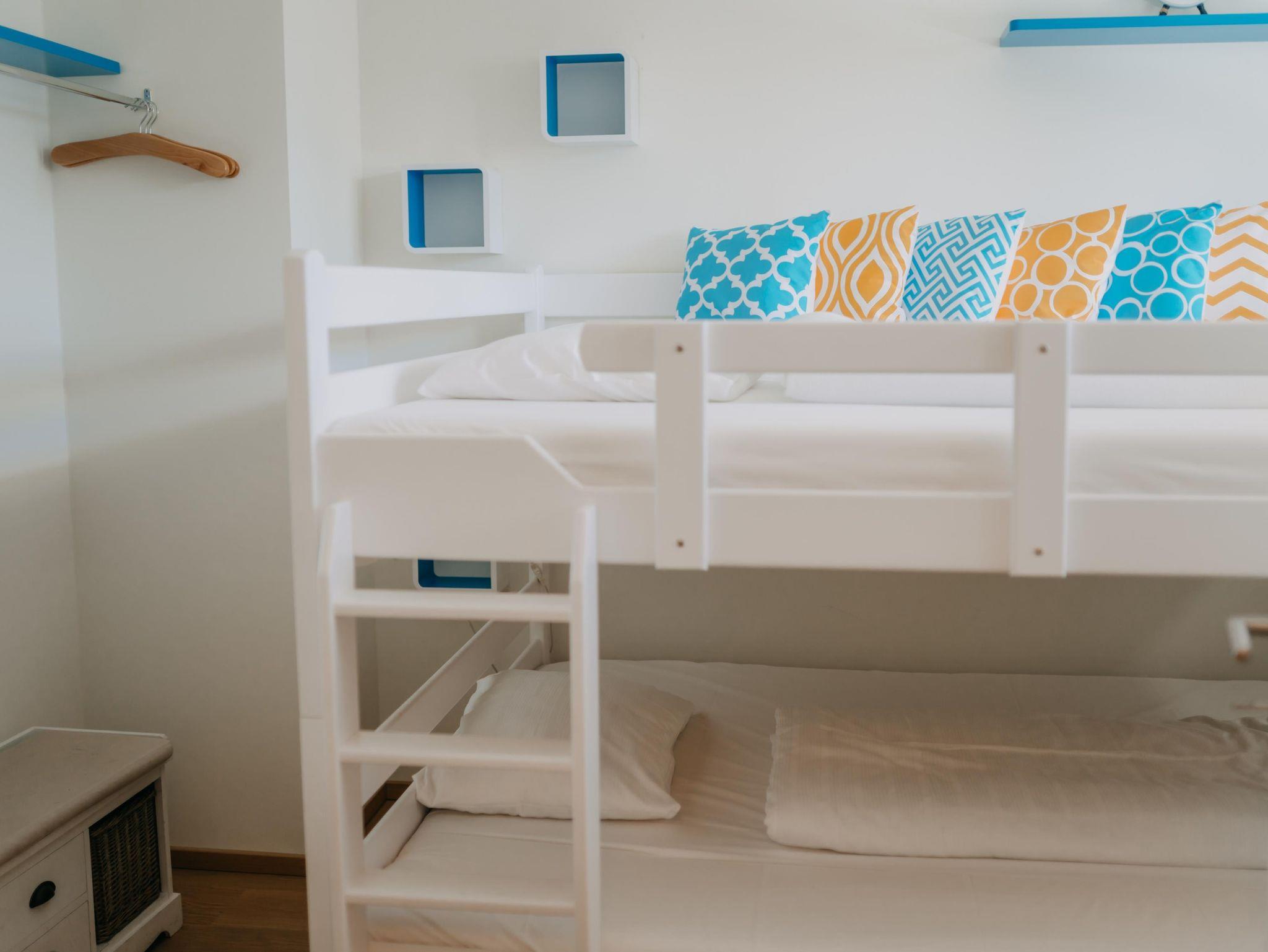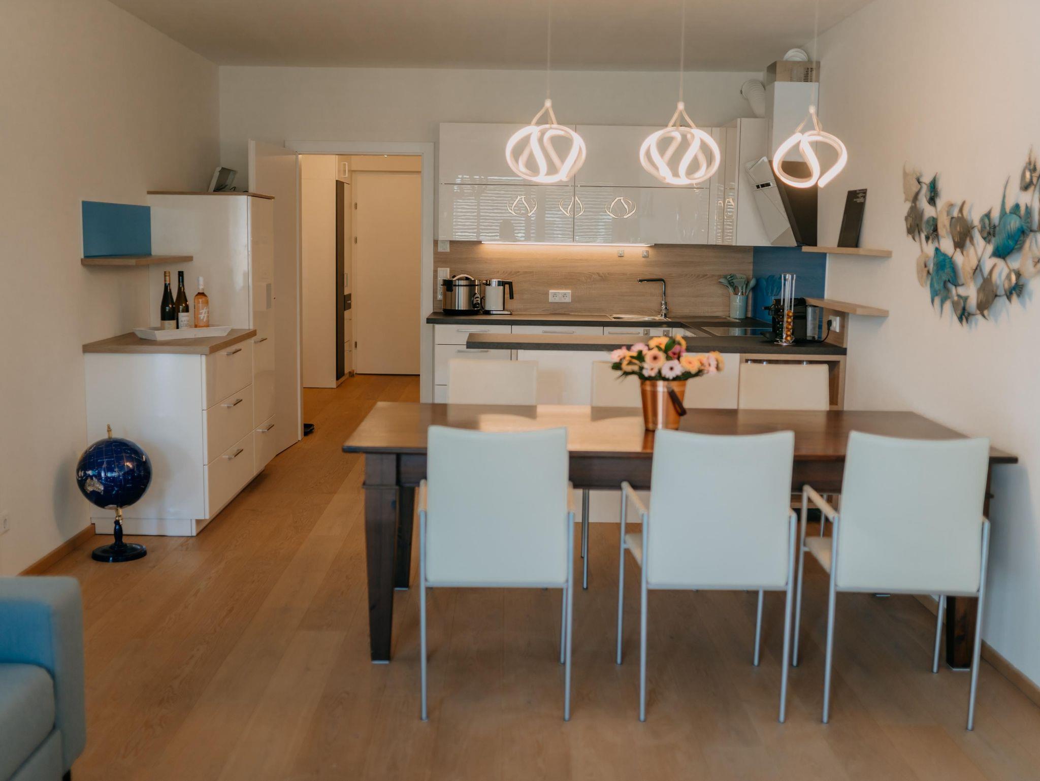 Das Apartment verfügt über 2 Schlafzimmer mit einem Doppelbett und einem extra großen Etagenbett (140x200). Im Wohnzimmer dürfen 2 weitere Personen auf der Schlafcouch schlafen. Die Wohnung ist für bis zu 6 Personen - und somit ideal für Familien geeignet. Des weiteren verfügt das Apartment über eine voll ausgestattete Küche mit Nespresso Kaffeemaschine, Backofen und Spülmaschine. Ein absolutes Highlight ist der überdachte Außenbereich der Wohnung. Der 24 qm große Balkon bietet genügend Platz für erholsame Abende im Freien.
