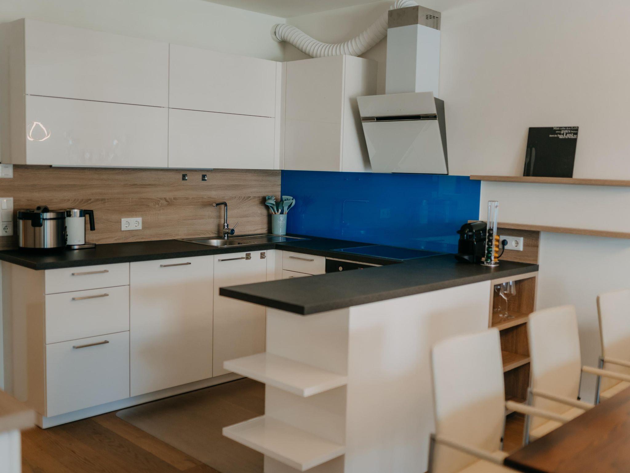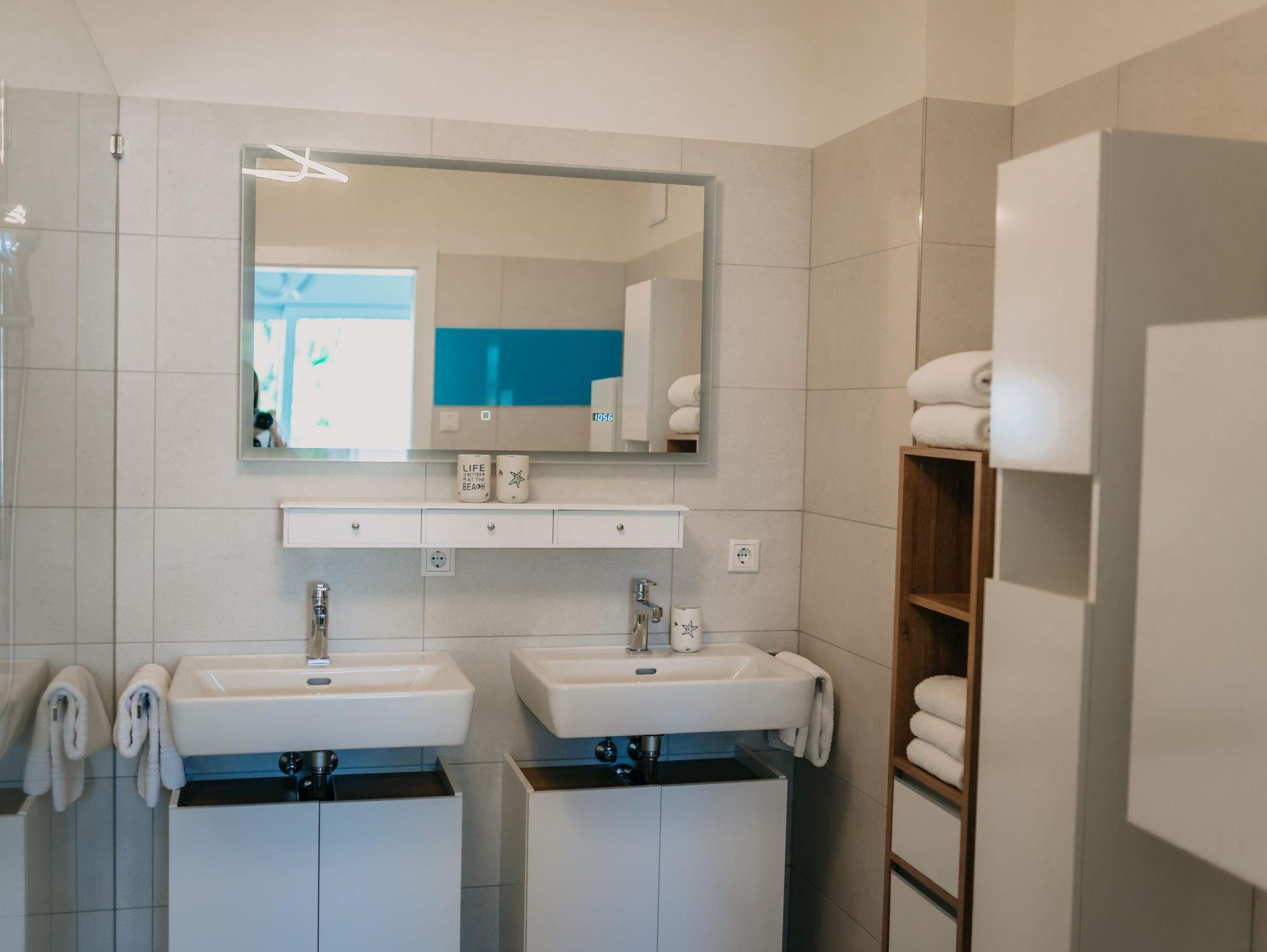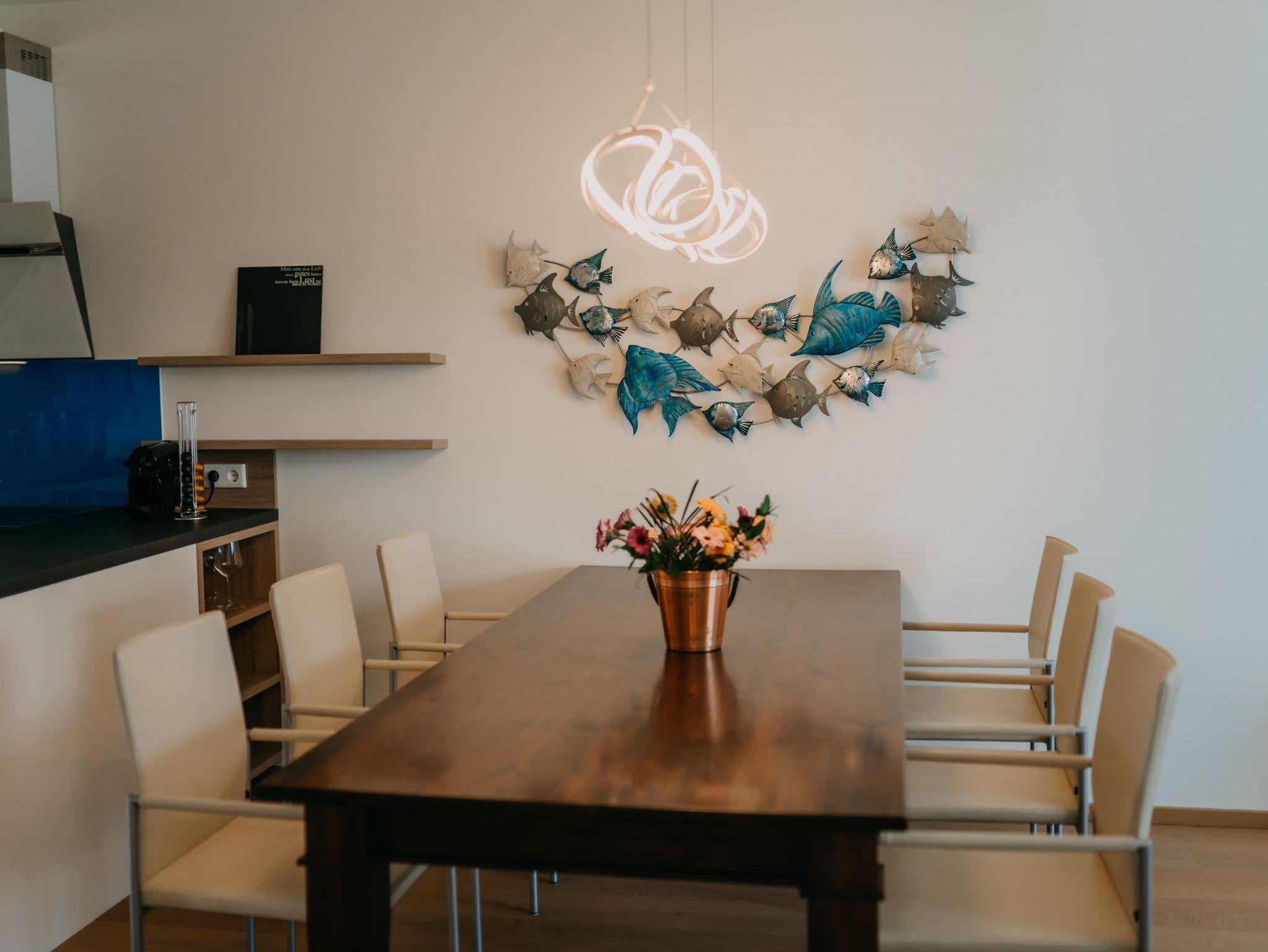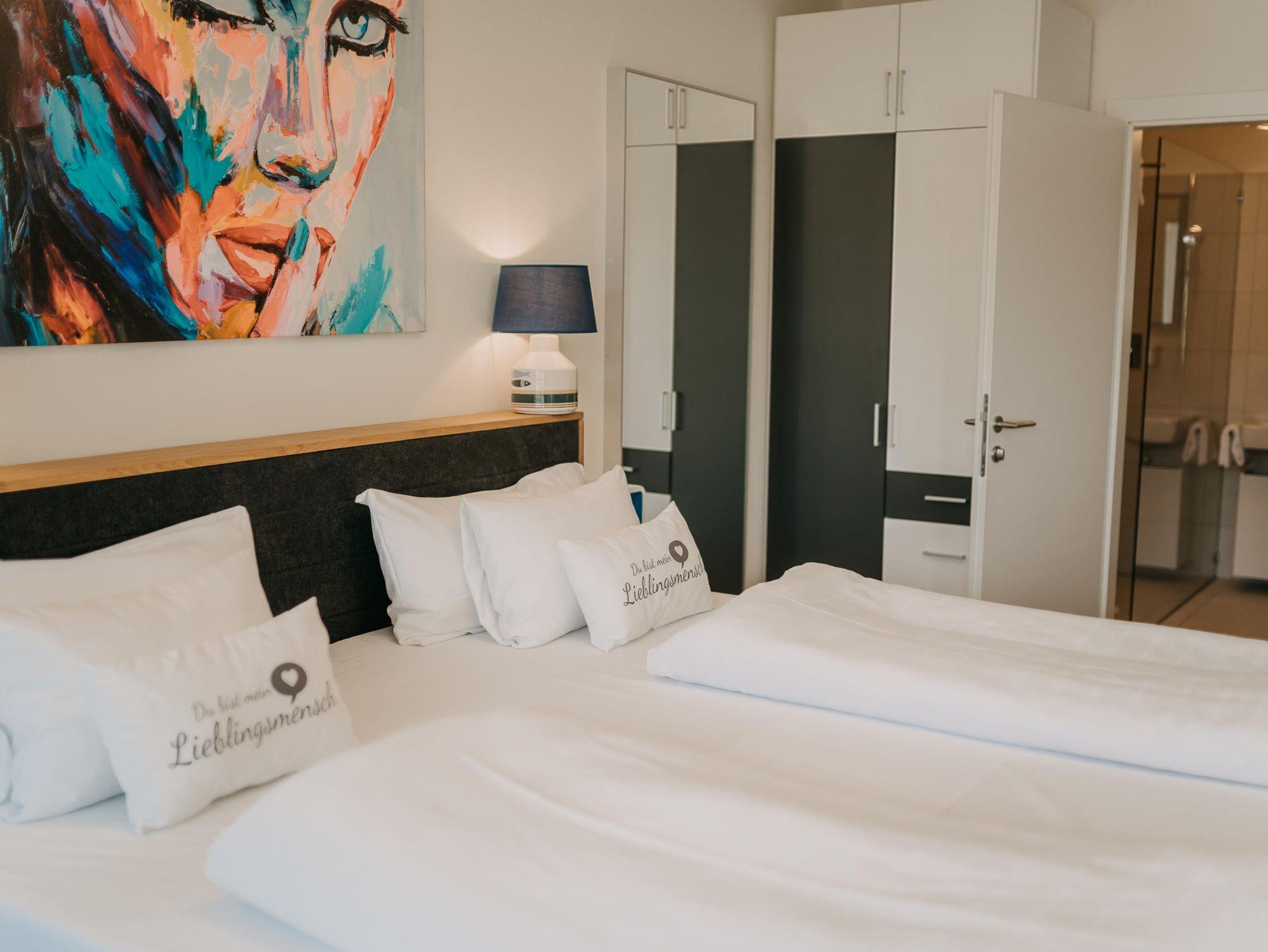 Das Apartment verfügt über 2 Schlafzimmer mit einem Doppelbett und einem extra großen Etagenbett (140x200). Im Wohnzimmer dürfen 2 weitere Personen auf der Schlafcouch schlafen. Die Wohnung ist für bis zu 6 Personen - und somit ideal für Familien geeignet. Des weiteren verfügt das Apartment über eine voll ausgestattete Küche mit Nespresso Kaffeemaschine, Backofen und Spülmaschine. Ein absolutes Highlight ist der überdachte Außenbereich der Wohnung. Der 24 qm große Balkon bietet genügend Platz für erholsame Abende im Freien.