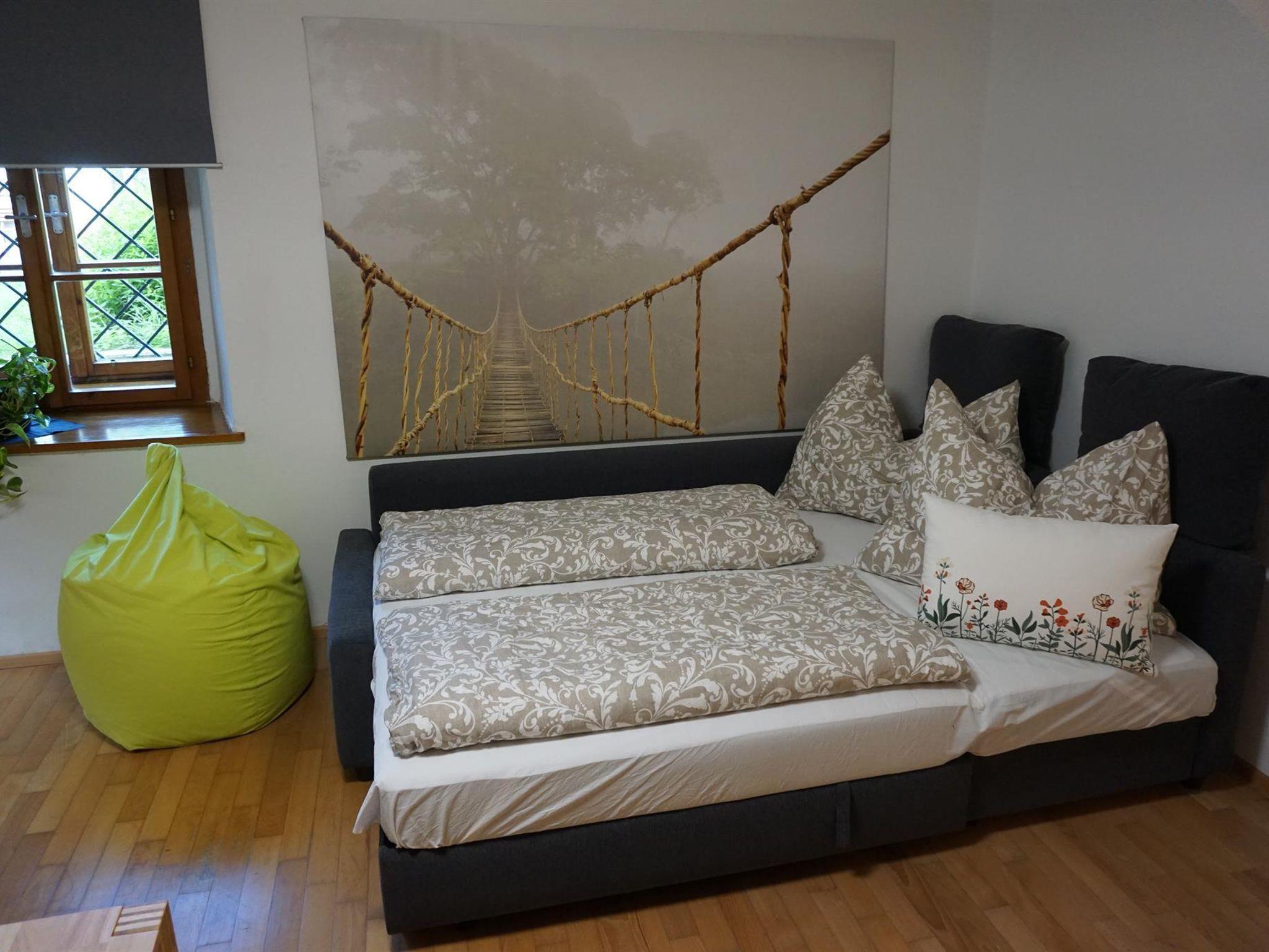 • ein getrenntes Schlafzimmer mit hochwertigen Vollholz-Doppelbett und Kasten