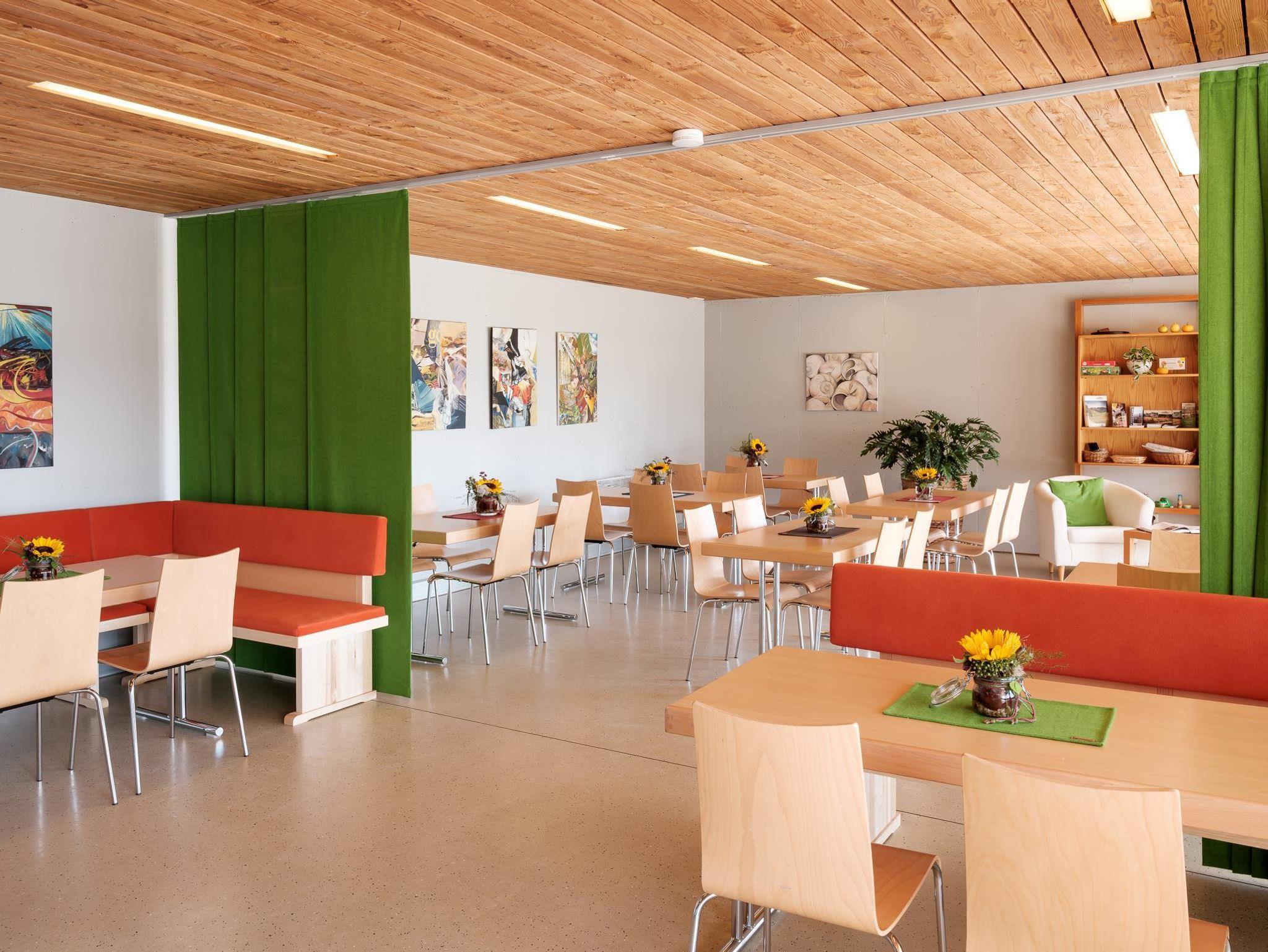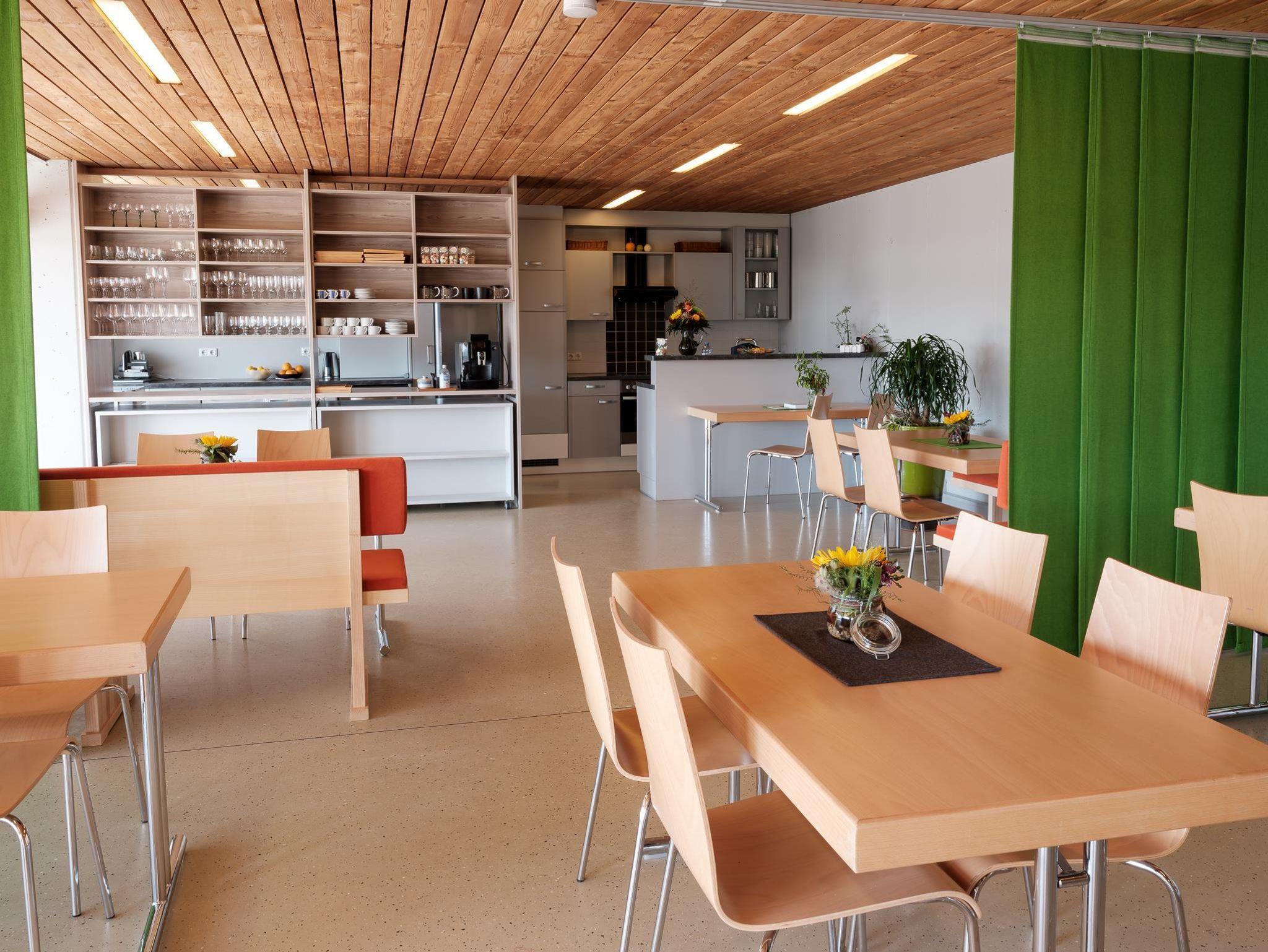 * Aufenthaltsraum mit 60 Sitzplätzen, ausgestatteter Küche (E-Herd, Geschirrspüler, Kühl- und Gefrierschränke, Mikrowelle, Geschirr), Fernseher, Tischtennistisch, Tischfußball zur freien Benützung.