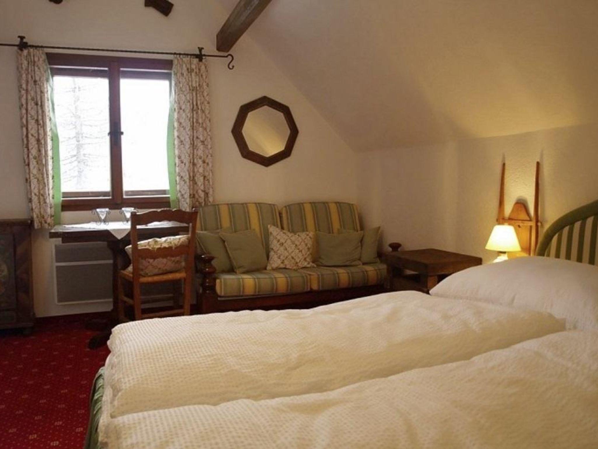 Ein großer Vorraum mit Sitzgelegenheit und ausreichend Stauraum, ein großzügiges Schlafzimmer mit Doppelbett, gemütliche Sitzecke und SAT-TV, ein Schlafzimmer mit 2 Etagenbetten (für 4 Personen), ein Badezimmer mit WC, eine Stube mit voll ausgestatteter Küche (Geschirrspüler,...) das daneben gelegene Wohnzimmer mit gemütlicher Wohnlandschaft (ausziehbar), SAT-TV, Telefon, Radio mit CD und Kassette und diverse Brettspiele. Der leicht bedienbare Kachelofen mit Absperrautomatik bietet wohlige Wärme. Auch ein Wellnessbereich mit Inrarotkabine, Dusche und WC, sowie eine Waschmaschine machen die Hütte komplett.