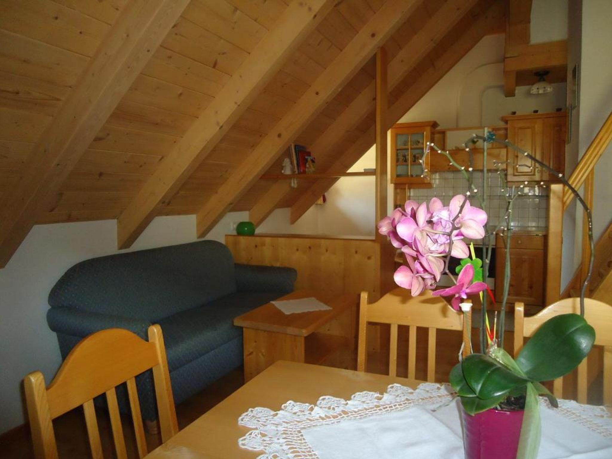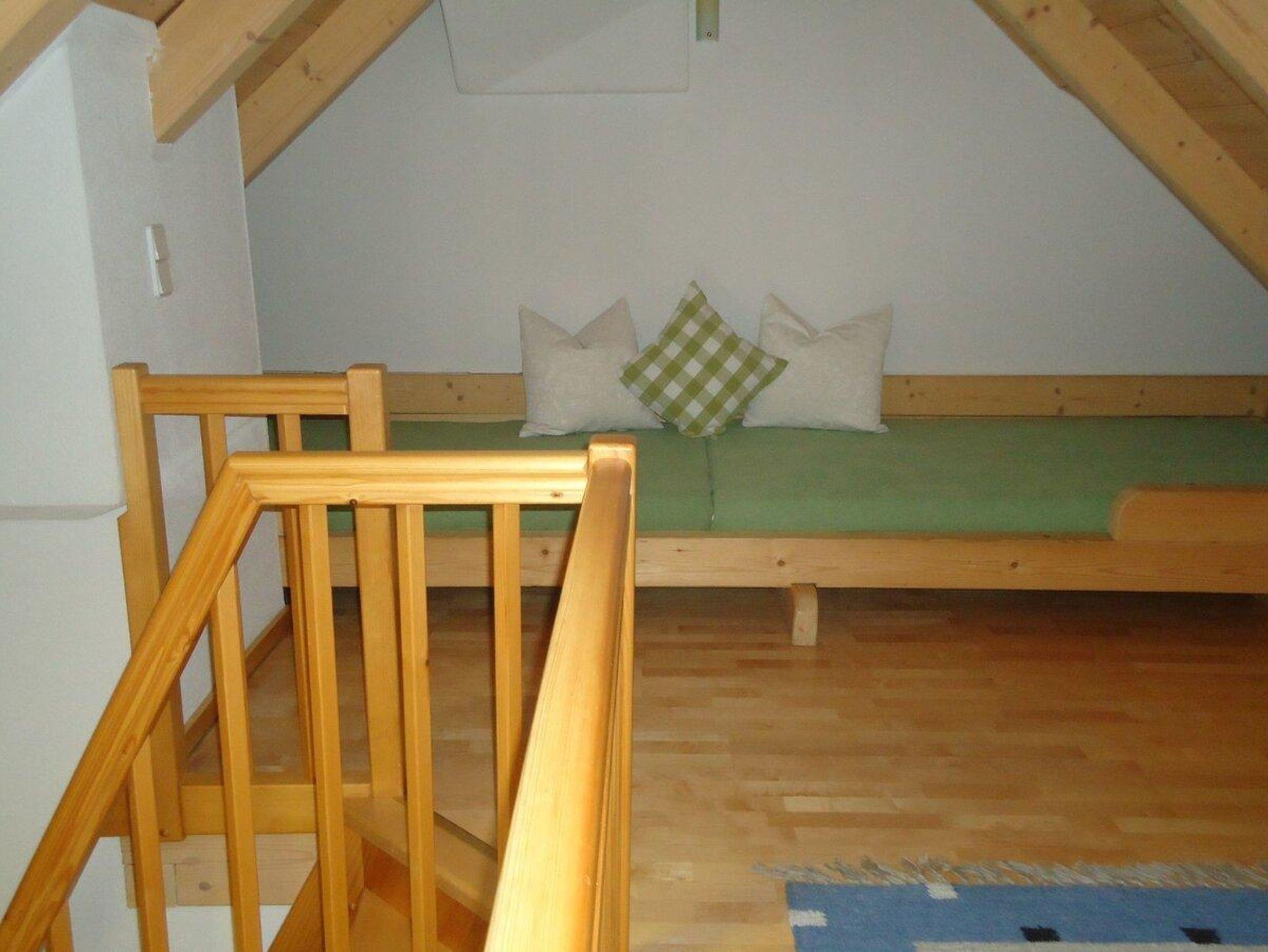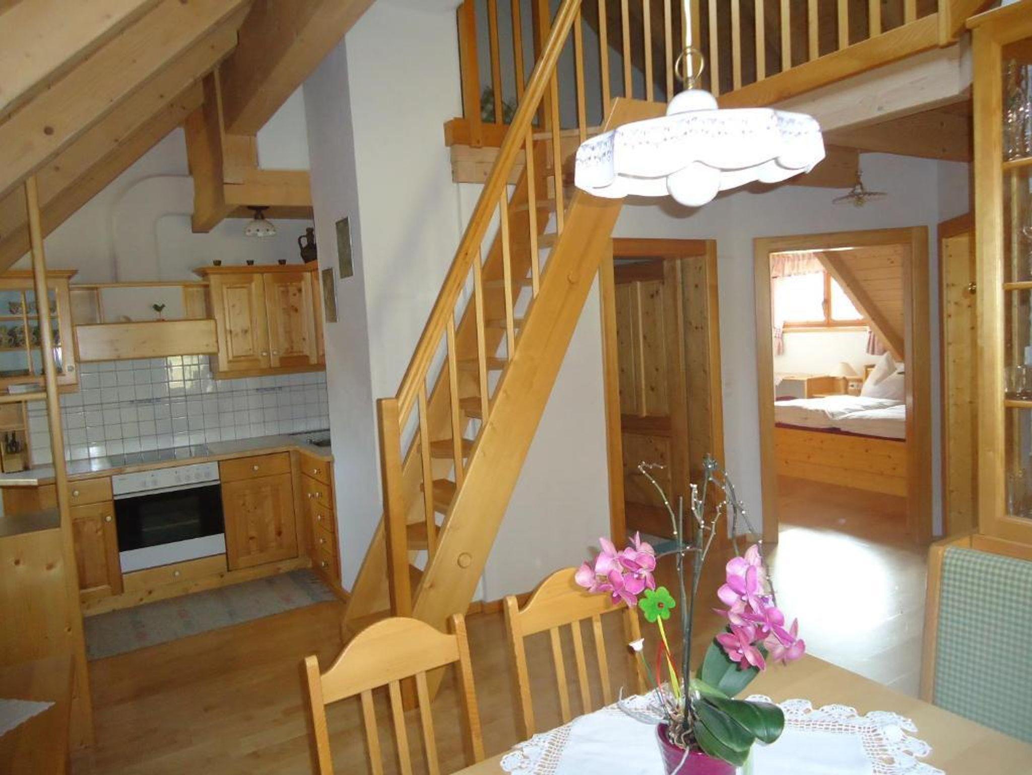 Die liebevoll mit Holzmöbeln eingerichtete Ferienwohnung Himmelschlüssel bietet auf zwei Ebenen Platz für 2 bis 6 Personen. Zwei separate Schlafzimmer mit einem Doppelbett, ein großzügiger Wohnraum mit Sat-TV, gemütlicher Essecke und voll ausgestatteter Küche mit Geschirrspüler sorgen für Komfort. Zwei zusätzliche Betten auf der offenen Galerie machen die Wohnung auch für Familien ideal.