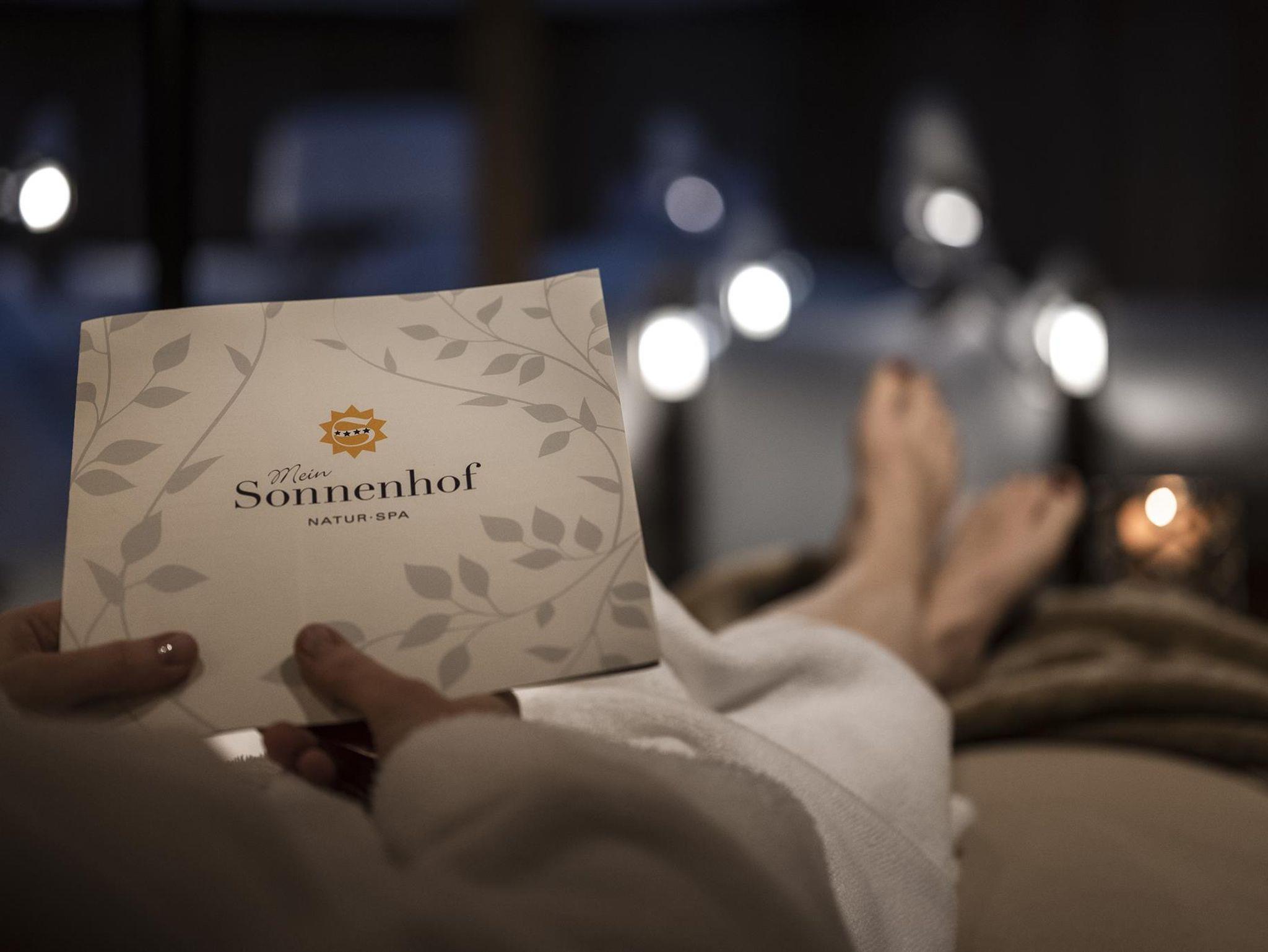 Im Einklang mit der alpinen Natur erholen Sie sich im großzügigen & mit viel Liebe zum Detail gestalteten NATUR SPA Wellnessbereich. Entspannen Sie umgeben von heimischen Hölzern, natürlichen Stoffen und vielen liebevollen Details – Der Sonnenhof NATUR SPA mit Finnischer Außensauna, Kräuter-Biosauna, Meersalz-Infrarotkabine & Aroma-Dampfbad. Gemütliche Ruheräume mit warmen Wasserbetten und Kuschelecken laden zum Entspannen ein! Der Sonnenhof bietet eine feine Auswahl ausgesuchter Massageanwendungen.