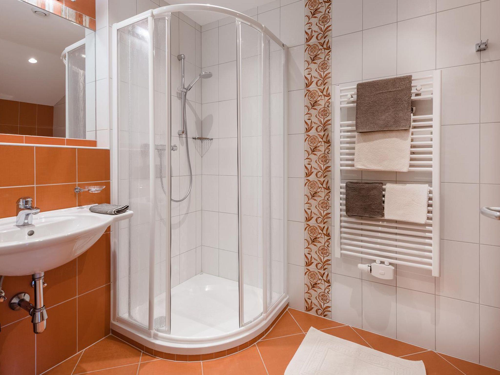 • modernes Badezimmer mit barrierefreier Dusche und WC (Fön, Kosmetikspiegel, Radio)