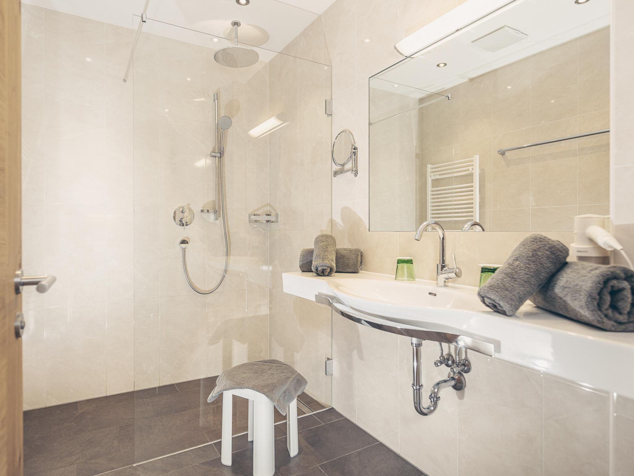 • Badezimmer mit Dusche, teils separates WC