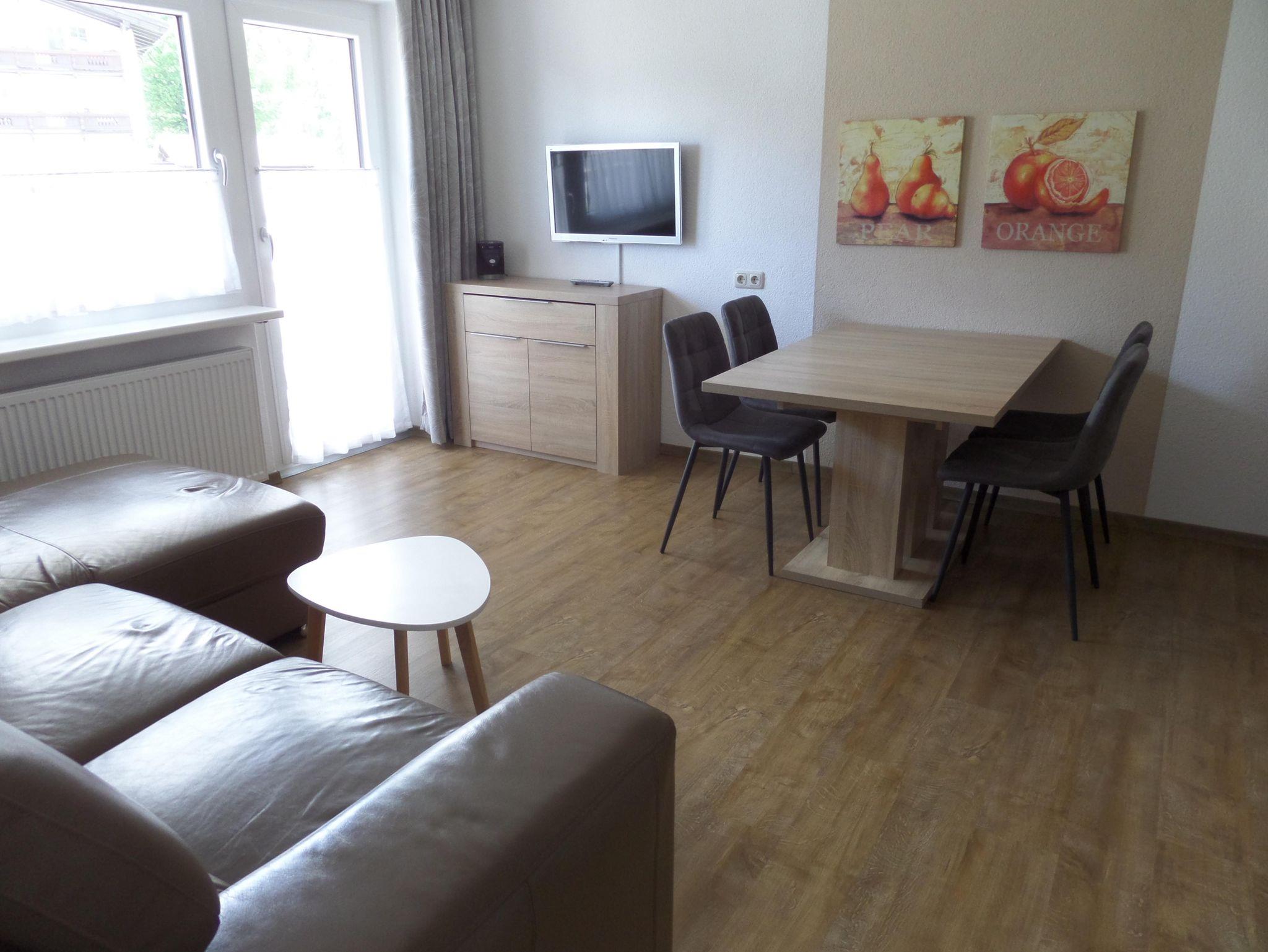 In der Wohnküche ist ein großer Esstisch und eine Wohnecke sorgt für Gemütlichkeit. Der Balkon nach Süden ist mit Gartentisch und Stühlen ausgerüstet.