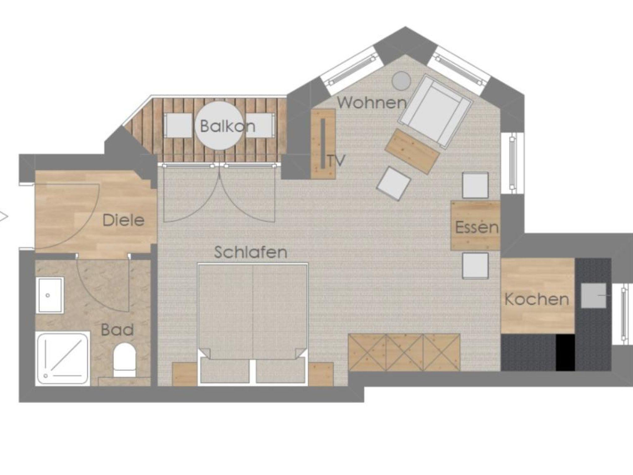 Kuscheliges 1-Zimmerappartement mit Küchenblock, Dusche & WC, Föhn, Flat-TV, Radio, Telefon, Safe und WLAN, kleiner Balkon