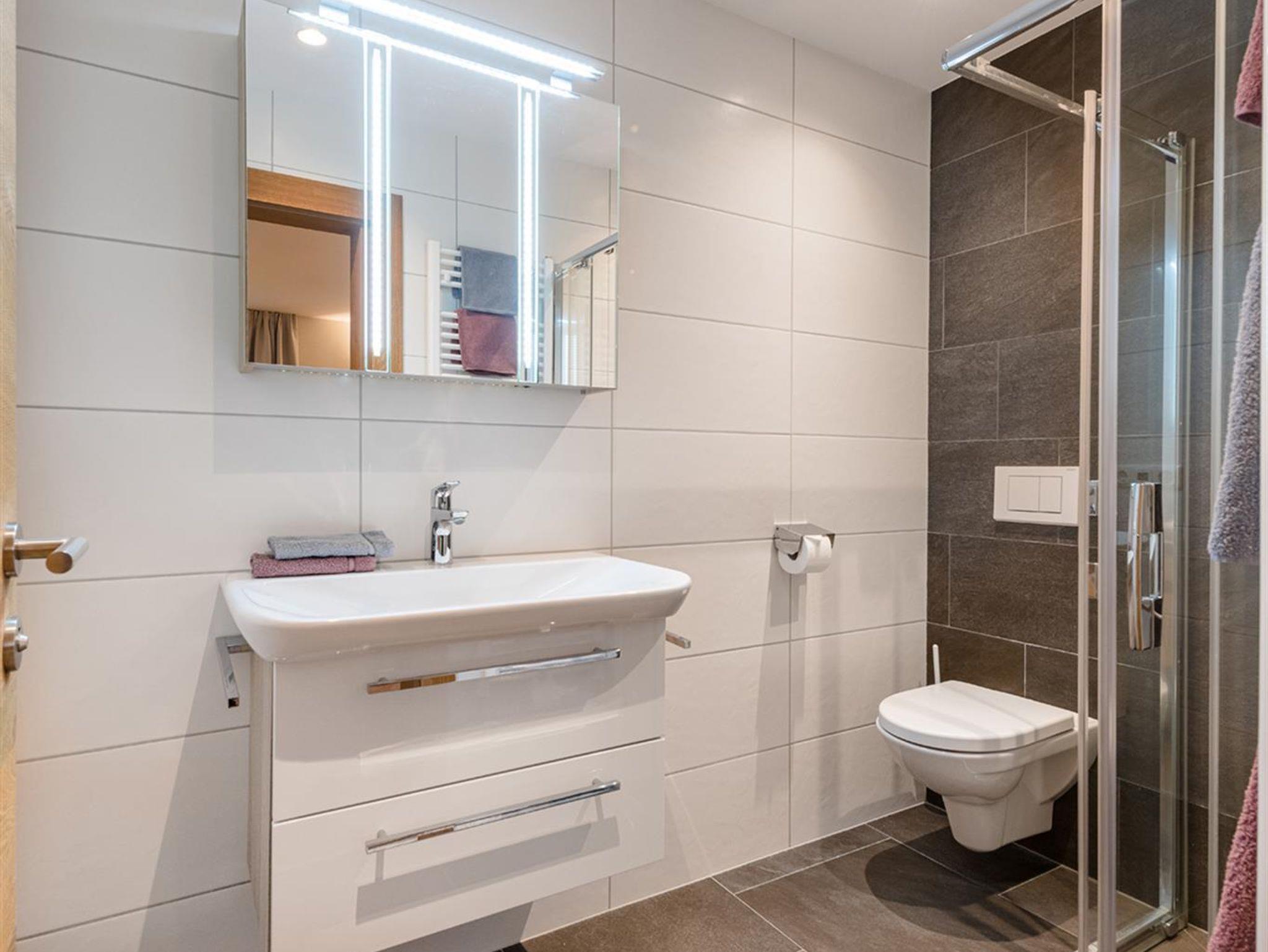 • modernes Badezimmer mit barrierefreier Dusche und WC (Fön, Kosmetikspiegel, Radio)