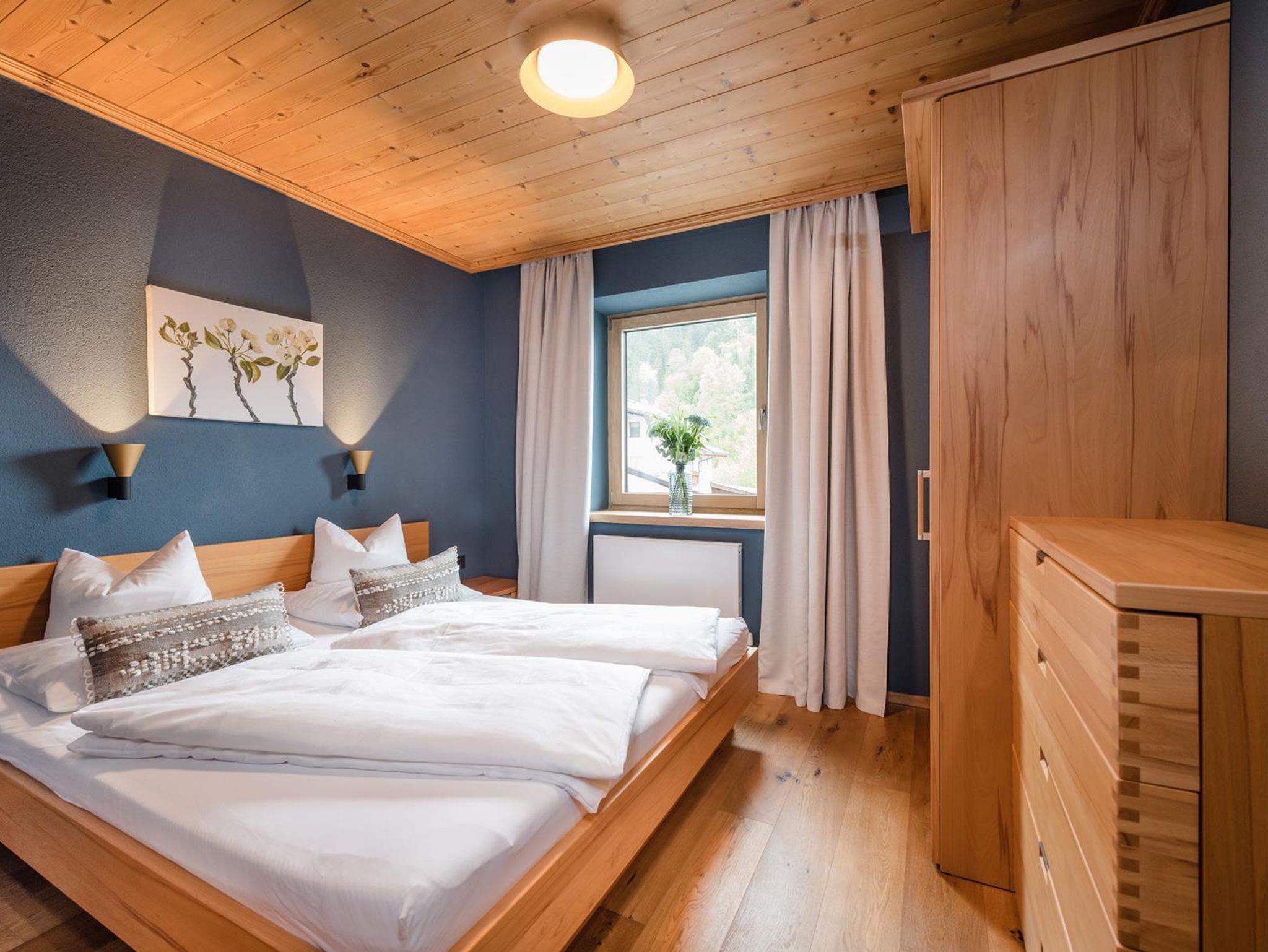 1 Schlafzimmer mit Doppelbett, Eichenholzboden und Verdunkelungsvorhängen