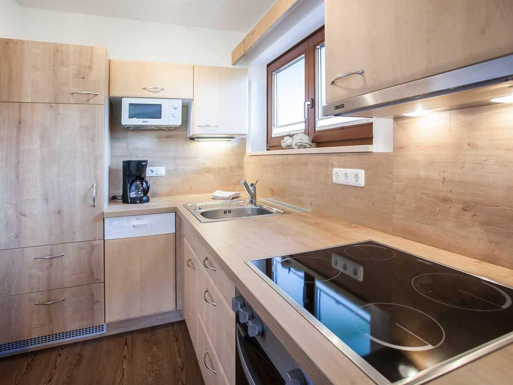 • Komplett ausgestattete Küche m. Ceranfeld, Backrohr, Kühlschrank m. kl. Gefrierfach, Geschirrspüler, Mikrowelle, Toaster