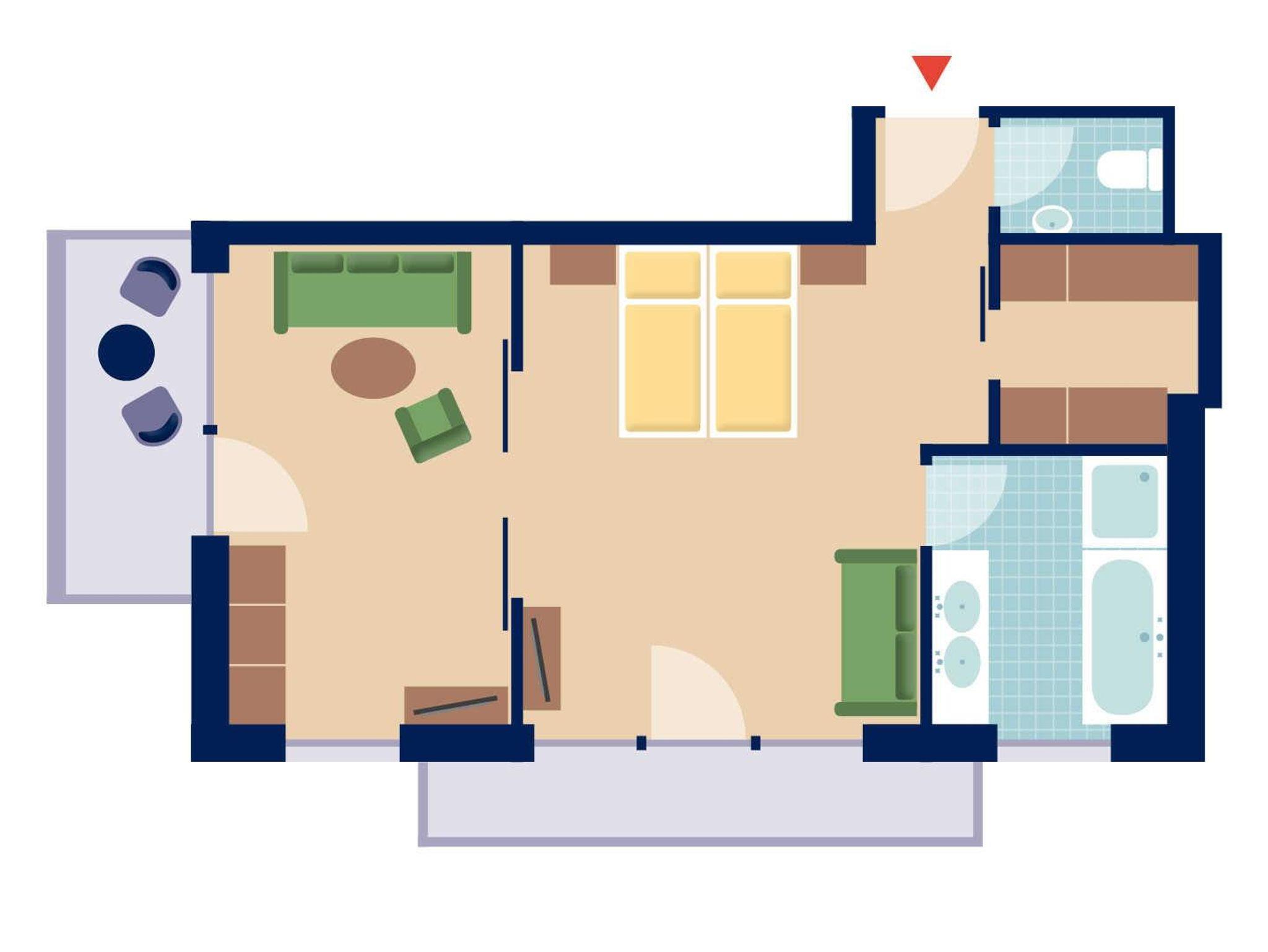 Die Loft Suite bietet einen zweiseitigen Balkon mit traumhaftem Ausblick und Liegestühlen. Wohn- und Schlafraum können durch eine Schiebetür getrennt werden.