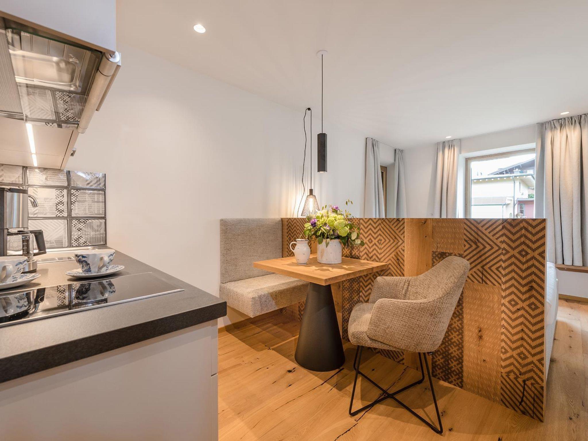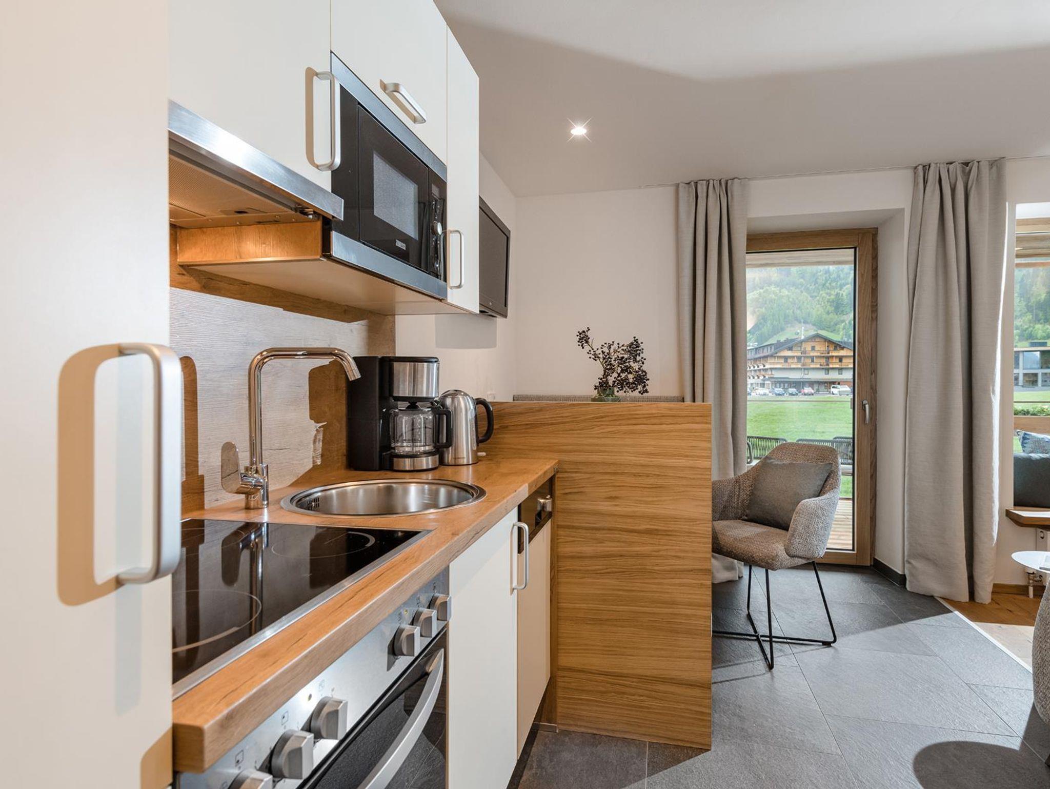 • gemütliche Wohnküche mit Wohn- und Essecke, komplett ausgestattete Küche mit 4-Platten-Cerankochfeld, Mikrowelle, Backofen, Kühlschrank mit Gefrierfach, Filterkaffeemaschine (auf Wunsch Nespresso verfügbar), Toaster, Wasserkocher, Geschirr, Besteck und Kochutensilien