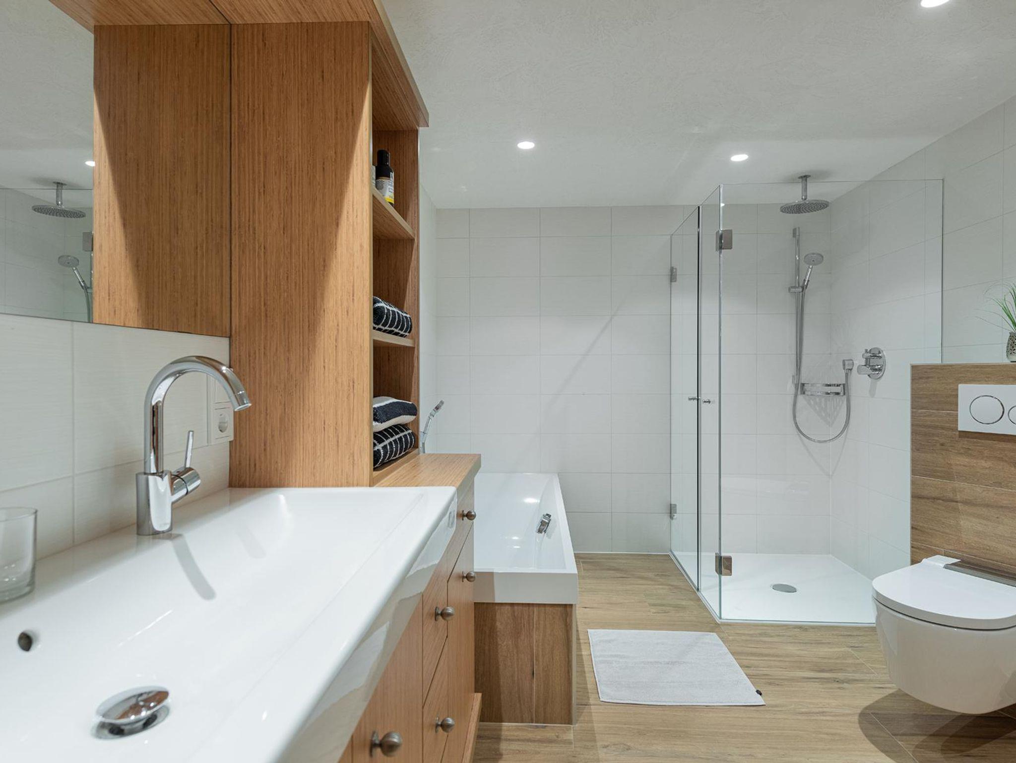 • modernes Badezimmer mit barrierefreier Dusche und WC (Fön, Kosmetikspiegel, Radio)