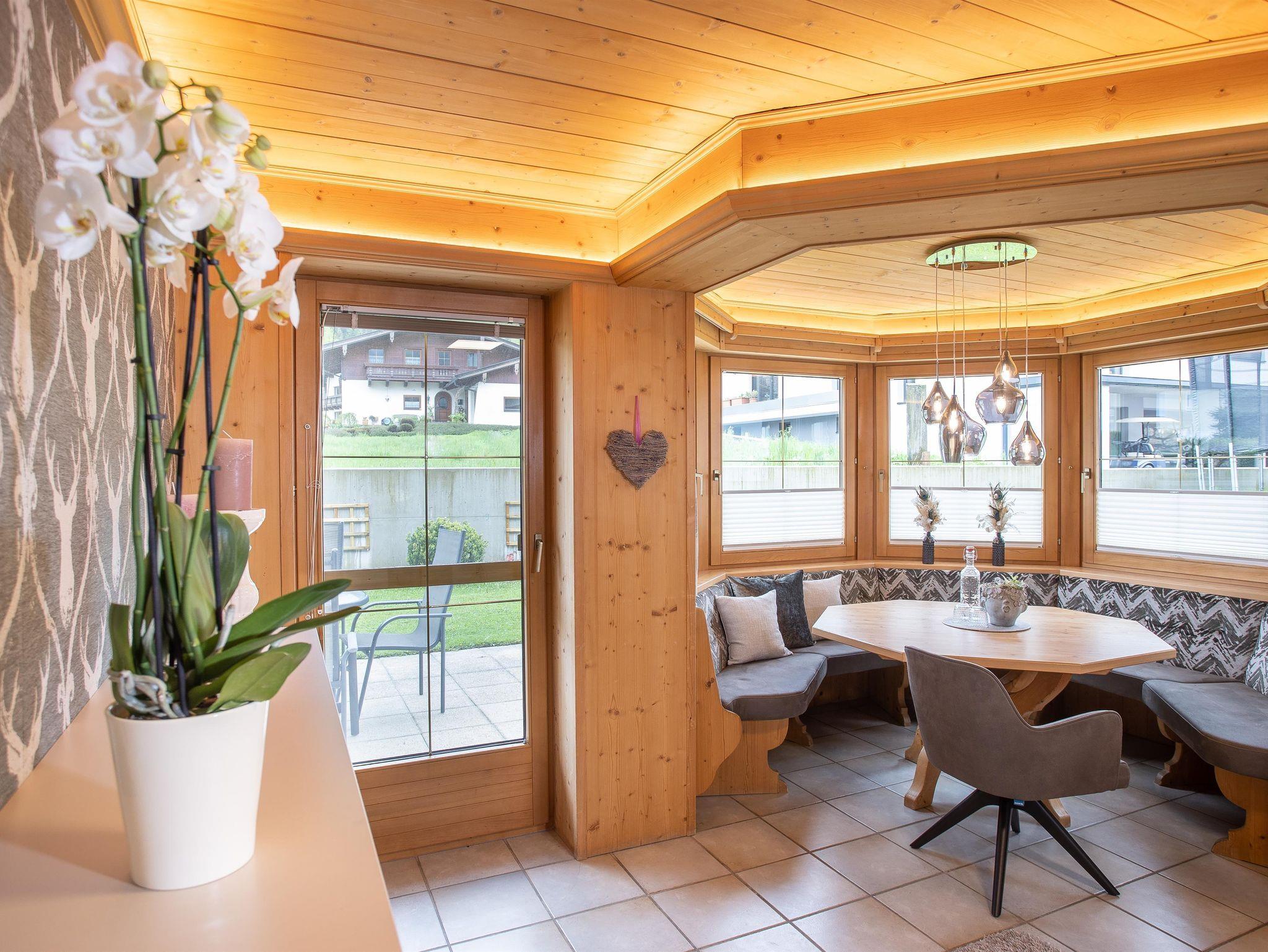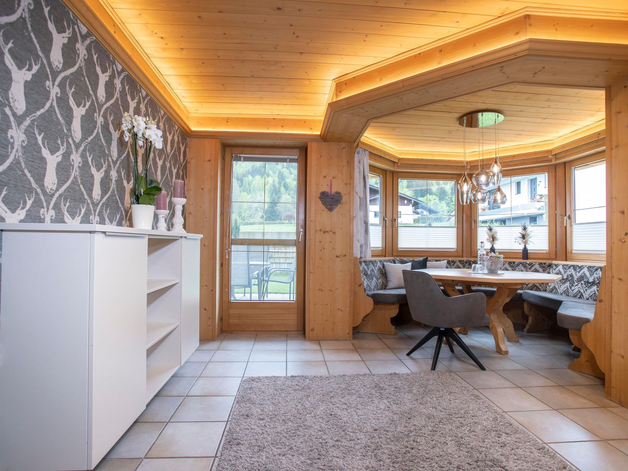 Neu renovierte Ferienwohnung für 2 bis 5 Personen im alpinen Stil mit 2 Schlafzimmern, 1 Bad mit Dusche, separater Toilette, gemütlichem Wohnraum mit Sitzgruppe und Kachelofen, komplett ausgestatteter Küche mit Panorama-Essecke sowie einer Garten-Terrasse.