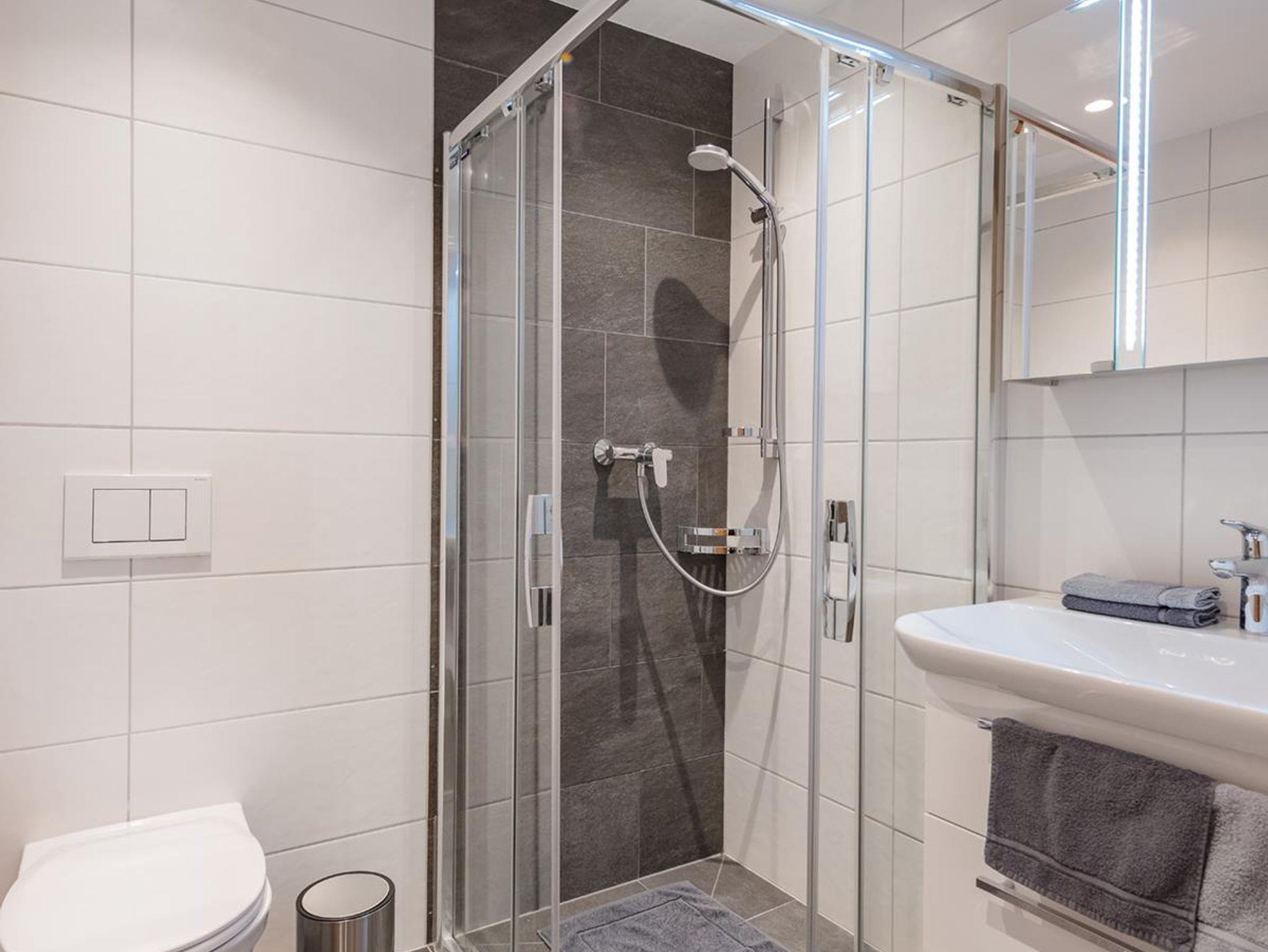 • modernes Badezimmer mit barrierefreier Dusche und WC (Fön, Kosmetikspiegel, Radio)
