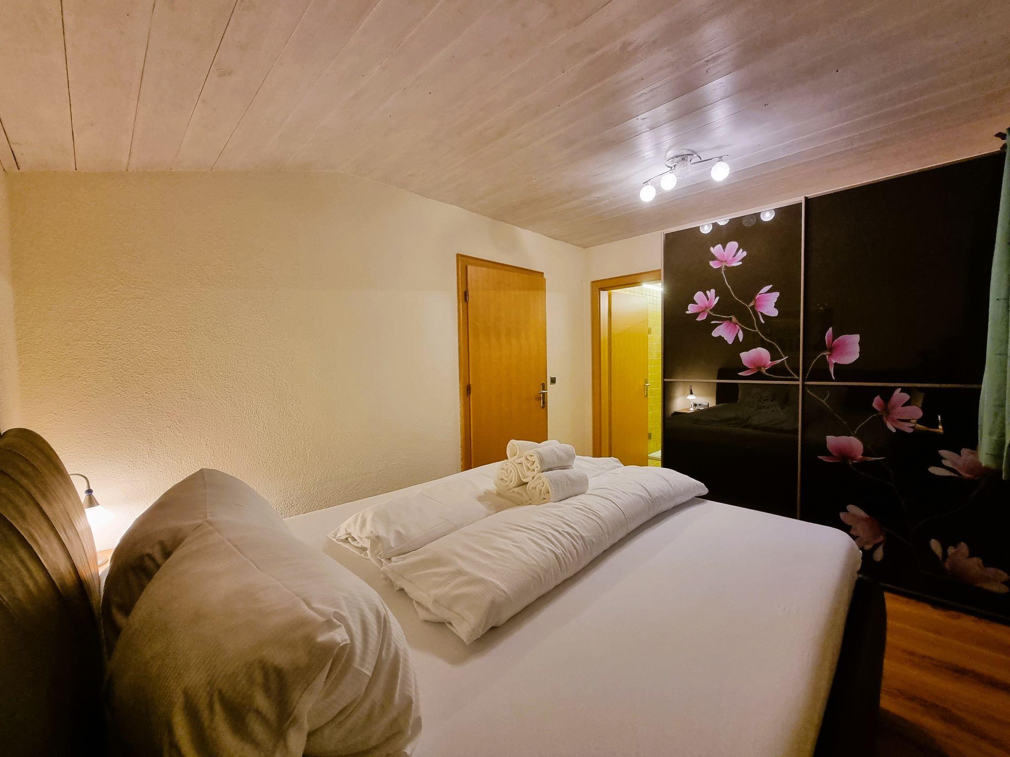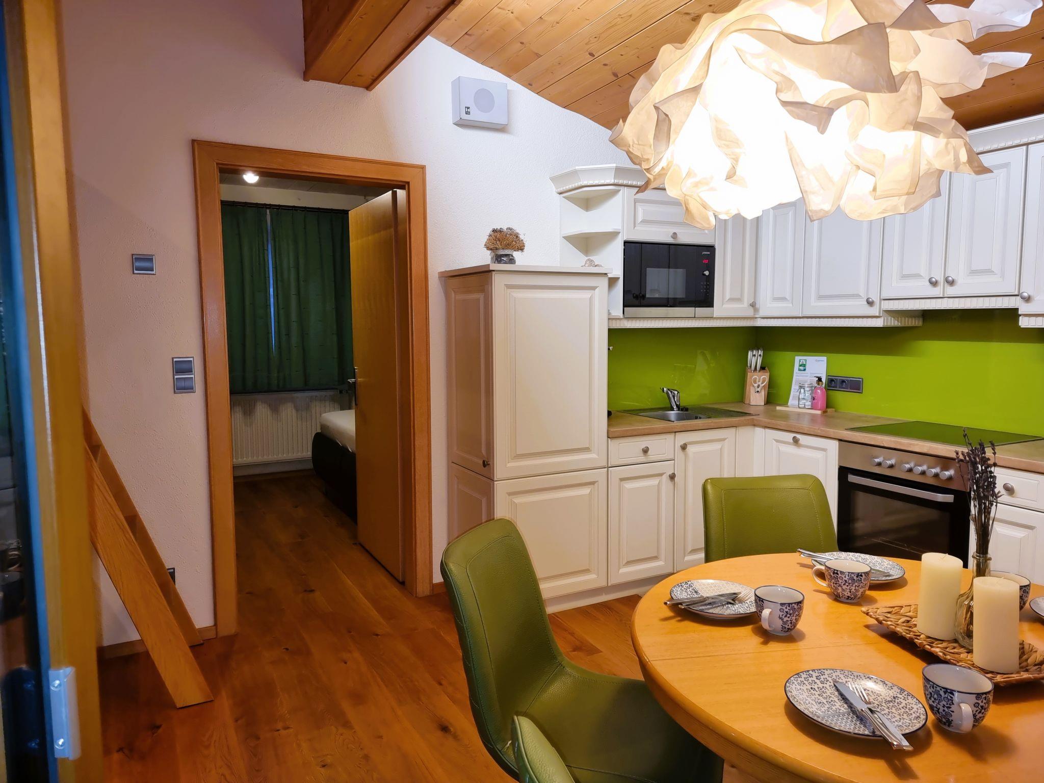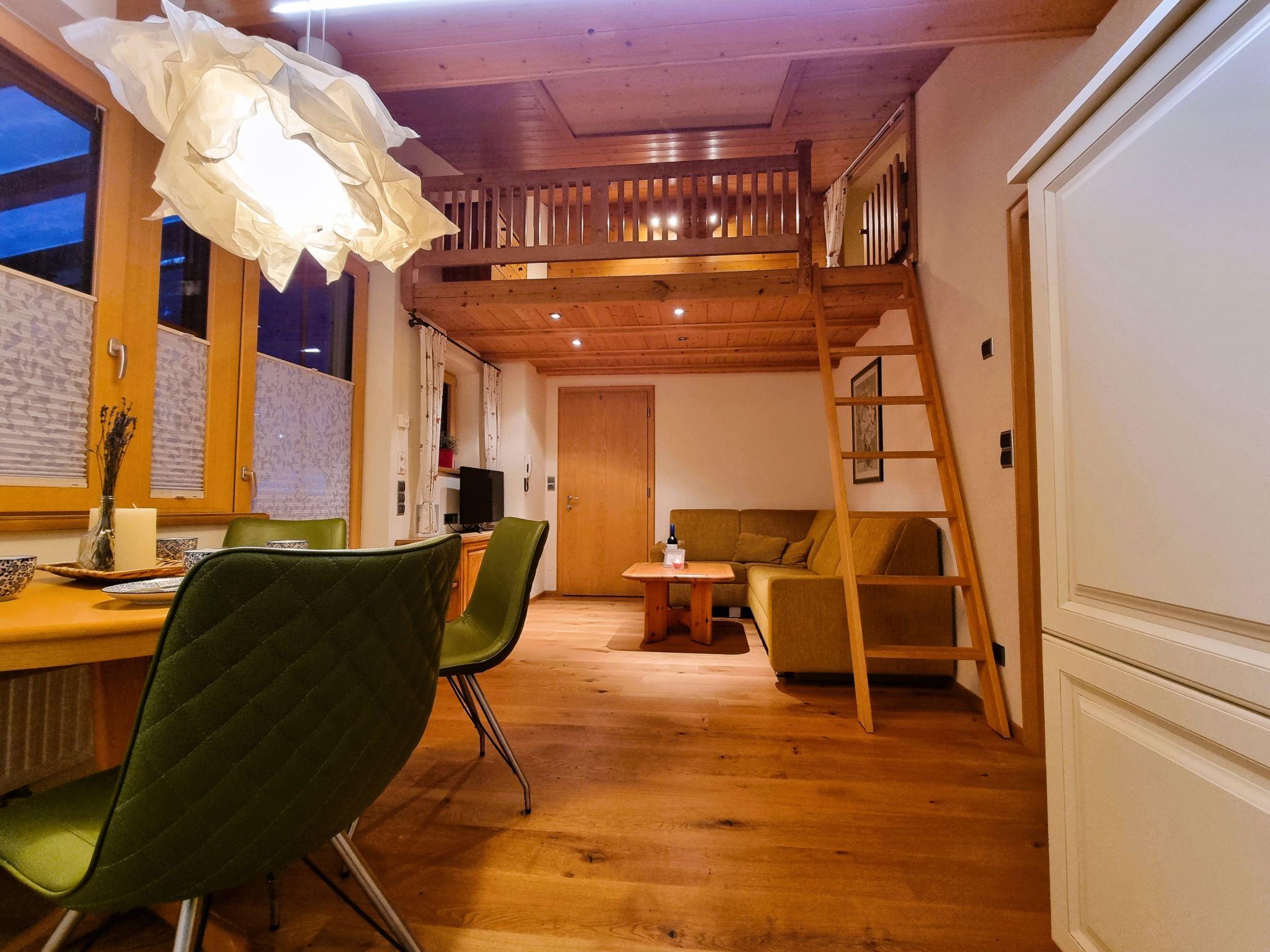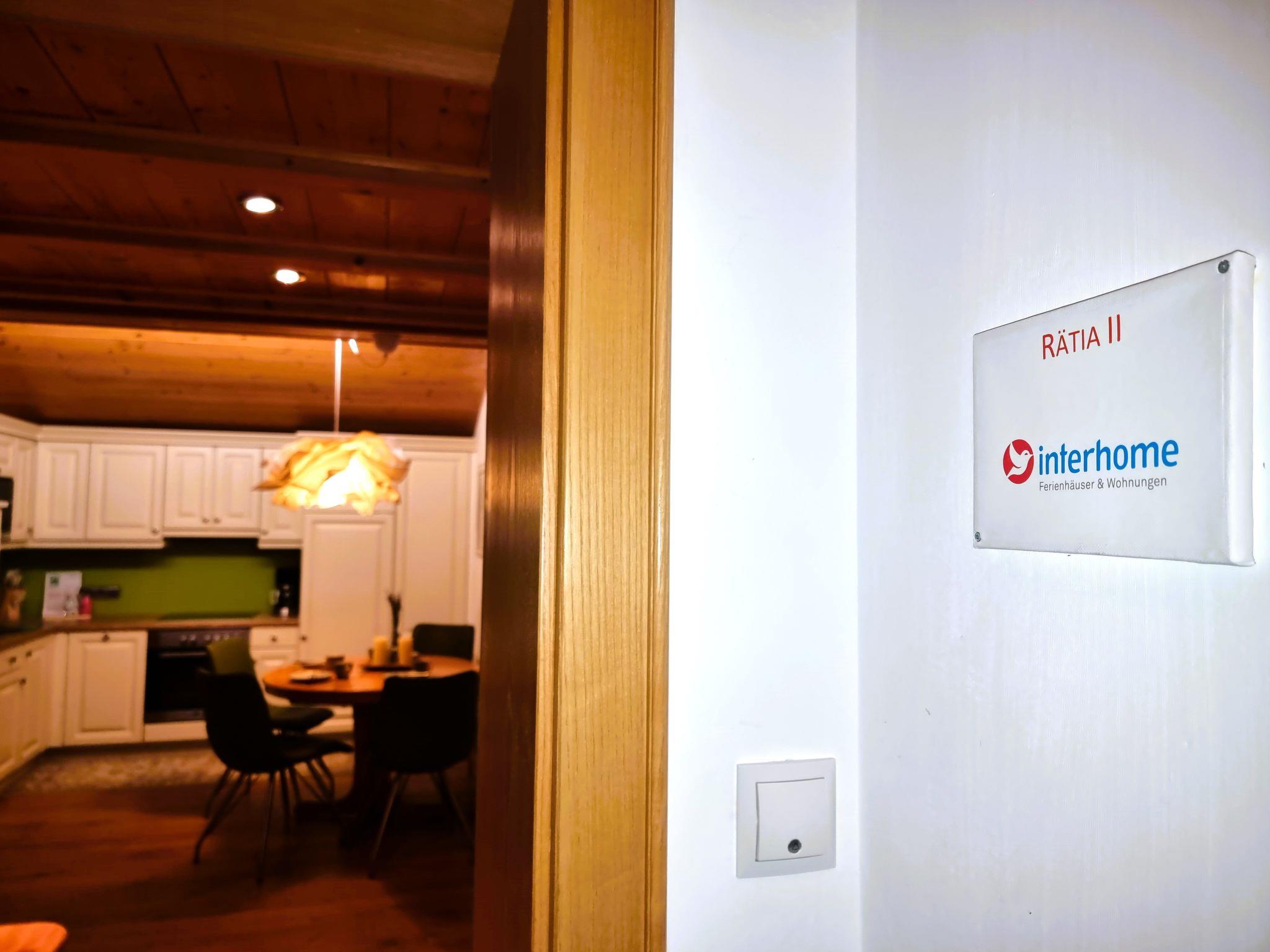 "Rätia II", 2-room apartment 45 m2, south-east facing position. 1 double bedroom. Kitchen-/living room (oven, dishwasher, 4 ceramic glass hob hotplates, kettle, microwave, electric coffee machine, Capsules for coffee machine (Nespresso) extra) with 1 sofabed and cable TV. Shower/WC. Heating. Large terrace. Terrace furniture, balcony furniture, deck chairs. Very beautiful view of the mountains, the garden, the resort and the forest. Parking (1 car). In the living room there is another sleeping possibility on the gallery (160x200). Alternatively, the couch can be pulled out.