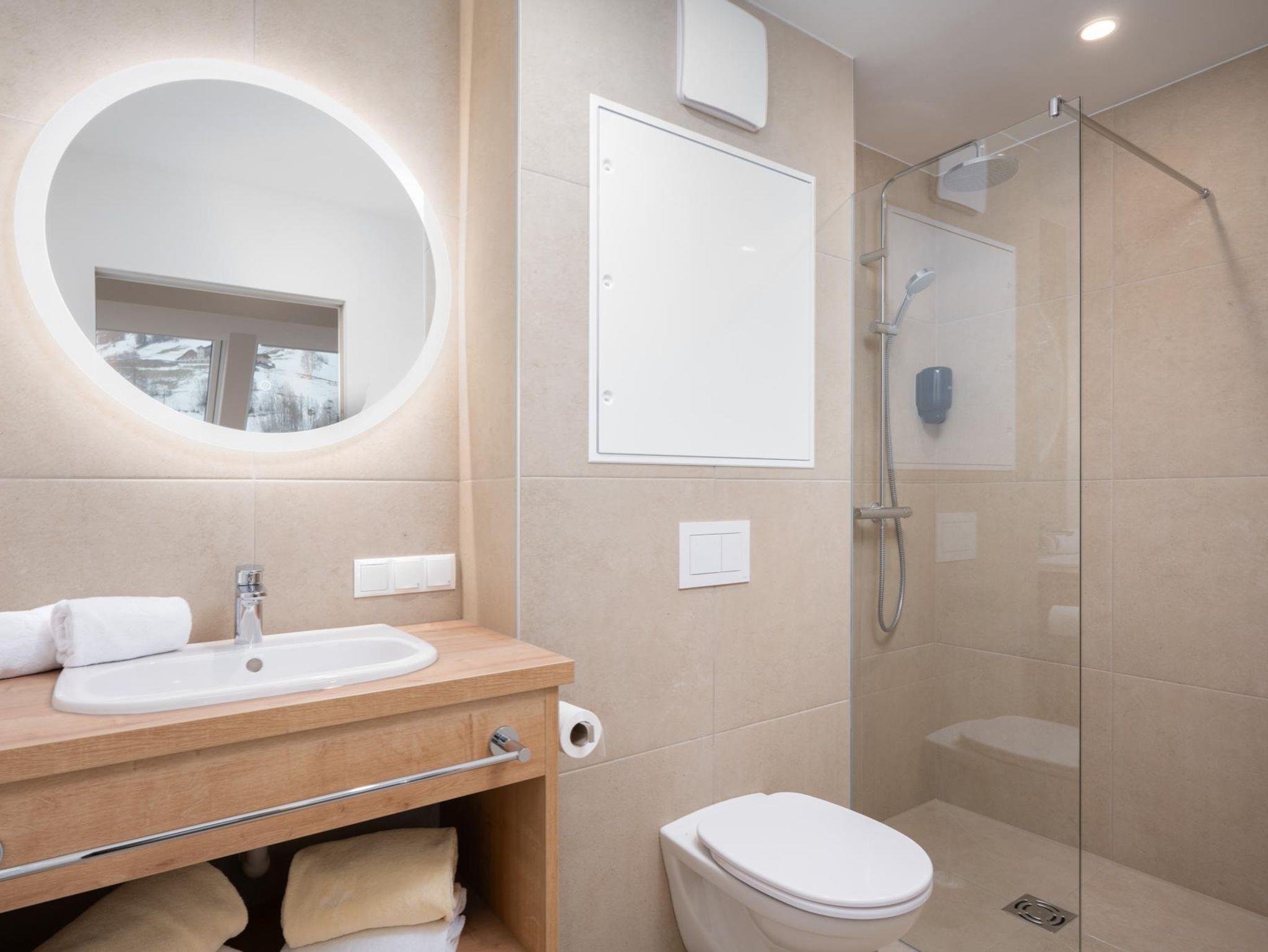 The apartments are beautiful and clean, perfectly equipped. There is a ski storage room in the house with boots heater, very useful. Parking garage is under the building, very convenient to reach the room, parking spots are spacious.