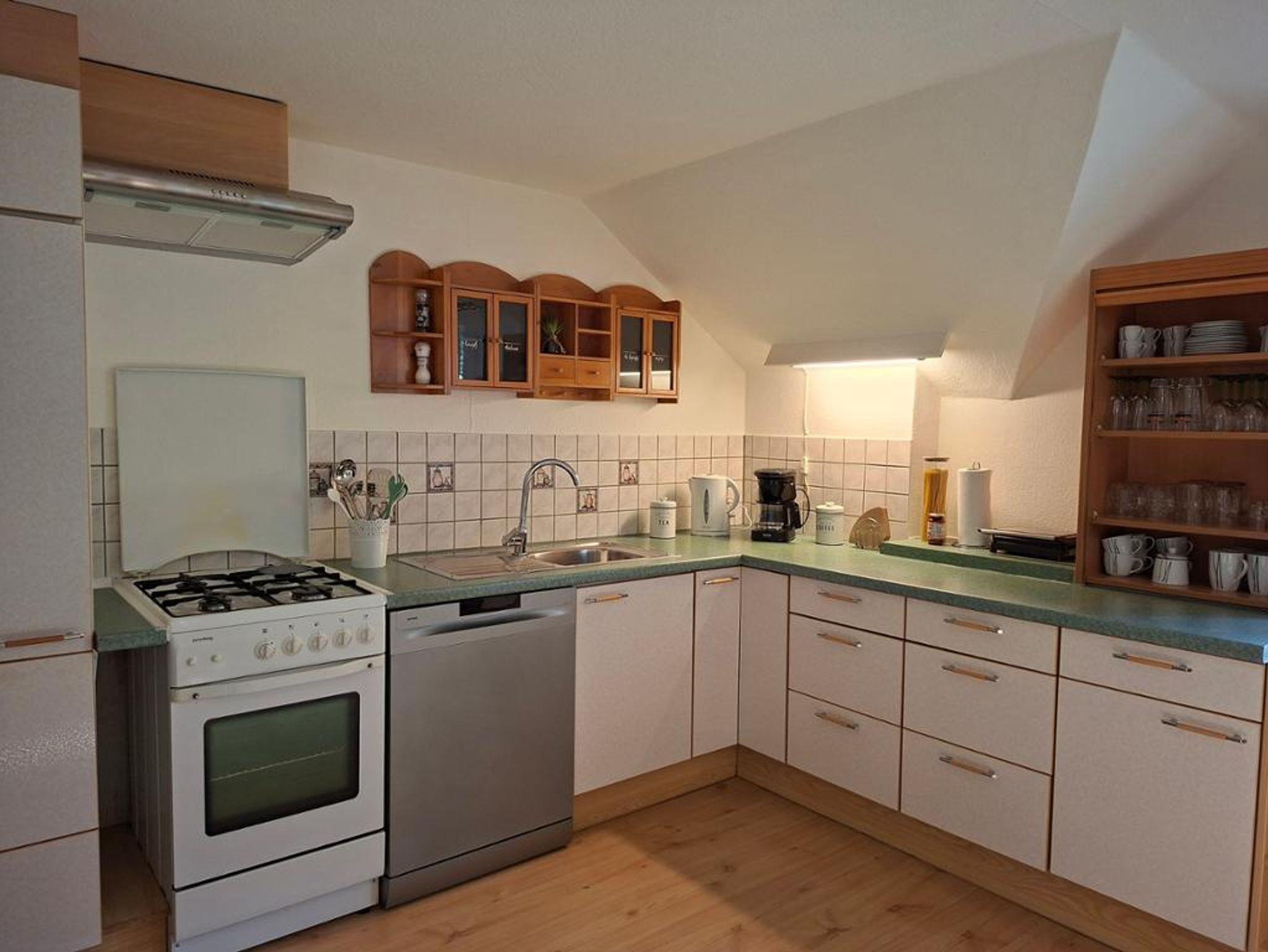 Die geräumige Küche ist mit Gasherd, Kühlschrank, Geschirrspüler, Mikrowelle, Toaster, Kaffeemaschine und Wasserkocher komplett ausgestattet. Für einen gelungen Start in den Urlaub stehen Tee, Kaffee und Kaffeefilter für Sie bereit.