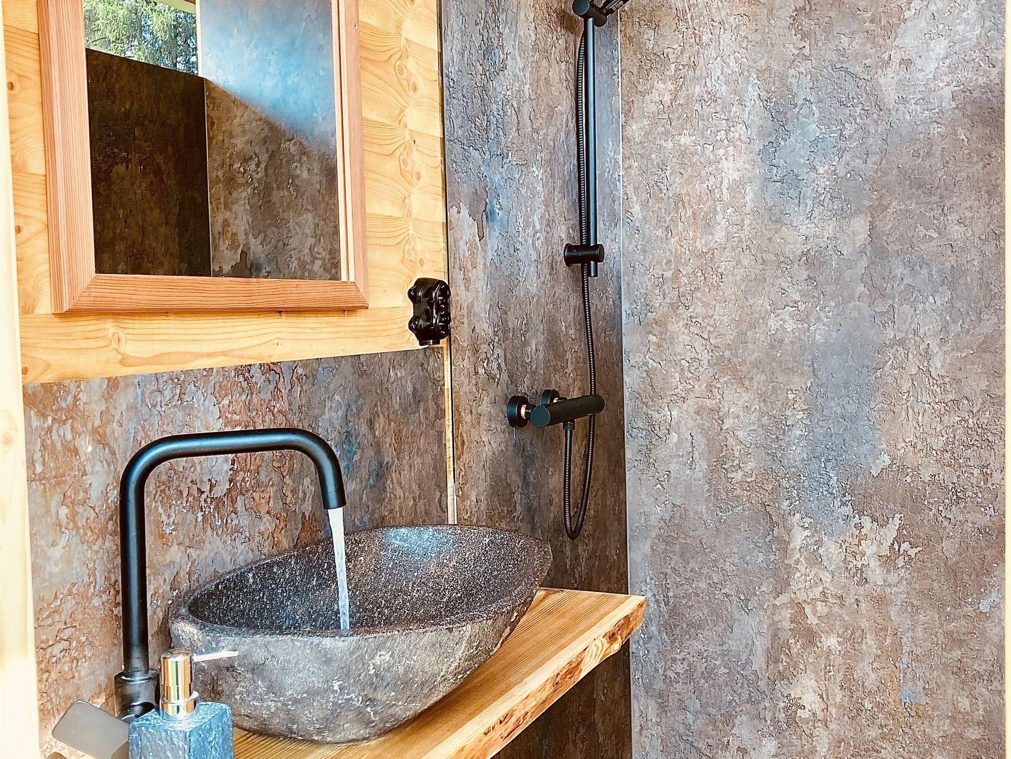 Panorama-Sauna und Holzbadefass mit erfrischendem Quellwasser.