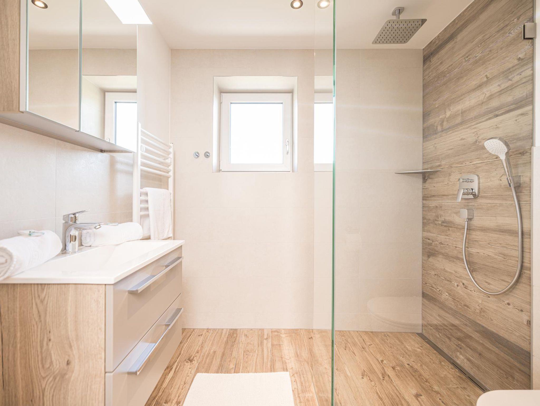 Das moderne Badezimmer verfügt über eine Regendusche, Waschtisch mit Spiegel, WC, Föhn und Handtücher.