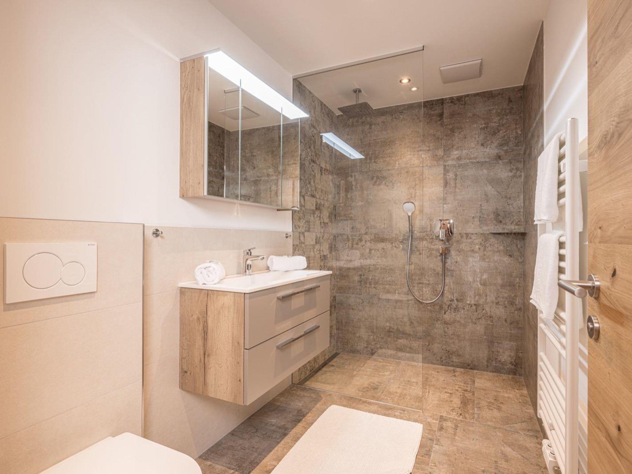 Das moderne Badezimmer verfügt über eine Regendusche, Waschtisch mit Spiegel, WC, Föhn und Handtücher.